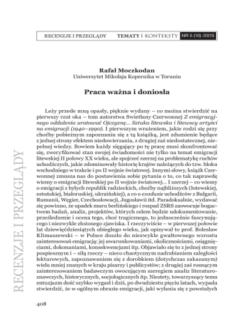 RECENZJE I PRZEGLĄDY TEMATY I KONTEKSTY NR 5 (10) /2015 Rafał Moczkodan Uniwersytet Mikołaja Kopernika w Toruniu RECENZJE I PRZEGLĄDY Praca ważna i doniosła Leży przede mną opasły, pięknie wydany – co można stwierdzić na pierwszy rzut oka – tom autorstwa Swietłany Czerwonnej Z emigracyjnego oddalenia uratować Ojczyznę… Sztuka litewska i litewscy artyści na emigracji (1940–1990). I pierwszym wrażeniem, jakie rodzi się przy choćby pobieżnym zapoznaniu się z tą książką, jest zdumienie będące z jednej strony efektem niedowierzania, z drugiej zaś niedostatecznej, niepełnej wiedzy. Bowiem każdy sięgający po tę pracę musi skonfrontować się, zweryfikować stan swojej świadomości nie tylko na temat emigracji litewskiej II połowy XX wieku, ale spojrzeć szerzej na problematykę ruchów uchodźczych, jakie zdominowały historię krajów należących do tzw. bloku wschodniego w trakcie i po II wojnie światowej. Innymi słowy, książk Czerwonnej zmusza nas do postawienia sobie pytania o to, co tak naprawdę wiemy o emigracji litewskiej po II wojnie światowej… I szerzej – co wiemy o emigracji z byłych republik radzieckich, choćby najbliższych (łotewskiej, estońskiej, białoruskiej, ukraińskiej), a co o exodusie uchodźców z Bułgarii, Rumunii, Węgier, Czechosłowacji, Jugosławii itd. Paradoksalnie, wydawać się powinno, że upadek muru berlińskiego i rozpad ZSRS zaowocuje bogactwem badań, analiz, projektów, których celem będzie udokumentowanie, prześledzenie i ocena tego, choć tragicznego, to jednocześnie fascynującego i niezwykle złożonego zjawiska. I rzeczywiście – w pierwszej połowie lat dziewięćdziesiątych ubiegłego wieku, jak opisywał to prof. Bolesław Klimaszewski – w Polsce doszło do niezwykle gwałtownego wzrostu zainteresowań emigracją: jej uwarunkowaniami, okolicznościami, osiągnięciami, dokonaniami, konsekwencjami itp. Objawiało się to z jednej strony pospiesznym i – siłą rzeczy – nieco chaotycznym nadrabianiem zaległości lekturowych, zapoznawaniem się z dorobkiem (dotychczas zakazanym) wielu mniej znanych w kraju pisarzy i publicystów; z drugiej zaś rosnącym zainteresowaniem badawczym owocującym szeregiem analiz literaturoznawczych, historycznych, socjologicznych itp. Niestety, towarzyszący temu entuzjazm dość szybko wygasł i dziś, po dwudziestu pięciu latach, wypada stwierdzić, że w ogólnym obrazie emigracji, jaki wyłania się z powstałych 408 Praca ważna i doniosła w tym czasie prac badawczych, bardzo wiele miejsc nie zostało jeszcze dostatecznie spenetrowanych, szereg interesujących zjawisk dostrzeżonych, zapomnianych artystów (i nie tylko) przypomnianych. A jeżeli odnieść to do perspektywy szerszej – zainteresowania badaczy polskich emigracjami z krajów i republik ościennych oraz państw odleglejszych, lecz połączonych wspólnym doświadczeniem pozostawania w strefie wpływów sowieckich, to tu sytuacja przedstawia się jeszcze gorzej. Można by rzec, że na olbrzymiej, białej mapie Europy Środkowej i Wschodniej tylko niektóre miejsca i obszary zostały rozpoznane. Rzecz jasna, nie jest to przypadłość jedynie polska, dotyczy ona również badaczy z wymienionych państw, którzy także zajęci rejestrowaniem i badaniem dokonań rodzimych uchodźców, dużo mniej uwagi poświęcają emigrującym z innych krajów. Mówiąc ogólnie, ten problem z badaniami nad emigracją sprowadzić można do stwierdzenia, że (pomijając względy organizacyjne, możliwości finansowe itp. problemy, z którymi boryka się wielu badaczy nie tylko tej problematyki) starając się pospiesznie sporządzać inwentarze, dokumentować relacje, gromadzić dane i na ich podstawie prowadzić badania nad twórcami, naukowcami, politykami itd. z danego kręgu narodowo-językowego, nie udało się zbudować zbyt wielu mostów łączących badaczy z różnych krajów, a tym samym snuć refleksji nad kontaktami, współpracą, odmiennościami i cechami łączącymi poszczególne emigracje narodowe. A nawet jeżeli nie sięgać tak daleko, tylko powtórzyć pytanie zadane na początku, i zastanowić się nad poziomem wiedzy o emigracji innej niż rodzima, to i tu wiele pozostaje do zrobienia, wyjaśnienia, czy choćby… przetłumaczenia. Aby daleko nie szukać potwierdzenia tego stanu rzeczy, wystarczy wspomnieć, że praca, która skłoniła mnie do sformułowania powyższych uwag, została wydana w języku rosyjskim w Moskwie, co sprawia, że jej dostępność i znajomość w Polsce zapewne nie będzie zbyt duża, a na tłumaczenie zapewne będziemy czekać dość długo. Sam pełen winy w opisanym zakresie przystępowałem do lektury książki Swietłany Czerwonnej z zaciekawieniem i dużymi oczekiwaniami. Dodam od razu, że się nie zawiodłem. Praca ma charakter syntezy, w której odnotowano i zaprezentowano 230 twórców litewskich, głównie malarzy i grafików. Tu na szczególną uwagę zasługuje Słownik litewskich twórców przebywających na emigracji w latach 1940–1980 (s. 469–538), w którym odnajdujemy nie tylko syntetyczne biogramy poszczególnych artystów, z wymienieniem ich najważniejszych dokonań, ale który stanowi także rodzaj indeksu. Pozwala on, z jednej strony, szybko odnaleźć uwagi dotyczące dokonań artystycznych każdego z twórców w tekście głównym pracy, a z drugiej zorientować się, jaką wagę i znaczenie danej postaci i jej dorobkowi przypisała autorka pracy. A skoro zacząłem już od tego aneksu, to dodać należy, że praca opatrzona została dodatkowo obszerną bibliografią (s. 539–552) obejmującą wszystkie pozycje książkowe dotyczące omawianej problematyki wydane do 2011 roku, znaczną liczbę katalogów wystaw 409 Rafał Moczkodan organizowanych przez lub dotyczących twórców wymienionych w książce, a także szeroki wybór ogłaszanych w czasopismach artykułów dotyczących emigracji litewskiej (ze szczególnym uwzg