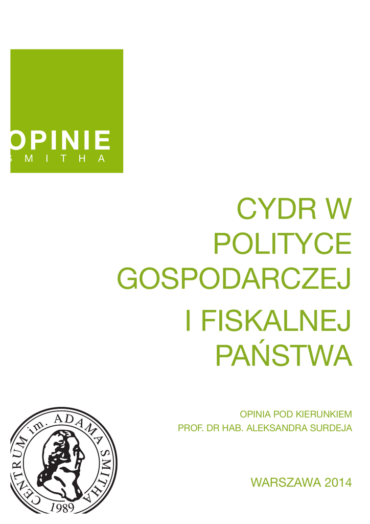 ! OPIN IE S M I T H A CYDR W POLITYCE GOSPODARCZEJ I FISKALNEJ PAŃSTWA ! OPINIA POD KIERUNKIEM PROF. DR HAB. ALEKSANDRA SURDEJA !! !! WARSZAWA 2014!!! !! CYDR W POLITYCE GOSPODARCZEJ I FISKALNEJ PAŃSTWA Warszawa 2014 ! ! Cydr w polityce gospodarczej i fiskalnej państwa. Opinia Centrum im. Adama Smitha. Copyright © Centrum im. Adama Smitha - Pierwszy Niezależny Instytut w Polsce, 2014 Wydawca Centrum im. Adama Smitha ul. Bednarska 16, 00-321 Warszawa tel.: 22 - 8284707 e-mail: [email protected] facebook.com/centrumadamasmitha Korekta Bogusława Jędrasik Skład „Radon” Radosław Kierełowicz vel Kieryłowicz ! ! ! ! ISBN&978&83&86885&53&4! Cydr w polityce gospodarczej I fiskalnej państwa Cydr w polityce gospodarczej i fiskalnej państwa Z ekonomicznego danego roku budżetowego wiąże się zawsze punktu widzenia daniny publiczne (podatki i opłaty) powinny być źródłem finansowania dóbr publicznych, których społeczeństwo potrzebuje, a które nie są z ryzykiem politycznym i jest społecznie niepopularne, gdyż oznacza zmniejszenie dostępności obiecanych obywatelom bezpłatnych lub subsydiowanych dóbr i usług. Każdy rząd musi dbać o uzyskanie przy- dostarczane przez rynek i nie są konsumowane indywidualnie. W każdym państwie takimi podstawowymi dobrami pu- chodów w wysokości niezbędnej dla finansowania zobowiązań, pamiętając o tym, że podstawowe pozycje przychodów budże- blicznymi są: bezpieczeństwo publiczne, sądownictwo, infrastruktura oraz rozwój nauki. Oprócz nich państwa dostarczają towych zależą od stanu koniunktury gospodarczej. Jeśli dochód krajowy brutto spada, lub nie rośnie w zakładanym tempie, to poja- także inne dobra (w tym usługi edukacyjne), które, chociaż nie są czystymi dobrami publicznymi, są finansowane ze środków wić się mogą trudności z uzyskaniem zaplanowanych przychodów, i, co się z tym wiąże, finansowaniem zobowiązań państwa. Sta- publicznych. We współczesnych państwach europejskich wydatki rządów sięgają przeciętnie bilność przychodów budżetowych jest więc warunkiem stabilności finansowania dóbr publicznych i innych wydatków państwa. 40-45% Produktu Krajowego Brutto. Wydatki powinny znaleźć pokrycie we wpływach Podstawowym źródłem finansowania współczesnych państw stają się podatki budżetowych, gdyż nadwyżka wydatków nad przychodami (deficyt budżetowy) grozi narastaniem długu publicznego. Wydatki rządów na ogół wynikają ze zobowiązań pośrednie (podatki od konsumpcji, w tym VAT i podatek akcyzowy) oraz podatek od dochodów osobistych i od nieruchomości. Na znaczeniu tracą wpływy z podatków od prawnych do finansowania i nieodpłatnego (lub częściowo odpłatnego) dostarczania obywatelom dóbr i usług. Modyfikacja, a w szczególności zmniejszenie, zapisanych przedsiębiorstw, gdyż państwa rywalizują o lokalizację w nich przedsiębiorstw poprzez obniżanie podatków (CIT), a same przedsiębiorstwa są w stanie przenosić zyski na w ustawie budżetowej wydatków w ciągu terytorium państw o niższych stawkach po- © Centrum im. Adama Smitha 1 Cydr w polityce gospodarczej I fiskalnej państwa datkowych, stosując m.in. ceny transferowe czy obciążenia z tytułu tzw. praw niematerialnych (w tym prawa do posługiwania się daną marką). Wpływy z podatków pośrednich (VAT oraz akcyzy) stanowią w Europie od 2/3 do Według danych Światowej Organizacji Zdrowia („Economist”, 21 grudnia 2013 roku) konsumpcja alkoholu w świecie ustabilizowała się na poziomie zbliżonym do poziomu z początku lat 90. Chociaż prawie połowa ludności świata jest pod wpływem religii, 3/4 przychodów podatkowych, przy czym w przypadku Polski przychody z VAT sięgają około połowy przychodów budżetowych. Zasadniczo podatki pośrednie powinny jednakowo obciążać różne grupy towarowe, które zakazują picia napojów alkoholowych, to dane międzynarodowe potwierdzają, że wyroby alkoholowe są produktami powszechnie konsumowanymi w państwach Unii Europejskiej i są silnie utrwalonym ele- tak aby nie zniekształcać wyborów konsumenta. Jednakże w przypadku Polski, a także innych państw, niektóre produkty są obciążone niższą stawką VAT (przykładowo produkty spożywcze czy do niedawna materiały mentem europejskiego stylu życia. Polska ze spożyciem w 2011 roku 9,25 litra 100-procentowego alkoholu w przeliczeniu na jednego mieszkańca zasadniczo nie odbiega od przeciętnej europejskiej (zob. Tabela 1). budowlane), inne z kolei są oprócz VAT dociążone dodatkowym podatkiem zwanym podatkiem akcyzowym. Celem akcyzy jest W ostatnich dwudziestu latach w Polsce zmieniła się struktura spożywanych napojów alkoholowych, przy czym należy odnotować ograniczenie konsumpcji niektórych dóbr ze względu na wyczerpywanie się ich rezerw bądź też szkodliwość zdrowotną. Akcyza wzrost udziału spożycia piwa (obecnie około 56% ze spadkiem znaczenia napojów spirytusowych (około 35%). stała się ważnym źródłem przychodów budżetu państwa i nakładana jest na importowane surowce energetyczne (paliwa płynne) Zmienia się w naszym kraju także kultura picia, chociaż wciąż zbyt wiele jest osób, które cechuje ryzykowne spożywanie alko- i używki, wyroby tytoniowe i alkoholowe. holu, czyli picie nadmiernych ilości alkoholu Tabela 1. Spożycie alkoholu na osobę (od 15. roku życia) w różnych regionach Europy w 2009 roku Spożycie czystego alkoholu w litrach na dorosłą osobę* Nierejestrowane spożycie czystego alkoholu na osobę* Europa Wschodnia i Środkowo-Wschodnia 14,5 (1,7) 2,5 (0,8) Europa Zachodnia i Środkowo-Zachodnia 12,4 (0,8) 1,0 (0,5) Kraje Północne 10,4 (1,9) 1,9 (0,3) Europa Południowa 11,2 (1,7) 2,0 (0,5) Unia Europejska 12,4 (1,9) 1,6 (0,6) Region * Odchylenie standardowe podane każdorazowo w nawiasach Źródło: Alcohol in the European Union. Consumption, harm and policy approaches WHO, 2012. 2 © Centrum im. Adam