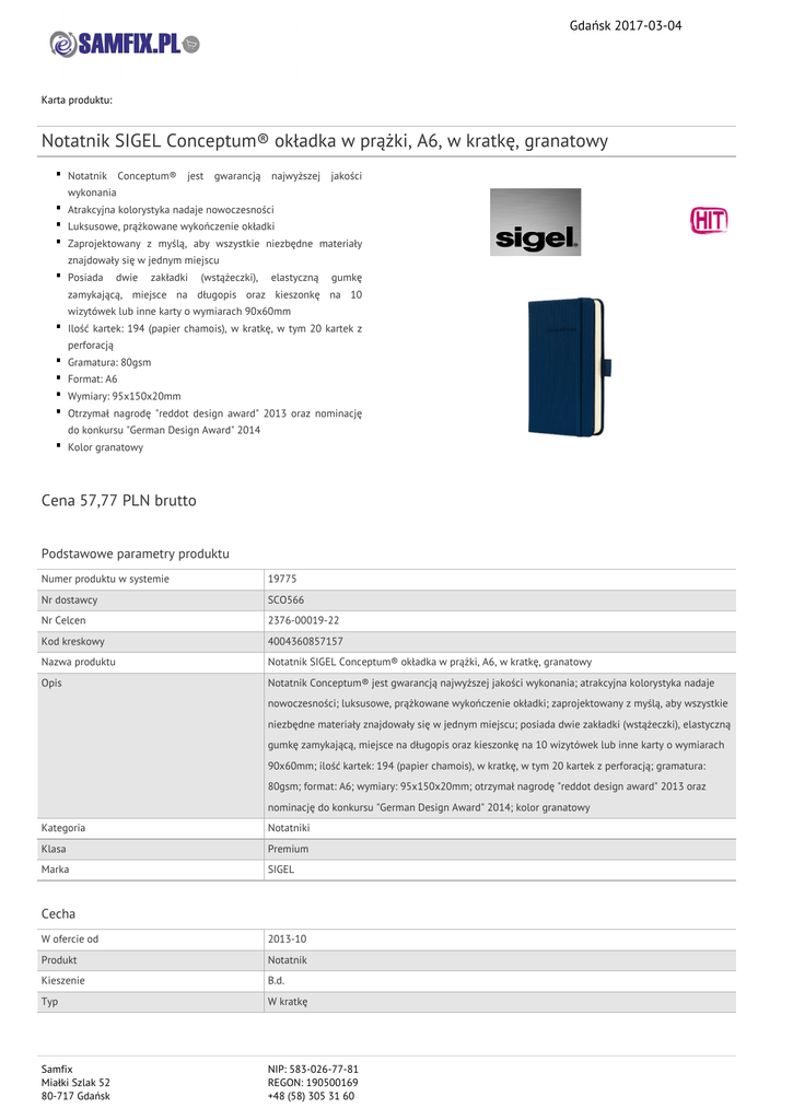 Gdańsk 2017-03-04 Karta produktu: Notatnik SIGEL Conceptum® okładka w prążki, A6, w kratkę, granatowy Notatnik Conceptum® jest gwarancją najwyższej jakości wykonania Atrakcyjna kolorystyka nadaje nowoczesności Luksusowe, prążkowane wykończenie okładki Zaprojektowany z myślą, aby wszystkie niezbędne materiały znajdowały się w jednym miejscu Posiada dwie zakładki (wstążeczki), elastyczną gumkę zamykającą, miejsce na długopis oraz kieszonkę na 10 wizytówek lub inne karty o wymiarach 90x60mm Ilość kartek: 194 (papier chamois), w kratkę, w tym 20 kartek z perforacją Gramatura: 80gsm Format: A6 Wymiary: 95x150x20mm Otrzymał nagrodę "reddot design award" 2013 oraz nominację do konkursu "German Design Award" 2014 Kolor granatowy Cena 57,77 PLN brutto Podstawowe parametry produktu Numer produktu w systemie 19775 Nr dostawcy SCO566 Nr Celcen 2376-00019-22 Kod kreskowy 4004360857157 Nazwa produktu Notatnik SIGEL Conceptum® okładka w prążki, A6, w kratkę, granatowy Opis Notatnik Conceptum® jest gwarancją najwyższej jakości wykonania; atrakcyjna kolorystyka nadaje nowoczesności; luksusowe, prążkowane wykończenie okładki; zaprojektowany z myślą, aby wszystkie niezbędne materiały znajdowały się w jednym miejscu; posiada dwie zakładki (wstążeczki), elastyczną gumkę zamykającą, miejsce na długopis oraz kieszonkę na 10 wizytówek lub inne karty o wymiarach 90x60mm; ilość kartek: 194 (papier chamois), w kratkę, w tym 20 kartek z perforacją; gramatura: 80gsm; format: A6; wymiary: 95x150x20mm; otrzymał nagrodę "reddot design award" 2013 oraz nominację do konkursu "German Design Award" 2014; kolor granatowy Kategoria Notatniki Klasa Premium Marka SIGEL Cecha W ofercie od 2013-10 Produkt Notatnik Kieszenie B.d. Typ W kratkę Samfix Miałki Szlak 52 80-717 Gdańsk NIP: 583-026-77-81 REGON: 190500169 +48 (58) 305 31 60 Gdańsk 2017-03-04 Karta katalogowa produktu cd. Notatnik SIGEL Conceptum® okładka w prążki, A6, w kratkę, granatowy Materiał Papier Wymiary Format A6 Wymiary (mm) 95x150x20 Gramatura (g/m2) 80 Ilość Ilość kartek 194 Wspólny słownik zamówień CPV 22815000-6 Notatniki Certyfikaty Hit Hit Nowy produkt w ofercie Standard Kolor Kolor Granatowy Pozostałe zdjęcia produktu Serdecznie zapraszamy do współpracy Zespół Samfix. Samfix Miałki Szlak 52 80-717 Gdańsk NIP: 583-026-77-81 REGON: 190500169 +48 (58) 305 31 60