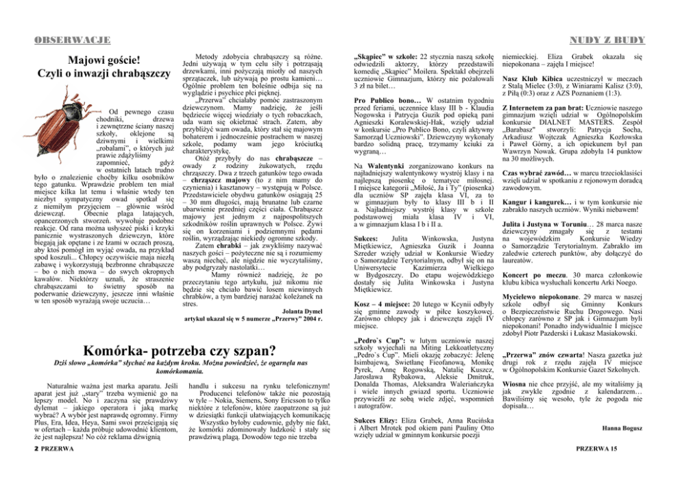 OBSERWACJE Majowi goście! Czyli o inwazji chrabąszczy Od pewnego czasu chodniki, drzewa i zewnętrzne ściany naszej szkoły, oklejone są dziwnymi i wielkimi „robalami”, o których już prawie zdążyliśmy zapomnieć, gdyż w ostatnich latach trudno było o znalezienie choćby kilku osobników tego gatunku. Wprawdzie problem ten miał miejsce kilka lat temu i właśnie wtedy ten niezbyt sympatyczny owad spotkał się z niemiłym przyjęciem – głównie wśród dziewcząt. Obecnie plaga latających, opancerzonych stworzeń. wywołuje podobne reakcje. Od rana można usłyszeć piski i krzyki panicznie wystraszonych dziewczyn, które biegają jak opętane i ze łzami w oczach proszą, aby ktoś pomógł im wyjąć owada, na przykład spod koszuli... Chłopcy oczywiście maja niezłą zabawę i wykorzystują bezbronne chrabąszcze – bo o nich mowa – do swych okropnych kawałów. Niektórzy uznali, że straszenie chrabąszczami to świetny sposób na poderwanie dziewczyny, jeszcze inni właśnie w ten sposób wyrażają swoje uczucia… NUDY Z BUDY Metody zdobycia chrabąszczy są różne. Jedni używają w tym celu siły i potrząsają drzewkami, inni pożyczają miotły od naszych sprzątaczek, lub używają po prostu kamieni… Ogólnie problem ten boleśnie odbija się na wyglądzie i psychice płci pięknej. „Przerwa” chciałaby pomóc zastraszonym dziewczynom. Mamy nadzieję, że jeśli będziecie więcej wiedziały o tych robaczkach, uda wam się okiełznać strach. Zatem, aby przybliżyć wam owada, który stał się majowym bohaterem i jednocześnie postrachem w naszej szkole, podamy wam jego króciutką charakterystykę. Otóż przybyły do nas chrabąszcze – owady z rodziny żukowatych, rzędu chrząszczy. Dwa z trzech gatunków tego owada – chrząszcz majowy (to z nim mamy do czynienia) i kasztanowy – występują w Polsce. Przedstawiciele obydwu gatunków osiągają 25 – 30 mm długości, mają brunatne lub czarne ubarwienie przedniej części ciała. Chrabąszcz majowy jest jednym z najpospolitszych szkodników roślin uprawnych w Polsce. Żywi się on korzeniami i podziemnymi pędami roślin, wyrządzając niekiedy ogromne szkody. Zatem chrabki – jak zwykliśmy nazywać naszych gości – pożyteczne nie są i rozumiemy waszą niechęć, ale nigdzie nie wyczytaliśmy, aby podgryzały nastolatki… Mamy również nadzieję, że po przeczytaniu tego artykułu, już nikomu nie będzie się chciało bawić losem niewinnych chrabków, a tym bardziej narażać koleżanek na stres. Jolanta Dymel artykuł ukazał się w 5 numerze „Przerwy” 2004 r. Komórka- potrzeba czy szpan? Dziś słowo „komórka” słychać na każdym kroku. Można powiedzieć, że ogarnęła nas komórkomania. Naturalnie ważna jest marka aparatu. Jeśli aparat jest już ,,stary” trzeba wymienić go na lepszy model. No i zaczyna się prawdziwy dylemat – jakiego operatora i jaką markę wybrać? A wybór jest naprawdę ogromny. Firmy Plus, Era, Idea, Heya, Sami swoi prześcigają się w ofertach – każda próbuje udowodnić klientom, że jest najlepsza! No cóż reklama dźwignią 2 PRZERWA handlu i sukcesu na rynku telefonicznym! Producenci telefonów także nie pozostają w tyle – Nokia, Siemens, Sony Ericsson to tylko niektóre z telefonów, które zaopatrzone są już w dziesiątki funkcji ułatwiających komunikację Wszystko byłoby cudownie, gdyby nie fakt, że komórki zdominowały ludzkość i stały się prawdziwą plagą. Dowodów tego nie trzeba „Skąpiec” w szkole: 22 stycznia naszą szkołę odwiedzili aktorzy, którzy przedstawili komedię „Skąpiec” Moilera. Spektakl obejrzeli uczniowie Gimnazjum, którzy nie pożałowali 3 zł na bilet… Pro Publico bono… W ostatnim tygodniu przed feriami, uczennice klasy III b - Klaudia Nogowska i Patrycja Guzik pod opieką pani Agnieszki Koralewskiej-Hak, wzięły udział w konkursie „Pro Publico Bono, czyli aktywny Samorząd Uczniowski”. Dziewczyny wykonały bardzo solidną pracę, trzymamy kciuki za wygraną… Na Walentynki zorganizowano konkurs na najładniejszy walentynkowy wystrój klasy i na najlepszą piosenkę o tematyce miłosnej. I miejsce kategorii „Miłość, Ja i Ty” (piosenka) dla uczniów SP zajęła klasa VI, za to w gimnazjum były to klasy III b i II a. Najładniejszy wystrój klasy w szkole podstawowej miała klasa IV i VI, a w gimnazjum klasa I b i II a. Sukces: Julita Winkowska, Justyna Miętkiewicz, Agnieszka Guzik i Joanna Szreder wzięły udział w Konkursie Wiedzy o Samorządzie Terytorialnym, odbył się on na Uniwersytecie Kazimierza Wielkiego w Bydgoszczy. Do etapu wojewódzkiego dostały się Julita Winkowska i Justyna Miętkiewicz. Kosz – 4 miejsce: 20 lutego w Kcynii odbyły się gminne zawody w piłce koszykowej. Zarówno chłopcy jak i dziewczęta zajęli IV miejsce. „Pedro`s Cup”: w lutym uczniowie naszej szkoły wyjechali na Miting Lekkoatletyczny „Pedro`s Cup”. Mieli okazję zobaczyć: Jelenę Isimbajewą, Swietłanę Fieofanową, Monikę Pyrek, Annę Rogowską, Natalię Kuszcz, Jarosława Rybakowa, Aleksie Dmitruk, Donalda Thomas, Aleksandra Waleriańczyka i wiele innych gwiazd sportu. Uczniowie przywieźli ze sobą wiele zdjęć, wspomnień i autografów. Sukces Elizy: Eliza Grabek, Anna Rucińska i Albert Mrotek pod okiem pani Pauliny Otto wzięły udział w gminnym konkursie poezji niemieckiej. Eliza Grabek niepokonana – zajęła I miejsce! okazała się Nasz Klub Kibica uczestniczył w meczach z Stalą Mielec (3:0), z Winiarami Kalisz (3:0), z Piłą (0:3) oraz z AZS Poznaniem (1:3). Z Internetem za pan brat: Uczniowie naszego gimnazjum wzięli udział w Ogólnopolskim konkursie DIALNET MASTERS. Zespół „Barabasz" stworzyli: Patrycja Socha, Arkadiusz Wojtczak Agnieszka Kozłowska i Paweł Górny, a ich opiekunem był pan Wawrzyn Nowak. Grupa zdobyła 14 punktow na 30 możliwych. Czas wybrać zawód… w marcu trzecioklasiści wzięli udział w spo