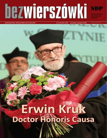bezwierszówki MIESIĘCZNIK SPOŁECZNO-KULTURALNY nr 6-8 (132-134) czerwiec-sierpień 2016 Erwin Kruk SDP Stowarzyszenie Dziennikarzy Polskich ISSN 1732-7237 Doctor Honoris Causa z zaproszeniem 2 nr 6-8 (132-134) BEZWIERSZÓWKI w numerze czerwiec-sierpień 2016 NA OKŁADCE I strona: Erwin Kruk otrzymuje doktorat honoris causa na Uniwersytecie Warmińsko-Mazurskim w Olsztynie, 1 czerwca 2016. FOT. © UWM IV strona: Anna Rubinkiewicz, „Pieczęć cielesności1”, offset, 50 x 70 cm, 2016; praca zaprezentowana podczas wystaw grafików warszawskiej ASP, zorganizowanej przez KISSPRINT – Stowarzyszenie Twórców Grafiki Użytkowej w maju 2016 roku w Warszawie (A.D.A., ul. Puławska 37, Galeria WOLNO, ul. Skorupki 6a, PLAŻOWA, ul. Wybrzeże Szczecińskie 1) Od naczelnego Doctor Honoris Causa E FOT. © UWM W NUMERZE Order Orła Białego dla dziennikarza 2 Aktualności ZG SDP 4 Mika: „Pamięć Jastrzębska” pamięta 5 Media w Polsce 6 Aktualności CMWP 8 Aktualności z oddziałów 9 Maj na Foksal 2016 11 Wegner: Dziewięćdziesiąt lat temu 14 Widziane z Warszawy 19 Piórem felietonisty 20 Wywiady Błażeja Torańskiego – Wiktor Świetlik 24 Łosińska: Niechlujny jak dziennikarz 25 Rosłan: Sąd zamiast polemiki 26 Gadowski: Sprawa z diabłem 27 Falkowski: Inteligencja i wykształciuchy 28 Rozmowy przy kawie Moniki Szczygło – Stanisława Celińska 30 Twarze mediów – Mariusz Korejwo 32 Goljat: O „Wielkiej grze” słów kilka 34 Wstrząsająca pieśń Tatarki 38 Okuniewski: Dylematy rynku wydawniczo-księgarskiego 40 Kryszczuk: Fundacja Dzieciom 42 Truszczyński: Świętokradztwo 46 Chomicz: Umbryjskim szlakiem 50 Fastnacht-Stupnicka: Ze Lwowa 54 Królikowska-Avis: Muzułmanin merem Londynu 57 Sołuda: „Pięć lat kacetu”... 60 Palczewski: Niewygodna prawda 66 Kwiatek: Serio o serialach 67 Z Mazur i Warmii 68 Lektury medioznawcy 69 Bochwic: Andrzej – człowiek dobrej woli 70 Śmierć na posterunku 71 FOT. © UWM BEZWIERSZÓWKI rwin Kruk – Członek Honorowy Stowarzyszenia Dziennikarzy Polskich – poeta, pisarz i eseista, otrzymał tytuł doktora honoris causa Uniwersytetu Warmińsko-Mazurskiego. Uroczystość odbyła się w ramach święta olsztyńskiej Alma Mater, 1 czerwca. Z wnioskiem o nadanie tytułu wystąpiła Rada Wydziału Humanistycznego Uniwersytetu Warmińsko-Mazurskiego w Olsztynie. Profesorowie: Jarosław Ławski z Uniwersytetu w Białymstoku, Janusz Małłek z Uniwersytetu Mikołaja Kopernika w Toruniu i Andrzej Sakson z Uniwersytetu im. Adama Mickiewicza w Poznaniu, zgodnie i w pełni potwierdzili zasadność decyzji Senatu UWM, aby nadać znamienitemu twórcy tę najwyższą godność akademicką. W specjalnej Uchwale (nr 886 z dnia 26 kwietnia 2016 r.) Senat Uniwersytetu Warmińsko-Mazurskiego przyznał to szczególne wyróżnienie Erwinowi Krukowi między innymi za: - mazurski trwały wkład do skarbca literatury polskiej, - tworzenie prawdziwego, sumiennego i wielowymiarowego obrazu ziemi warmińsko-mazurskiej oraz upowszechnianie go na forum ogólnopolskim, - budowanie tożsamości i rozwój dziedzictwa kulturowego regionu w wymiarze uniwersalnym, - trwające pół wieku skuteczne inspirowanie badań regionalistycznych w zakresie nauk humanistycznych i społecznych, - piękne owoce działań podjętych z myślą o dobru wspólnym społeczeństwa Warmii i Mazur, Polski i Europy. – Erwin Kruk na Mazurach był i jest od zawsze; oparł się presji, aby porzucić swoje rodzinne strony. Jego aktywnością twórczą rządził i rządzi ten sam imperatyw obowiązujący w świecie nauki i literatury – wola bezinteresownego poszukiwania prawdy o człowieku i jego otoczeniu w nurcie wciąż pędzącego czasu – stwierdził w laudacji promotor prof. Zbigniew Chojnowski. Dorobek Erwina Kruka nieprzeciętnie utalentowanego poety, pisarza, eseisty, publicysty, tłumacza, a jednocześnie wybitnego społecznika, jest wyjątkowo doniosły i znaczący ze względu na ludzki i etyczny ciężar podjętych tematów. Były i są one kluczowe nie tylko w kontekście powojennej historii Warmii i Mazur i przemian Polski, które nastąpiły począwszy od 1980 roku i trwają aż do dziś. Erwin Kruk od bez mała sześćdziesięciu lat pisze „pamiętnik artysty – / Ogryzmolony i w siebie pochylon – / Obłędny!... ależ – wielce rzeczywisty!”. Erwin Kruk to wybitna postać Mazur, strażnik mazurskiego dziedzictwa, zasłużony dla kultury i życia społecznego regionu. Pięknie się stało, że olsztyńska Uczelnia, doceniła Autochtona, człowieka stąd – z mazurskiej ziemi, wszak podobno niełatwo być prorokiem we własnej ojczyźnie. IRENEUSZ ST. BRUSKI Relacja z uroczystości nadania doktoratu honoris causa w następnym numerze „Bez Wierszówki”. 1 aktualności z Polski nr 6-8 (132-134) BEZWIERSZÓWKI Order Orła Białego dla dziennikarza Bronisław Wildstein – publicysta, dziennikarz, pisarz. W latach 1971-1980 studiował filologię polską na Uniwersytecie Jagiellońskim. W okresie studiów rozpoczął działalność opozycyjną. Współpracował z KOR. Był jednym z założycieli Studenckiego Komitetu. Współtworzył również Niezależne Zrzeszenie Studentów w Krakowie. Przez wiele lat dążył do ujawnienia kulis śmierci Stanisława Pyjasa. Był m. in. konsultantem filmu „Gry uliczne”, który był oparty na wydarzeniach związanych ze śmiercią Pyjasa. Od 1980 roku przebywał we Francji; był między innymi redaktorem miesięcznika „Kontakt” i korespondentem Radia Wolna Europa. Po powrocie z emigracji, w 1989 roku został szefem publicznego Polskiego Radia Kraków. Na początku lat 90. współpracował z „Gazetą Wyborczą”. W latach 1994-1996 był sekretarzem redakcji „Życia Warszawy”, a następnie wraz z Tomaszem Wołkiem przeniósł się do dziennika „Życie”, gdzie do 1997 r. był jego zastępcą. Współpracował m. in. z tygodnikiem „Wprost”, był felietonistą miesięcznika „Nowe Państwo” i publicystą „R