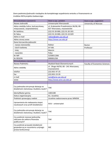Dane podmiotu/jednostki niezbędne do kompletnego wypełniania wniosku o finansowanie ze środków NCN projektu badawczego Wnioskodawca (poziom1) Nazwa Jednostki Adres siedziby (ulica, kod pocztowy, miejscowość, województwo) Nr telefonu Nr faksu Adres e-mail Adres strony www Dane kierownika jednostki - nazwa stanowiska - tytuł naukowy - imię - nazwisko Nr NIP Nr REGON Wnioskodawca (poziom2) Nazwa Podmiotu Adres siedziby telefon fax e-mail www Dane w jęz. polskim Uniwersytet Warszawski ul. Krakowskie Przedmieście 26/28, 00927 Warszawa, mazowieckie (22) 55 20 000, (22) 55 20 355 (22) 55 24 000, (22) 55 24 029 [email protected] http://www.uw.edu.pl Dane w jęz. angielskim University of Warsaw Rektor dr hab. Marcin Pałys 5250011266 000001258 Rector Professor Wydział Nauk Ekonomicznych ul . Długa 44/50, 00 - 241 Warszawa, mazowieckie (22) 831 47 25 (22) 831 23 29 [email protected] http://www.wne.uw.edu.pl Faculty of Economics Sciences Czy jednostka otrzymuje dotację na TAK działalność statutową z budżetu nauki? Identyfikator gminy Status organizacyjny Podmiot sprawujący nadzór 1465108 A1. Uczelnia Uczelnia nadzorowana przez MNiSW Uprawnienia do nadawania stopni naukowych oraz profil działalności AUU - uniwersytet Czy jednostka otrzymuje dotację na TAK działalność statutową z budżetu nauki? Czy podmiot stanowi jednostkę zaliczana do sektora finansów publicznych? TAK Czy podmiot prowadzi działalność gospodarczą w rozumieniu unijnego prawa konkurencji NIE Czy w przypadku prowadzenia działalności gospodarczej i niegospodarczej można rozdzielić oba rodzaje działalności, ich koszty i finansowanie NIE DOTYCZY Forma prawna Jednostka sektora finansów publicznych w rozumieniu przepisów ustawy z dnia 27 sierpnia 2009 r. o finansach publicznych (Dz. U. Nr 157, poz. 1240, z poźn. zm.) Wielkość przedsiębiorstwa NIE DOTYCZY