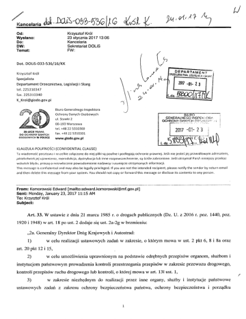u ia t6 i t Kancelaria ^,9i,n Krzysztof Król 23 stycznia 2017 13:06 Kancelaria Sekretariat DOLiS FW: Od: Wysłano: Do: DW: Temat: Dot. DOUS-033-536/16/KK Krzysztof Król Specjalista Departament Orzecznictwa, Legislacji i Skarg tel. 225310347 fax. 225310340 [email protected] Biuro Generalnego Inspektora Ochrony Danych Osobowych ul. Stawki 2 00-193 Warszawa nmm m o c m w w DAwrcw esotowrcHwwuci » 4 fc® te!. +48 22 5310300 fax. +48 22 5310301 www.giodo.gov.pl KLAUZULA POUFNOŚCI (CONFIDENTIAL CLAUSE} Ta wiadomość pocztowa i wszelkie załączone do niej pliki są poufne i podlegają ochronie prawnej. Jeśli nie jesteś jej prawidłowym adresatem, jakiekolwiek jej ujawnienie, reprodukcja, dystrybucja lub inne rozpowszechnienie, są ściśle zabronione. Jeśli otrzyma! Pan/i niniejszy przekaz wskutek błędu, proszę o niezwłocznie powiadomienie nadawcy i usunięcie otrzymanych informacji. This message is confidential and may also be legally privileged. If you are not the intended recipient, please notify the sender by return email and then delete this message from your system. You should not copy or forward this message or disclose its contents to any person. From: Komorowski Edward [mailto:[email protected]] Sent: Monday, January 23, 2017 11:15 AM To: Krzysztof Król Subject: Art. 33. W ustawie z dnia 21 marca 1985 r. o drogach publicznych (Dz. U. z 2016 r. poz. 1440, poz. 1920 i 1948) w art. 18 po ust. 2 dodaje się ust. 2a-2g w brzmieniu: „2a. Generalny Dyrektor Dróg Krajowych i Autostrad: 1) w celu realizacji ustawowych zadań w zakresie, o którym mowa w ust. 2 pkt 6, 8 i 8a oraz art. 20 pkt 12 i 15, 2) w celu umożliwienia uprawnionym na podstawie odrębnych przepisów organom, służbom i instytucjom państwowym prowadzenia kontroli przestrzegania przepisów w zakresie przewozu drogowego, kontroli przepisów ruchu drogowego lub kontroli, o której mowa w art. 131 ust. 1, 3) w zakresie niezbędnym do realizacji przez inne organy, służby i instytucje państwowe ustawowych zadań z zakresu ochrony bezpieczeństwa państwa, ochrony bezpieczeństwa i porządku i publicznego oraz ochrony ważnego interesu ekonomicznego lub finansowego Rzeczypospolitej Polskiej lub Unii Europejskiej - może gromadzić i przetwarzać dane dotyczące pojazdów oraz użytkowników dróg publicznych, w tym dane osobowe w rozumieniu ustawy z dnia 29 sierpnia 1997 r. o ochronie danych osobowych (Dz. U. z 2016 r. poz. 922), pozyskane w związku z funkcjonowaniem inteligentnych systemów transportowych, systemu poboru opłaty elektronicznej oraz systemu opłat za przejazd autostradą, o którym mowa w ustawie z dnia 27 października 1994 r. o autostradach płatnych oraz o Krajowym Funduszu Drogowym, także bez wiedzy i zgody osoby, której dane dotyczą. 2b. Dane osobowe, o których mowa w ust. 2a, obejmują: 1) imię i nazwisko; 2) numer PESEL; 3) numer identyfikacji podatkowej (NIP); 4) rodzaj, serię i numer dokumentu tożsamości; 5) adres miejsca zamieszkania albo adres do korespondencji; 6) obrazy pojazdów, w tym zawierające wizerunek osób oraz numer rejestracyjny pojazdu; 7) dane identyfikacyjne urządzenia, o którym mowa w art. 13i ust. 3; 8) dane umożliwiające określenie miejsca i czasu przemieszczania się pojazdu na sieci dróg krajowych. 2c. Dane osobowe, o których mowa w ust. 2b, przechowuje się przez okres, w którym są one niezbędne do realizacji ustawowych zadań przez Generalnego Dyrektora Dróg Krajowych i Autostrad oraz organy, służby i instytucje państwowe, o których mowa w ust. 2a pkt 2 i 3. Generalny Dyrektor Dróg Krajowych i Autostrad dokonuje weryfikacji tych danych, po zasięgnięciu opinii tych organów, służb i instytucji, nie rzadziej niż co 12 miesięcy od dnia ich uzyskania, usuwając dane zbędne. 2d. Jeżeli przepisy odrębne nie stanowią inaczej, Generalny Dyrektor Dróg Krajowych i Autostrad lub osoba przez niego upoważniona udostępnia nieodpłatnie dane, o których mowa w ust. 2a, na podstawie pisemnych wniosków organów, służb i instytucji państwowych, o których mowa w ust. 2a pkt 2 i 3. 2e. Wniosek, o którym mowa w ust. 2d, wskazuje: 1) okoliczności, z których wynika konieczność pozyskania żądanych danych; 2) dane podlegające udostępnieniu. 2f. Generalny Dyrektor Dróg Krajowych i Autostrad może wyrazić zgodę na udostępnienie za pomocą środków komunikacji elektronicznej danych, o których mowa w ust. 2a, organom, służbom i instytucjom państwowych, o których mowa w ust. 2a pkt 2 i 3, bez konieczności składania pisemnych wniosków, jeżeli jest to uzasadnione rodzajem lub zakresem wykonywanych zadań albo prowadzonej działalności oraz jeżeli podmioty te posiadają: 1) uzyskał, oraz urządzenia umożliwiające odnotowanie w systemie, kto, kiedy, w jakim celu oraz jakie dane 2) zabezpieczenie techniczne i organizacyjne uniemożliwiające wykorzystanie danych niezgodnie z celem ich uzyskania. 2g. Generalny Dyrektor Dróg Krajowych i Autostrad udostępnia Szefowi Agencji Bezpieczeństwa Wewnętrznego dane, o których mowa w ust. 2a, w sposób, o którym mowa w ust. 2f, jeżeli jednostka organizacyjna Agencji Bezpieczeństwa Wewnętrznego będąca odbiorcą danych spełnia warunki, o których mowa w ust. 2f.”.