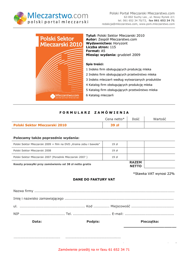 Polski Portal Mleczarski Mleczarstwo.com a 62-002 Suchy Las , ul. Nowy Rynek 2/1 tel. 061 652 34 70/72, fax 061 652 34 71 [email protected], www.psm.mleczarstwo.com a a a Tytuł: Polski Sektor Mleczarski 2010 Autor: Zespół Mleczarstwo.com Wydawnictwo: Horyzont Liczba stron: 115 Format: A5 Miesiąc wydania: grudzień 2009 Spis treści: 1 Indeks firm obsługujących produkcję mleka 2 Indeks firm obsługujących przetwórstwo mleka 3 Indeks mleczarń według wytwarzanych produktów 4 Katalog firm obsługujących produkcję mleka 5 Katalog firm obsługujących przetwórstwo mleka 6 Katalog mleczarń FORMULARZ ZAMÓWIENIA Cena netto* Polski Sektor Mleczarski 2010 Ilość Wartość 39 zł Polecamy także poprzednie wydania: Polski Sektor Mleczarski 2009 + film na DVD „Kraina zebu i bawoła” 19 zł Polski Sektor Mleczarski 2008 19 zł Polski Sektor Mleczarski 2007 (Poradnik Mleczarski 2007 ) 19 zł RAZEM NETTO Koszty przesyłki przy zamówieniu od 38 zł netto gratis A *Stawka VAT wynosi 22% DANE DO FAKTURY VAT Nazwa firmy .......................................................................................................................... Imię i nazwisko zamawiającego ............................................................................................... ul. ......................................................... Kod .............. Miejscowość ..................................... NIP ....................................... Tel. ................................. E-mail: ........................................... Data: Podpis: ……………………………………………… ………………………………………………….…… Zamówienie prześlij na nr faxu 61 652 34 71 Pieczątka: