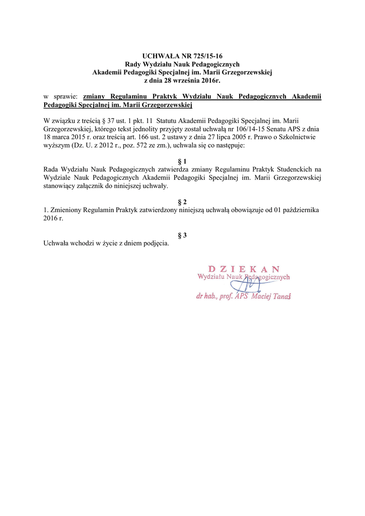 UCHWAŁA NR 725/15-16 Rady Wydziału Nauk Pedagogicznych Akademii Pedagogiki Specjalnej im. Marii Grzegorzewskiej z dnia 28 września 2016r. w sprawie: zmiany Regulaminu Praktyk Wydziału Nauk Pedagogicznych Akademii Pedagogiki Specjalnej im. Marii Grzegorzewskiej W związku z treścią § 37 ust. 1 pkt. 11 Statutu Akademii Pedagogiki Specjalnej im. Marii Grzegorzewskiej, którego tekst jednolity przyjęty został uchwałą nr 106/14-15 Senatu APS z dnia 18 marca 2015 r. oraz treścią art. 166 ust. 2 ustawy z dnia 27 lipca 2005 r. Prawo o Szkolnictwie wyższym (Dz. U. z 2012 r., poz. 572 ze zm.), uchwala się co następuje: §1 Rada Wydziału Nauk Pedagogicznych zatwierdza zmiany Regulaminu Praktyk Studenckich na Wydziale Nauk Pedagogicznych Akademii Pedagogiki Specjalnej im. Marii Grzegorzewskiej stanowiący załącznik do niniejszej uchwały. §2 1. Zmieniony Regulamin Praktyk zatwierdzony niniejszą uchwałą obowiązuje od 01 października 2016 r. §3 Uchwała wchodzi w życie z dniem podjęcia. Załącznik do Uchwały Nr 725/15-16 Rady Wydziału Nauk Pedagogicznych APS z dnia 28 września 2016 r. obowiązujący od 1.10. 2016 r. REGULAMIN PRAKTYK Wydziału Nauk Pedagogicznych w Akademii Pedagogiki Specjalnej im. Marii Grzegorzewskiej Regulamin opracowany został na podstawie: 1) Ustawy z dnia 27 lipca 2005 roku Prawo o szkolnictwie wyższym - art. 166 2) Regulaminu studiów w Akademii Pedagogiki Specjalnej im. Marii Grzegorzewskiej I. POSTANOWIENIA OGÓLNE §1 Praktyki studenckie w Akademii Pedagogiki Specjalnej pełnią ważną funkcję w procesie przygotowania zawodowego absolwenta kierunku pedagogika, pedagogika specjalna i edukacja artystyczna w zakresie sztuk plastycznych §2 1. Praktyki studenckie są integralną częścią studiów w ramach programów kształcenia i podlegają zaliczeniu. Są one bezpośrednio powiązane z przedmiotami metodycznymi, realizowanymi zgodnie z planem studiów poszczególnych specjalności. 2. W trakcie praktyk realizowane są efekty kształcenia określone dla kierunku studiów i powiązane ze specjalnością. 3. Praktyki, podobnie jak inne zajęcia dydaktyczne ustalone programem studiów, wpisuje się do systemu USOS. 4. Warunkiem zaliczenia roku studiów jest zaliczenie praktyk przewidzianych programem studiów. §3 1. Nazwę, rodzaj i termin praktyk określa program studiów specjalności. W przypadku indywidualnej organizacji studiów termin realizacji praktyki może być ustalony indywidualnie przez dziekana lub wydziałowego koordynatora praktyk. 2. W uzasadnionych przypadkach student może się ubiegać o zmianę terminu odbywania praktyki ciągłej lub śródrocznej organizowanej przez uczelnię za zgodą dziekana lub wydziałowego koordynatora praktyk. 3. Terminy realizacji praktyk ciągłych organizowanych przez Uczelnię są podawane do wiadomości studentów w zarządzeniu dziekana wydziału nie później niż do 20 listopada. § 4. 1. Uczelnia nie pokrywa kosztów praktyki dotyczących zakwaterowania i przejazdu studenta z miejsca zamieszkania do miejsca praktyki. 2. Praktyki realizowane na studiach niestacjonarnych odbywają się na koszt własny studenta. §5 1. Uczelnianym opiekunom praktyki, pełniącym opiekę i nadzór w czasie praktyki nad studentami studiów stacjonarnych i niestacjonarnych, przysługuje wynagrodzenie. 2. Opiekunom praktyk w placówce praktyki, sprawującym opiekę nad studentami studiów stacjonarnych specjalności nauczycielskich, przysługuje wynagrodzenie. Innym opiekunom praktyk wynagrodzenie nie przysługuje. 3. Wysokość wynagrodzenia określonego w p.1 i 2 reguluje odrębne zarządzenie Rektora APS. §6 1. Studenci odbywający praktykę są ubezpieczeni od odpowiedzialności cywilnej przez uczelnię, natomiast od następstw nieszczęśliwych wypadków, jeśli tego wymaga placówka, są zobowiązani do ubezpieczenia indywidualnego. 2. Uczelnia nie pokrywa kosztów badań sanitarnych i innych, wymaganych przez placówkę (zakład pracy). II. CELE I FORMY PRAKTYK §7 Zasadniczym celem praktyk jest osiągnięcie przez studentów zakładanych w programie studiów efektów kształcenia, umożliwiających nabywanie doświadczeń związanych z funkcjonowaniem systemu oświaty i wychowania, ze specyfiką placówek edukacyjnych, rehabilitacyjnych i wychowawczych oraz innych zakładów pracy zgodnych z profilem realizowanych specjalności. §8 1. Studenci realizują praktyki zgodnie z programem kształcenia w formie: 1) praktyk ciągłych – realizowanych w kolejnych dniach nauki roku akademickiego, 2) praktyk śródrocznych – realizowany w roku akademickim. 2. Praktyki mogą być organizowane w trybie: 1) uczelnianym – gdy placówkę praktyki wskazuje uczelniany opiekun praktyki, 2) indywidualnym – gdy student samodzielnie pozyskuje placówkę, w której będzie realizowana praktyka. 3. Nazwy, rodzaje i miejsca realizacji praktyk studenckich dla poszczególnych specjalności, zamieszczone są w programach kształcenia tych specjalności i podlegają zatwierdzeniu przez Radę Wydziału. III. ORGANIZACJA PRAKTYK §9 1. Nadzór merytoryczny nad przebiegiem praktyk na Wydziale Nauk Pedagogicznych sprawuje, powoływany na wniosek dziekana, wydziałowy koordynator praktyk. 2. Wydziałowy koordynator praktyk współpracuje z dziekanatem (sekcja praktyk) oraz z innymi osobami, które biorą czynny udział w realizacji praktyk, jak: kierownik jednostki prowadzącej specjalność, kierownik specjalności, uczelniany opiekun praktyki i inni. 3. Dziekanat jest odpowiedzialny za kompletowanie dokumentacji praktyk i finansowe ich rozliczanie, opracowanie systemu kompletowania i gromadzenia dokumentacji praktyk studenckich oraz ich archiwizowania w APS. § 10 1. Dokumentacja praktyk zawiera: 1) porozumienie lub umowę z zakładem pracy albo pismo o przyjęcie studenta na praktykę, których wzór wg potrzeb, uzgadnia i opracowuje dziekanat w porozumieniem z wydziałowym koordynatorem praktyk. W przypadku organizacji p
