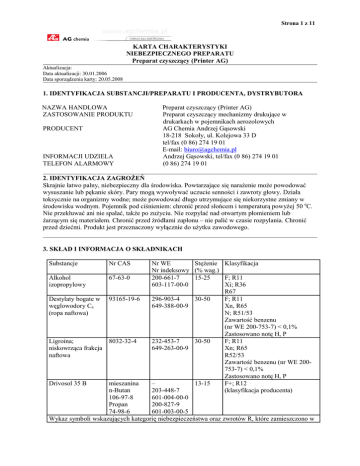 Strona 1 z 11 KARTA CHARAKTERYSTYKI NIEBEZPIECZNEGO PREPARATU Preparat czyszczący (Printer AG) Aktualizacja: Data aktualizacji: 30.01.2006 Data sporządzenia karty: 20.05.2008 1. IDENTYFIKACJA SUBSTANCJI/PREPARATU I PRODUCENTA, DYSTRYBUTORA NAZWA HANDLOWA ZASTOSOWANIE PRODUKTU PRODUCENT INFORMACJI UDZIELA TELEFON ALARMOWY Preparat czyszczący (Printer AG) Preparat czyszczący mechanizmy drukujące w drukarkach w pojemnikach aerozolowych AG Chemia Andrzej Gąsowski 18-218 Sokoły, ul. Kolejowa 33 D tel/fax (0 86) 274 19 01 E-mail: [email protected] Andrzej Gąsowski, tel/fax (0 86) 274 19 01 (0 86) 274 19 01 2. IDENTYFIKACJA ZAGROŻEŃ Skrajnie łatwo palny, niebezpieczny dla środowiska. Powtarzające się narażenie może powodować wysuszanie lub pękanie skóry. Pary mogą wywoływać uczucie senności i zawroty głowy. Działa toksycznie na organizmy wodne; może powodować długo utrzymujące się niekorzystne zmiany w środowisku wodnym. Pojemnik pod ciśnieniem: chronić przed słońcem i temperaturą powyżej 50 0C. Nie przekłuwać ani nie spalać, także po zużyciu. Nie rozpylać nad otwartym płomieniem lub żarzącym się materiałem. Chronić przed źródłami zapłonu – nie palić w czasie rozpylania. Chronić przed dziećmi. Produkt jest przeznaczony wyłącznie do użytku zawodowego. 3. SKŁAD I INFORMACJA O SKŁADNIKACH Substancje Nr CAS Nr WE Stężenie Klasyfikacja Nr indeksowy (% wag.) Alkohol 67-63-0 200-661-7 15-25 F; R11 izopropylowy 603-117-00-0 Xi; R36 R67 Destylaty bogate w 93165-19-6 296-903-4 30-50 F; R11 węglowodory C6 649-388-00-9 Xn, R65 (ropa naftowa) N; R51/53 Zawartość benzenu (nr WE 200-753-7) < 0,1% Zastosowano notę H, P Ligroina; 8032-32-4 232-453-7 30-50 F; R11 niskowrząca frakcja 649-263-00-9 Xn; R65 naftowa R52/53 Zawartość benzenu (nr WE 200753-7) < 0,1% Zastosowano notę H, P Drivosol 35 B mieszanina – 13-15 F+; R12 n-Butan 203-448-7 (klasyfikacja producenta) 106-97-8 601-004-00-0 Propan 200-827-9 74-98-6 601-003-00-5 Wykaz symboli wskazujących kategorię niebezpieczeństwa oraz zwrotów R, które zamieszczono w Strona 2 z 11 KARTA CHARAKTERYSTYKI NIEBEZPIECZNEGO PREPARATU Preparat czyszczący (Printer AG) punkcie 2 karty charakterystyki oraz pełne ich brzmienie zamieszczono w p. 16 niniejszej karty charakterystyki. Zwroty R odnoszą się do składników mieszaniny, a nie do całego preparatu. 4. PIERWSZA POMOC DROGI ODDECHOWE Wyprowadzić poszkodowanego na świeże powietrze. W razie braku natychmiastowej poprawy, zapewnić opiekę medyczną. KONTAKT ZE SKÓRĄ Zanieczyszczoną skórę przemyć dużą ilością wody. Jeśli podrażnienie skóry utrzymuje się zapewnić opiekę medyczną. KONTAKT Z OCZAMI Oczy płukać dużą ilością wody ok. 15 min., skonsultować się z lekarzem. POŁKNIĘCIE Wypić dużą ilość wody, nie powodować wymiotów, skonsultować się z lekarzem. 5. POSTĘPOWANIE W PRZYPADKU POŻARU ODPOWIEDNIE ŚRODKI GAŚNICZE Woda – rozproszone prądy wodne, piana odporna na alkohol, dwutlenek węgla, proszki gaśnicze. ŚRODKI GAŚNICZE, KTÓRYCH NIE WOLNO UŻYWAĆ ZE WZGLĘDÓW BEZPIECZEŃSTWA Nie stosować zwartych strumieni wody. SZCZEGÓLNE ZAGROŻENIA Skrajnie łatwo palna ciecz. Woda może być nieskutecznym środkiem gaśniczym. Powinna być użyta w celu ochłodzenia pojemników z preparatem, aby zapobiec wybuchowi. Pary mogą przemieszczać się wzdłuż podłoża do źródła zapłonu i spowodować wsteczny ciąg płomienia. Zbiorniki narażone na działanie ognia lub wysokiej temperatury chłodzić wodą z bezpiecznej odległości; jeśli to możliwe, usunąć je z obszaru zagrożenia (groźba wybuchu). NIEBEZPIECZNE PRODUKTY ROZKŁADU Możliwe jest powstanie tlenku węgla, ditlenku węgla. SPECJALNE WYPOSAŻENIE OCHRONNE DLA STRAŻAKÓW Podczas pożaru mogą powstawać substancje szkodliwe dla zdrowia. Nałożyć odzież ochronną gazoszczelną i aparat izolujący drogi oddechowe (aparat tlenowy skompletowany z maską). INNE INFORMACJE Nie dopuścić do przedostania się środków gaśniczych do kanalizacji i cieków wodnych. Zawiadomić otoczenie o pożarze. Usunąć z obszaru zagrożenia wszystkie osoby niebiorące udziału w likwidowaniu pożaru. Powiadomić Państwową Straż Pożarną, a w razie konieczności także Policję Państwową, najbliższe władze terenowe i najbliższą jednostkę Ratownictwa Chemicznego. Strona 3 z 11 KARTA CHARAKTERYSTYKI NIEBEZPIECZNEGO PREPARATU Preparat czyszczący (Printer AG) 6. POSTĘPOWANIE W PRZYPADKU NIEZAMIERZONEGO UWOLNIENIA DO ŚRODOWISKA INDYWIDUALNE ŚRODKI OSTROŻNOŚCI Zapewnić odpowiednie środki ochrony indywidualnej (ubranie, okulary i rękawice ochronne). ŚRODKI OSTROŻNOŚCI W ZAKRESIE OCHRONY ŚRODOWISKA W razie awarii nie dopuszczać do zrzutów do środowiska. Zabezpieczyć produkt przed przedostaniem się do kanałów ściekowych, wód powierzchniowych i gruntowych oraz do gleby. Próbować zebrać jak tylko to możliwe, do odpowiednich pojemników celem dalszej utylizacji. METODY OCZYSZCZANIA Produkt znajduje się w hermetycznie zamkniętych pojemnikach aerozolowych – wyciek jest mało prawdopodobny. W razie uszkodzenia pojemnika usunąć z otoczenia źródła ognia i zapewnić dobrą wentylację. Wyciek zebrać za pomocą obojętnych absorbentów np. piasku. Umieścić w odpowiednim pojemniku i przekazać do utylizacji. 7. POSTĘPOWANIE Z PREPARATEM I JEGO MAGAZYNOWANIE POSTĘPOWANIE Z PREPARATEM Unikać kontaktu z oczami i skórą. Używać z dala od źródła ognia lub żarzących się materiałów. Unikać kontaktu z oczami par, rozpylonej cieczy. Nie wdychać pary, rozpylonej cieczy. Nie jeść, nie pić, nie palić tytoniu podczas pracy z produktem. Zanieczyszczone powierzchnie czyścić woda z mydłem. Pomieszczenia muszą posiadać odpowiednią wentylację miejscową i ogólną. Jeśli wentylacja jest niewystarczająca, stosować aparat izolujący drogi oddechowe. Przestrzegać podstawowych zasad higieny – myć ręce po pra