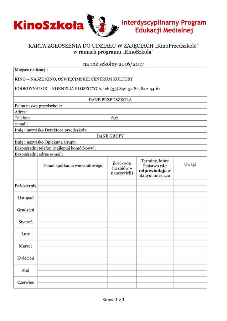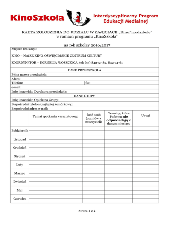 KARTA ZGŁOSZENIA DO UDZIAŁU W ZAJĘCIACH „KinoPrzedszkole” w ramach programu „KinoSzkoła” na rok szkolny 2016/2017 Miejsce realizacji: KINO – NASZE KINO, OŚWIĘCIMSKIE CENTRUM KULTURY KOORDYNATOR – KORNELIA PŁOSZCZYCA, tel: (33) 842-57-82, 842-44-61 DANE PRZEDSZKOLA Pełna nazwa przedszkola: Adres: Telefon: e-mail: Imię i nazwisko Dyrektora przedszkola: fax: DANE GRUPY Imię i nazwisko Opiekuna Grupy: Bezpośredni telefon (najlepiej komórkowy): Bezpośredni adres e-mail: Temat spotkania warsztatowego ilość osób (uczniów + nauczycieli) Październik Listopad Grudzień Styczeń Luty Marzec Kwiecień Maj Czerwiec Strona 1 z 2 Terminy, które Państwu nie odpowiadają w danym miesiącu Uwagi REGULAMIN ZAJĘĆ EDUKACYJNYCH KINO PRZEDSZKOLE PROWADZONYCH W RAMACH PROGRAMU „KinoSzkoła” 1. Niniejszy regulamin dotyczy zajęć organizowanych w ramach Interdyscyplinarnego Programu Edukacji Medialnej „KinoSzkoła” prowadzonego przez Fundację Rozwoju Kompetencji Medialnych i Społecznych „KinoSzkoła”. 2. Organizatorem zajęć z cyklu „KinoPrzedszkole” w Oświęcimiu jest Kino „Nasze Kino” 3. Do programu można przystąpić w każdym momencie roku szkolnego wypisując „Kartę zgłoszenia”. „Kartę zgłoszenia” składa Opiekun grupy (Nauczyciel) u Koordynatora programu (wyznaczonego do tego celu pracownika Kina). Złożenie „Karty zgłoszenia” jest równoznaczne ze złożeniem zamówienia na zajęcia edukacyjne. 4. Zgłoszenia na zajęcia październikowe przyjmowane są do 13 września 2016 r. 5. Udział w zajęciach jest odpłatny. Wysokość opłaty wyznacza Kino. 6. Płatność za zajęcia z tytułu karnetów (na 5, 7 lub 9 spotkań) następuje z góry, najpóźniej na dwa tygodnie przed pierwszymi zajęciami. Nie ma możliwości rozłożenia płatności na raty, o ile Kino nie ustali inaczej. 7. Płatność za pojedyncze seanse wymagana jest najpóźniej na dwa tygodnie przed planowanym terminem zajęć. W przypadku braku płatności za zajęcia ze strony uczestników Kino ma prawo odwołać zajęcia. 8. Termin zajęć ustala Kino wraz z Kierownikiem Programu „KinoSzkoła” (pracownikiem Fundacji) na podstawie „Karty zgłoszenia” wypełnionej przez grupę. Z tego względu, Opiekun Grupy (Nauczyciel) ma obowiązek informowania Koordynatora Programu o wszelkich zmianach dotyczących dyspozycyjności grupy (w innym przypadku zapisy „karty zgłoszeniowej” traktowane będą jako aktualne). Zmiany te przyjmowane będą do trzeciego dnia miesiąca poprzedzającego miesiąc, w którym mają odbyć się zajęcia1. 9. Podczas zajęć Nauczyciel ponosi odpowiedzialność za wychowanków. Nauczyciel musi być obecny na Sali, w której odbywają się zajęcia. Dotyczy to zarówno prelekcji, zajęć warsztatowych oraz projekcji filmowych. 10. Fundacja „KinoSzkoła” oraz Kino mają prawo zmienić tytuł filmu przy jednoczesnym zachowaniu tematyki zajęć. Zmieniony tytuł będzie odpowiedni dla danej grupy odbiorczej. 11. Niniejszy dokument (Karta zgłoszenia wraz z Regulaminem) sporządzony zostaje w dwóch egzemplarzach – jednym dla szkoły i jednym dla Kina. Wyrażam zgodę na wykorzystywanie danych osobowych w celach związanych z realizacją programu „KinoSzkoła”. Pieczęć i podpis Dyrektora przedszkola: 1 Podpis Opiekuna Grupy: Na przykład: zgłoszenia i zmiany dotyczące MAJA przyjmowane będą do 3 kwietnia. Strona 2 z 2