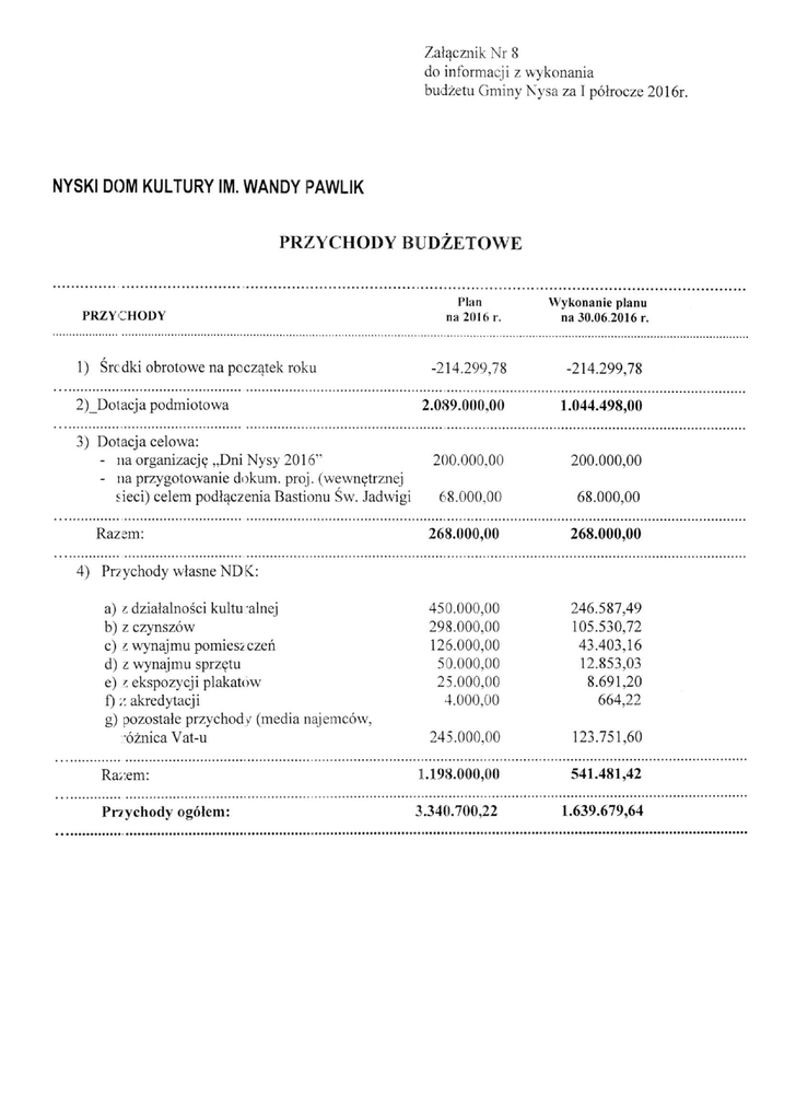 Załącznik Nr 8 do informacji z wykonania budżetu Gminy Nysa za ł półrocze 20ł6r. NYSKI DOM KULTURY IM. WANDY PAWLIK P R Z Y C H O D Y BUDŻETOWE Plan na 2016 r. PRZYCHODY 1) Src dki obrotowe na początek roku 2)_Dotacja podmiotowa 3) Dotacja cełowa: - na organizację „Dni Nysy 2016" - na przygotowanie dokum. proj. (wewnętrznej sieci) celem podłączenia Bastionu Św. Jadwigi Razem: Wykonanie planu na 30.06.2016 r. -214.299,78 -214.299,78 2.089.000,00 1.044.498,00 200.000,00 200.000,00 68.000,00 68.000,00 268.000,00 268.000,00 450.000,00 298.000,00 126.000,00 50.000,00 25.000,00 4.000,00 246.587,49 105.530,72 43.403,16 12.853,03 8.691,20 664,22 245.000,00 123.751,60 1.198.000,00 541.481,42 3.340.700,22 1.639.679,64 4) Przychody własne ND IC: a) 2 działalności kultu -alnej b) z czynszów c) 2 wynajmu pomieszczeń d) z wynajmu sprzętu e) z ekspozycji plakatów f) z akredytacji g) pozostałe przychód / (media najemców, •óżnica Vat-u Razem: Przychody ogółem: W Y D A T K I BUDŻETOWE KOSZTY W G RODZAJÓW - W Y D A T K I ZUŻYCIE MATERIAŁÓW 1 EMERGII: A/MATERIAŁY: - zakup drobnego sprzętu - zakup materiałów dekoracyjny ch i nagród w kor kursach - zakup mat. gospodarczych, w :yni do bież. rem. - zakup materiałów biurowych - zakup paliwa i części do samochodu - zakup czasopism i vvydawnict'\ - zakup środków czystości Razem: B/ ENER(}IA: - energia elektryczna - energia cieplna - zużyć e wody Razem: USŁUGI O B C E : - usługi komunalne - usługi telekomunikacyjne - usługi kulturalne - usługi medyczne - usługi pralnicze - konserwacja gaśnic i systemu prteciw pożatowego - monitoring obiektów oraz jego konserw, i naprawa - ochrona imprez kulturalnych - usługi transportowe w tym przewóz osób - wynajem agregata - usługi remontowe - drobne r aprawy sprzętu i jego kcnserwac ja - konserwacja urządzeń dźwigowych oraz jego naprawa - wypożyczenie ekspozycji multirredialnej do Bastionu - przygotowanie materiału i obshiga leda - usługa prawnicza - nadzór i iwestorski - wynajem kabin toi toi,plotów,ko)iten. na imprezy plencowe - usługa informatyczna - reklama imprez kulturalnych - sprzątanie obiektu - przygotowanie dokumentacji projektowej (wcw ;i. sieci) celem podłączenia Bastionu Św. J a d w i d do N E C - pozostałe usługi nie wymienione tj. wykonanie pieczątek, tłumaczenia tekstów, dorabianie kluczy, strojenie fortepianii itp.) RAZEM P O D A T K I I OPŁATY: - podatek od nieruchomości - ubezpieczenie imprez kulturalny :li - pozostaje ubezpieczenie w tym nienia - opłata " ?aiks-u" - opłata bankowa Plan na 2016 r. Wykonanie [ilanu na 30.06.2016 r. 10.000.00 I ~ 'y ."1 /y ry fy 8.190,29 1 /y yy /y zy y 13.000,00 10.000.00 13.000,00 3.000,00 1.000,00 10.000,00 12.080,86 6.249,33 6.621,62 1.676,78 408,70 6.530,07 62.000,00 41.757,65 235,000.00 65.000.00 50.000.00 134.761,6' 32.969,08 15.179,50 .550.000,00 182.910,25 15.000.00 20.000,00 400.000,00 10.000.00 700.00 5.000.00 3,600.00 78.C0O.O0 5.C 00.00 10.000,00 5.000.00 5.000.00 10.000,00 17.712.00 88.560.00 17.712.00 2.000,00 20.000.00 1,000.00 10.000,00 22.500.00 31.000,00 4.252,-4 15.966, )0 255.341,55 6.720,30 51,56 3.312,39 2.302,56 63.691,56 4.351,00 7.630,92 21.000,00 15.079 39 798.784,00 486.921,31 45.000,00 9.750,00 6.000,00 23.000,00 8.000,00 3.713.35 4.489,50 8.856,00 44.280.00 11.316,00 16.375.50 660,75 8.419.64 10.110,60 33.683 5.558 1.596 7.799 4.128 00 20 98 43 79 - oplata z a u ż y t k o w a n i e wieczyste gruntu i inne - pozostałe drobne opłaty nie wymienione w tym za administrację lokalu przy ul. Moniuszki RAZEM: 700,00 651,00 10.000,00 7.234,23 102.450,00 60.651,63 WYNAGRODZENIE: - w y n a g r o d ź e n i e osobowe pracown k ó w nagrody jubileuszowe i odprawy emerytalne umowy zlecenia, umowy o dzieło z a k ł a d o w y fundusz n a g r ó d 910.000.00 37.700.00 280.000.00 30.000,00 443.836,69 19.434,00 201.856,50 23.200,00 1.257.700,00 688.327,19 81.675,90 7.865,03 - składka na P F R O N - pozostałe świadczenia na rzecz p r a c o w n i k ó w - z a k ł a d o w y fundusz socjalny 165.000,00 22.500,00 10.000,00 18.500,00 25.561,50 RAZEM: 242.561,50 RAZEM: U B E Z P I E C Z E N I A I INNE ŚWIA DCZENIA: - składki na ibezpieczenia społeczne - składki na FP 11.620,65 19.171,00 11'y co 120.332,58 1 '>A POZOSTAŁE K O S Z T Y : - p o d r ó ż e słi ż b o w e - w y ż y w i e n i ; i noclegi artystów poc czas imprez kult. 2.000,00 38.000,00 812,13 32 168 83 RAZEM: 40.000,00 32.980,96 629.670,00 302.291,00 AMORTYZACJA: OGÓŁEM: Ś r o d k i obrotowe na koniec roku 3.483.165,50 1.916.172,57 -142.465,28 -276.492,93 Zestawienie należności i zobowiązań na dzień 30.06.2016 r. 1. Na eżności z tytułu dojtaw i usług w (ikresie wymagałności do 12 miesięcy 47.223,67 zł. 2. Zol)owiązania z tytułu dostaw i usług w okresie wymagalności do 12 miesięcy 6.072,76 zł. 3. Zoliowiązania z tytułu podatków 12.701,00 zł. 4. Zoliowiązania z tytułu składek ZUS 30.624,45 zł.