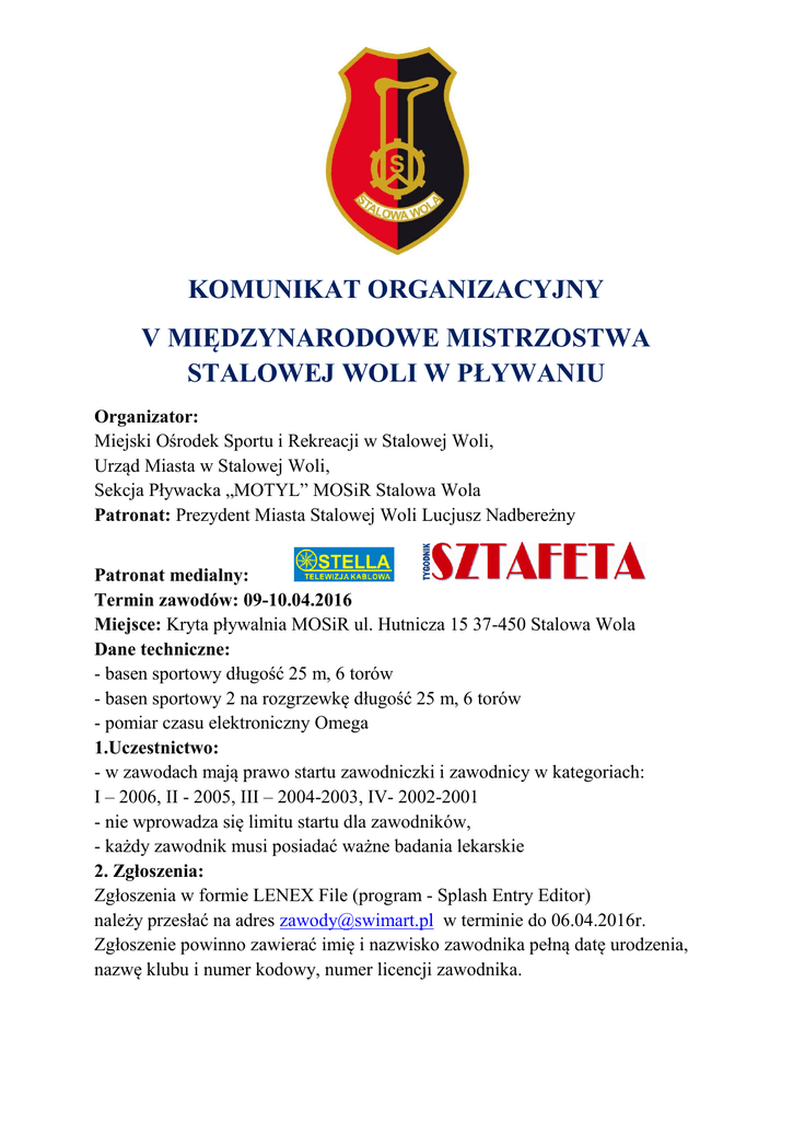 KOMUNIKAT ORGANIZACYJNY V MIĘDZYNARODOWE MISTRZOSTWA STALOWEJ WOLI W PŁYWANIU Organizator: Miejski Ośrodek Sportu i Rekreacji w Stalowej Woli, Urząd Miasta w Stalowej Woli, Sekcja Pływacka „MOTYL” MOSiR Stalowa Wola Patronat: Prezydent Miasta Stalowej Woli Lucjusz Nadbereżny Patronat medialny: Termin zawodów: 09-10.04.2016 Miejsce: Kryta pływalnia MOSiR ul. Hutnicza 15 37-450 Stalowa Wola Dane techniczne: - basen sportowy długość 25 m, 6 torów - basen sportowy 2 na rozgrzewkę długość 25 m, 6 torów - pomiar czasu elektroniczny Omega 1.Uczestnictwo: - w zawodach mają prawo startu zawodniczki i zawodnicy w kategoriach: I – 2006, II - 2005, III – 2004-2003, IV- 2002-2001 - nie wprowadza się limitu startu dla zawodników, - każdy zawodnik musi posiadać ważne badania lekarskie 2. Zgłoszenia: Zgłoszenia w formie LENEX File (program - Splash Entry Editor) należy przesłać na adres [email protected] w terminie do 06.04.2016r. Zgłoszenie powinno zawierać imię i nazwisko zawodnika pełną datę urodzenia, nazwę klubu i numer kodowy, numer licencji zawodnika. Komunikat i zaproszenie do pobrania na stronie www.megatiming.pl (zakładka zawody okręgowe) oraz na www.mosir.stalowawola.pl . 3.Przepisy techniczne: - zawody będą przeprowadzone seriami na czas. - serie zostaną ustalone według zgłoszonych czasów. Brak wyniku na karcie zgłoszenia powoduje umieszczenie zawodnika w najsłabszych seriach. - podczas zawodów obowiązują przepisy FINA i PZP. 4. Program zawodów: Sobota 09.04.2016 BLOK I 1400-1445 1445-1500 1500 Numer konkurencji 1/2 3/4 5/6 7/8 9/10 11/12 13/14 ROZGRZEWKA UROCZYSTE OTWARCIE ZAWODÓW ROZPOCZĘCIE ZAWODÓW KONKURENCJE Dystans Styl Kategoria 50m 100m 100m 200m 100m 200m 4x50m dowolnym zmiennym motylkowym grzbietowym klasycznym dowolnym dowolnym K/M K/M K/M K/M K/M K/M K/M Niedziela 10.04.2016 BLOK II 900-950 1000 Numer konkurencji 15/16 17/18 19/20 21/22 23/24 25/26 27/28 ROZGRZEWKA ROZPOCZĘCIE ZAWODÓW KONKURENCJE Dystans Styl Kategoria 50m 100m 100m 50m 200m 200m 4x50m motylkowym dowolnym grzbietowym klasycznym motylkowym zmiennym zmiennym K/M K/M K/M K/M K/M K/M K/M Skład sztafet: po jednym zawodniku z każdej kategorii wiekowej, kolejność zawodników dowolna. 5. Nagrody: - za zajęcie miejsca 1-3 w konkurencjach indywidualnych we wszystkich kategoriach wiekowych medale i dyplomy – (dekoracje odbędą się w czasie trwania wyścigów). - za zajęcie miejsca 1-3 w konkurencjach sztafetowych medale dla całej sztafety i dyplom. - nagrody rzeczowe dla najlepszych zawodniczek i zawodników w każdej kategorii. Dwa najlepsze starty wg punktacji wielobojowej (po jednym z każdego bloku) - puchary dla trzech najlepszych drużyn. Punktacja 1 miejsce – 7 pkt. 2 miejsce – 5 pkt. 3 miejsce – 4 pkt. 4 miejsce – 3 pkt. 5 miejsce – 2 pkt. 6 miejsce 1 pkt. Punktuje dwóch najlepszych zawodników z klubu. 6. Zasady finansowania: - koszty organizacyjne pokrywa organizator, - koszty uczestnictwa ponoszą uczestnicy: a) opłata startowa wynosi 10 zł od każdego zgłoszonego startu indywidualnego, b) 15 zł od każdej zgłoszonej sztafety c) Obligatoryjnie lista startowa i komunikat 20 zł. Wpłaty należy dokonać na konto MOSiR nr: PKO BP 76102049130000970201177005 do dnia 06.04.2015 ( kluby chcące otrzymać fakturę VAT proszeni są o informację najpóźniej w dniu dokonania przelewu) lub w kasie MOSiR-u w podczas pierwszego bloku zawodów. 7. Zakwaterowanie: -Hotel Hutnik ul. Wyszyńskiego 12, ok. 90 miejsc (1km od pływalni) tel. 158420209 Fundacja Uniwersytecka w Stalowej Woli ul. Ofiar Katynia 6, (300m od pływalni, cena 35,- zł brutto ) Tel. 15 6422538, kom. 606202198 -Hotel Stal ul. KEN 4 tel. 15 842 19 91 (2 km od pływalni) Przy hotelu Restauracja „Roma” tel. 15 843 2172 - Wyżywienie: Pizzeria Rustica 2 ul. Ks. J. Popiełuszki 25a (300 m od pływalni) Tel. 15 842 57 15 - Stołówka przy Fundacji Uniwersyteckiej ul. Ofiar Katynia 6 Rezerwacji każdy dokonuje we własnym zakresie! 8. Postanowienia końcowe: - Organizator zapewnia opiekę medyczną oraz komisję sędziowską. - W sprawach nieokreślonych regulaminem, komunikatami oraz innymi przepisami decyzję podejmuje organizator. - wszelkie informacje i zapytania kierować do Jarosława Niedbałowskiego e-mail [email protected] Tel. 608331998