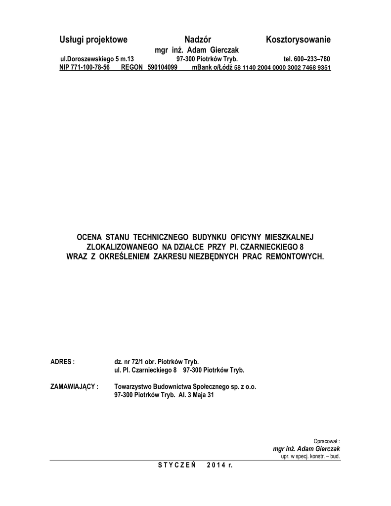 Usługi projektowe Nadzór Kosztorysowanie mgr inŜ. Adam Gierczak ul.Doroszewskiego 5 m.13 97-300 Piotrków Tryb. tel. 600–233–780 NIP 771-100-78-56 REGON 590104099 mBank o/Łódź 58 1140 2004 0000 3002 7468 9351 OCENA STANU TECHNICZNEGO BUDYNKU OFICYNY MIESZKALNEJ ZLOKALIZOWANEGO NA DZIAŁCE PRZY Pl. CZARNIECKIEGO 8 WRAZ Z OKREŚLENIEM ZAKRESU NIEZBĘDNYCH PRAC REMONTOWYCH. ADRES : dz. nr 72/1 obr. Piotrków Tryb. ul. Pl. Czarnieckiego 8 97-300 Piotrków Tryb. ZAMAWIAJĄCY : Towarzystwo Budownictwa Społecznego sp. z o.o. 97-300 Piotrków Tryb. Al. 3 Maja 31 Opracował : mgr inŜ. Adam Gierczak upr. w specj. konstr. – bud. STYCZEŃ 2 0 1 4 r. Zawartość opracowania: 1. Oświadczenie projektanta 2. Podstawa opracowania. 3. Przedmiot i cel opracowania 4. Materiały i badania wykorzystane w opracowaniu ekspertyzy. 5. Mapa sytuacyjno - wysokościowa 6. Opis ogólny budynku i jego elementów wraz z oceną stanu technicznego. 7. Wnioski . 8. Określenie zakresu robót remontowych oraz technologii ich wykonania. 9. Dokumentacja fotograficzna. Piotrków Tryb. 22.01.2014 r. 1. O Ś W I A D C Z E N I E PROJEKTANTA. Stosownie do art. 20 ust. 4 Ustawy z dnia 7 lipca 1994 r. – Prawo Budowlane - / Dz. U. nr 207 poz. 2016 z późń. zm. / oświadczam, Ŝe orzeczenie techniczne fragmentu oficyny mieszkalnej zlokalizowanej na dz. nr 72/1 w Piotrkowie Tryb przy ul. Plac Czarnieckiego 8 został sporządzony zgodnie z obowiązującymi przepisami oraz zasadami wiedzy technicznej. 2.Podstawa opracowania. Zlecenie i Umowa zawarta z Towarzystwem Budownictwa Społecznego sp. z o. o. w Piotrkowie Tryb. 3.Przedmiot i cel opracowania. Przedmiotem opracowania jest ekspertyza techniczna części budynku mieszkalnego /oficyny/ znajdującego się na działce nr 72/1 przy Pl. Czarnieckiego 8 w Piotrkowie Tryb. 4.Materiały i badania wykorzystane w opracowaniu ekspertyzy. a/. wizja lokalna przeprowadzona w dn. 12 – 20 stycznia 2014 r. podczas której dokonano szczegółowych oględzin obiektów, wykonano konieczne i niezbędne odkrywki oraz pomiary sprawdzające. b/. szczegółowa analiza udostępnionej przez Zamawiającego dokumentacji; - ekspertyza techniczna opracowana w 1989 r. - projekt techniczny będącego w trakcie realizacji budynku mieszkalnego c/. Literatura techniczna: J. Łempicki J. Tierry, S. Zaleski W. śenczykowski W. Bogucki Pr. Zbiorowa – „Ekspertyzy budowlane. Zasady i metody opracowania. – „Remonty budynków i wzmacnianie konstrukcji budowlanych”. – „Budownictwo ogólne”. – „Budownictwo stalowe”. - „Awarie konstrukcji betonowych i murowych”. d/. Normy budowlane: - PN-82/B-02001 - PN-82/B-02003 - ObciąŜenia budowli. ObciąŜenia stałe. - ObciąŜenia budowli. ObciąŜenia technologiczne. Podstawowe obciąŜenia technologiczno-montaŜowe - PN-80/B-02010 - ObciąŜenia w obliczeniach statycznych. ObciąŜenie śniegiem. - PN-77/B-02011 - ObciąŜenia w obliczeniach statycznych. ObciąŜenie wiatrem. - PN-81/B-03150/01 - Konstrukcje z drewna i materiałów drewnopochodnych. Obliczenia statyczne i projektowanie. Konstrukcje. - PN-81/B-03150/03 - Konstrukcje z drewna i materiałów drewnopochodnych. Obliczenia statyczne i projektowanie. Złącza. - PN-91/B-03200 - Konstrukcje stalowe. Obliczenia statyczne i projektowanie - PN-81/B-03264 - Grunty budowlane. Posadowienie bezpośrednie budowli. Obliczenia statyczne i projektowanie. e/. Ustawa „Prawo Budowlane” z dnia 7.07.1994 r. /tekst jednolity Dz. U. nr 243 z 2010 r. poz. 1623 z późń. zm./. f/. Rozporządzenie Ministra Infrastruktury z dn. 7.04.2004 r. w sprawie warunków jakim powinny odpowiadać budynki i ich usytuowanie /Dz. U. nr 75 z 2002 r. poz. 690 z późń. zm./. 5. Opis zagospodarowania działki. Działka nr 72/1 obr. Piotrków Tryb. połoŜona jest pomiędzy Placem Czarnieckiego i ul. Zamurową. Wymieniona działka jest działką zabudowaną i uzbrojoną w przyłącze wodociągowe, kanalizacji sanitarnej, gazu ziemnego oraz energetyczne . Na działce zlokalizowane są budynki mieszkalne z częścią usługowo – handlową oraz gospodarcze. Przedmiotem niniejszego opracowania jest wschodnia część budynku będącego mieszkalną oficyną. zlokalizowaną bezpośrednio przy granicy z dz. nr 73/4. Aktualnie na wschodniej części działki /przylegającej do ul. Zamurowej/ w trakcie budowy znajduje się budynek mieszkalny wielorodzinny bezpośrednio przylegający do wschodniej ściany omawianej oficyny. W omawianej części oficyny znajdują się 4 lokale mieszkalne z których aktualnie dwa – na parterze i poddaszu – pozostają niezamieszkałe. W podpiwniczonej części oficyny wykonywane są aktualnie roboty remontowo – adaptacyjne. Usytuowanie budynków na działce przedstawia załączona mapa sytuacyjno-wysokościowa. 6. Opis ogólny budynku.. Przedmiotem niniejszej ekspertyzy jest wschodnia część budynku będącego mieszkalną oficyną . Został on wzniesiony w latach 90 - tych XIX wieku a wiec jego wiek szacuje się na ok. 120 lat. Budynek wykonany w technologii tradycyjnej posiada 3 kondygnacje nadziemne oraz całkowite podpiwniczenie. Ponadto poddasze budynku zostało przed laty adaptowane na cele mieszkalne. Aktualnie lokale mieszkalne na parterze oraz poddaszu pozostają nie zamieszkałe. 6.1. Opis techniczny elementów budynku. Fundamenty Ławy fundamentowe oraz ściany piwnic wykonane z cegły pełnej grubości 85 – 90 cm. Budynek jest posadowiony ok. 220 cm poniŜej poziomu terenu oraz ok. 40 cm poniŜej poziomu posadzki piwnic. Ściany Ściany konstrukcyjne zarówno zewnętrzne jak i wewnętrzne wykonane są z cegły ceramicznej pełnej. Grubość ścian wynosi: - piwnic – 90 cm - parteru, I i II piętra – 65 cm - poddasza – 51 cm NadproŜa Nad otworami okiennymi i drzwiowymi nadproŜa ceglane Stropy międzykondygnacyjne. - nad pomieszczeniami piwnic : - sklepienie ceglane odcinkowe gr. ½ cegły na belkach stalowych NP 220 w rozstawie co 145 cm - nad pomieszczeniami pa