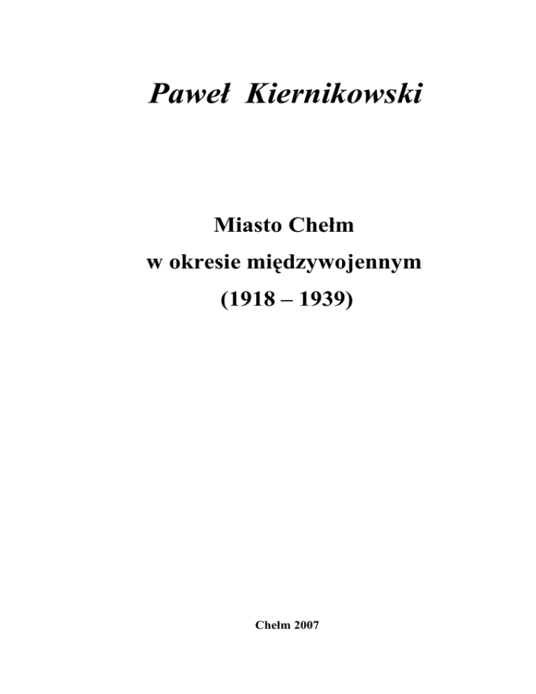 Paweł Kiernikowski Miasto Chełm w okresie międzywojennym (1918 – 1939) Chełm 2007 Rodzinie mojej Poświęcam ADRES REDAKCJI Stowarzyszenie Rocznik Chełmski 22-100 Chełm, ul. Hrubieszowska 102 tel. 0-82 560-40-50, fax 0-82 560-31-11 Wydawnictwo wsparli finansowo: 1. Urząd Miejski w Chełmie 2. Miejskie Przedsiębiorstwo Gospodarki Komunalnej w Chełmie 3. Miejskie Przedsiębiorstwo Robót Drogowych Sp. z o. o. w Chełmie 4. Przedsiębiorstwo Usług Mieszkaniowych Sp. z o.o. w Chełmie 5. Przedsiębiorstwo Targowiska Miejskie Sp. z o.o. w Chełmie 6. Rozalia i Józef Szafrankowie 7. Irena Smulkowska 8. Andrzej Santor 9. Zdzisław Zalewa 10. Stanisław Łukaszewski 11. Edward Hołub Copyright by Stowarzyszenie Rocznik Chełmski ISBN serii 978-83-922585-0-6 ISBN tomu 978-83-922585-1-3 Druk ALF-GRAF Lublin, ul. Kościuszki 4, tel. 081 532 15 12
