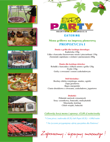 CATERING Menu grillowe na imprezę plenerową PROPOZYCJA I Dania z grilla dla każdego dorosłego: Karkówka 150g Udko z kurczaka faszerowane serem i pieczarkami 130g Ziemniaki zapiekane z ziołami i parmezanem 200g Dania dla każdego dziecka: Roladki z kurczaka z żółtym serem z grilla 120g Frytki 150g Gofry z owocami i sosem czekoladowym Stół biesiadny: Bochny chleba wiejskiego, smalec, ogórki Zupa grochowa Bigos staropolski Ciasto drożdżowe z owocami, czekoladowe, jogurtowe Dodatki: Półmiski surówek wiosennych Sosy: czosnkowy, francuski, meksykański Musztarda, ketchup Chleb wiejski, bułeczki Całkowity koszt menu i oprawy: 45,00 zł netto/osobę . * Cena piwa z nalewaka (0,5L) lub Pepsi (0,5L) - 4,00zł netto * Na życzenie przygotujemy ofertę specjalnie dla Państwa! Zapraszamy i życzymy smacznego ! CATERING Menu grillowe na imprezę plenerową PROPOZYCJA II Dania z grilla dla każdego dorosłego: Karkówka 150g Przysmak węgierski 130g Filet z pstrąga w ziołach 120g Ziemniaki zapiekane z ziołami i parmezanem 200g Dania dla każdego dziecka: Nuggetsy drobiowe 100g Roladki z kurczaka z żółtym serem z grilla 120g Frytki 150g Banany grillowane z brzoskwinią w sosie pomarańczowym Stół biesiadny: Bochny chleba wiejskiego, smalec, ogórki Żurek polski z białą kiełbasą Pierogi podpiekane z serem żółtym i pieczarkami Bigos staropolski Ciasto drożdżowe z owocami, czekoladowe, jogurtowe Dodatki: Półmiski surówek wiosennych Sosy: czosnkowy, francuski, meksykański Musztarda, ketchup Chleb wiejski, bułeczki Całkowity koszt menu i oprawy: 57,00 zł netto/osobę . * Cena piwa z nalewaka (0,5L) lub Pepsi (0,5L) - 4,00zł netto * Na życzenie przygotujemy ofertę specjalnie dla Państwa! Zapraszamy i życzymy smacznego ! CATERING Menu grillowe na imprezę plenerową PROPOZYCJA III Dania z grilla dla każdego: Kiełbasa włoska 150g Karkówka 150g Stół biesiadny: Bochny chleba wiejskiego, smalec, ogórki Chłodnik litewski Bigos staropolski Ciasto drożdżowe z owocami, czekoladowe, jogurtowe Dodatki: Półmiski surówek wiosennych Sosy: czosnkowy, francuski, meksykański Musztarda, ketchup Chleb wiejski, bułeczki Całkowity koszt menu i oprawy: 39,00 zł netto/osobę * Cena piwa z nalewaka (0,5L) lub Pepsi (0,5L) - 4,00zł netto * Na życzenie przygotujemy ofertę specjalnie dla Państwa! Zapraszamy i życzymy smacznego !