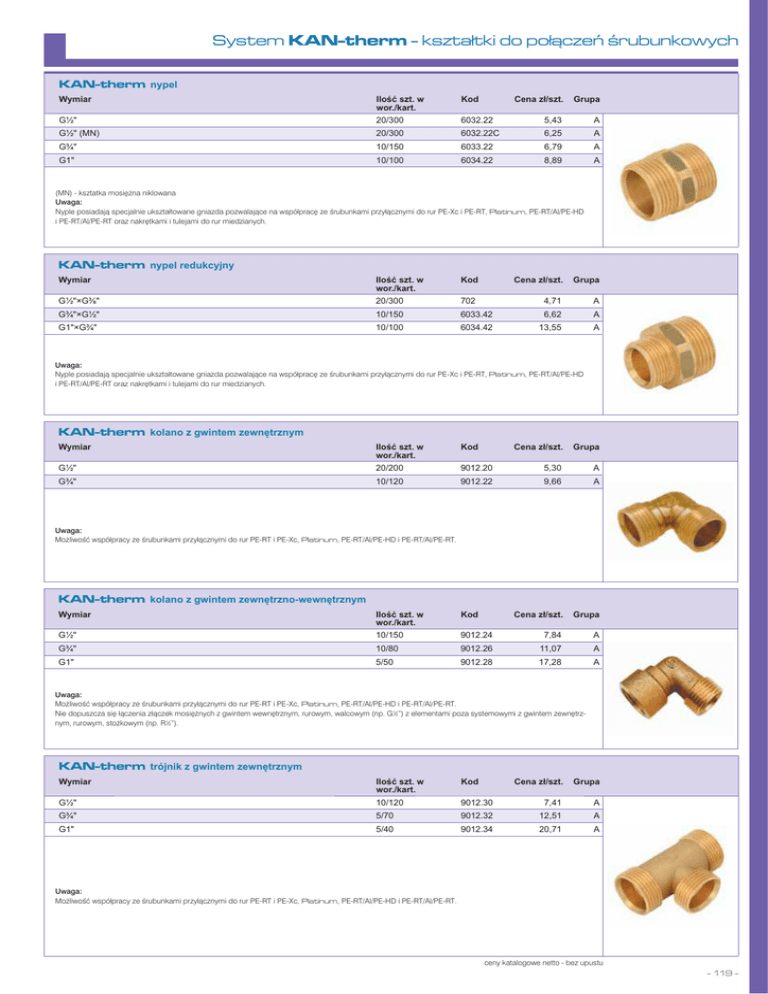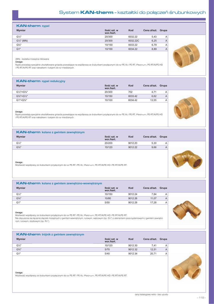 System KAN-therm - kształtki do połączeń śrubunkowych KAN-therm nypel #$2 2$2 #$2 ;[\ 20/300 6032.22 K(OJ A ;[\ d29k 20/300 6032.22C Q(IK A ;]\ 10/150 6033.22 Q(UV A ;G\ 10/100 6034.22 L(LV A (MN) - ksztatka mosiężna niklowana Uwaga: Nyple posiadają specjalnie ukształtowane gniazda pozwalające na współpracę ze śrubunkami przyłącznymi do rur PE-Xc i PE-RT, Platinum, PE-RT/Al/PE-HD i PE-RT/Al/PE-RT oraz nakrętkami i tulejami do rur miedzianych. KAN-therm & #$2 2$2 #$2 ;[\M;\ 20/300 702 O(UG A ;]\M;[\ 10/150 6033.42 Q(QI A ;G\M;]\ 10/100 6034.42 GJ(KK A Uwaga: Nyple posiadają specjalnie ukształtowane gniazda pozwalające na współpracę ze śrubunkami przyłącznymi do rur PE-Xc i PE-RT, Platinum, PE-RT/Al/PE-HD i PE-RT/Al/PE-RT oraz nakrętkami i tulejami do rur miedzianych. KAN-therm '$3$ #$2 2$2 #$2 ;[\ 20/200 VNGI+IN K(JN A ;]\ 10/120 VNGI+II V(QQ A Uwaga: Możliwość współpracy ze śrubunkami przyłącznymi do rur PE-RT i PE-Xc, Platinum, PE-RT/Al/PE-HD i PE-RT/Al/PE-RT. KAN-therm '$3$!3$ #$2 2$2 #$2 ;[\ 10/150 VNGI+IO U(LO A ;]\ 10/80 VNGI+IQ GG(NU A ;G\ 5/50 VNGI+IL GU(IL A Uwaga: Możliwość współpracy ze śrubunkami przyłącznymi do rur PE-RT i PE-Xc, Platinum, PE-RT/Al/PE-HD i PE-RT/Al/PE-RT. Nie dopuszcza się łączenia złączek mosiężnych z gwintem wewnętrznym, rurowym, walcowym (np. G½”) z elementami poza systemowymi z gwintem zewnętrznym, rurowym, stożkowym (np. R½”). KAN-therm $5&'$3$ #$2 2$2 #$2 ;[\ 10/120 VNGI+JN U(OG A ;]\ 5/70 VNGI+JI GI(KG A ;G\ 5/40 VNGI+JO IN(UG A Uwaga: Możliwość współpracy ze śrubunkami przyłącznymi do rur PE-RT i PE-Xc, Platinum, PE-RT/Al/PE-HD i PE-RT/Al/PE-RT. ** dostępność według indywidualnych ustaleń ceny katalogowe netto - bez upustu - 119 - System KAN-therm - kształtki do połączeń śrubunkowych KAN-therm $5&'$222 #$2 2$2 #$2 ;]\M;[\M;]\ 5/70 VNGI+JQ GJ(QV A ;G\M;[\M;G\ 5/40 VNGI+JL GN(KV A ;G\M;]\M;G\ 5/40 VNGI+ON GN(JI A Uwaga: Możliwość współpracy ze śrubunka mi przyłącznymi do rur PE-RT i PE-Xc, Platinum, PE-RT/Al/PE-HD i PE-RT/Al/PE-RT. Nie dopuszcza się łączenia złączek mosiężnych z gwintem wewnętrznym, rurowym, walcowym (np. G½”) z elementami poza systemowymi z gwintem zewnętrznym, rurowym, stożkowym (np. R½”). KAN-therm $#39[\]^[ ;GqM;]q #$2 2$2 #$2 5/60 VNJI+NI GQ(IL A KAN-therm &B$#4'$3$4$5$ ;[qM;]q #$2 2$2 #$2 5/60 VNGU+GQN GJ(GU A Uwaga: Możliwość współpracy ze śrubunkami przyłącznymi do rur PE-RT i PE-Xc, Platinum, PE-RT/Al/PE-HD i PE-RT/Al/PE-RT. Nie dopuszcza się łączenia podejść do baterii z gwintem wewnętrznym, rurowym, walcowym (np. G½”) z elementami poza systemowymi z gwintem zewnętrznym, rurowym, stożkowym (np. R½”). Podejście do baterii sprzedawane jest w komplecie z korkiem tworzywowym krótkim. Korek tworzywowy krótki przeznaczony jest tylko i wyłącznie do wykonania próby szczelności instalacji. KAN-therm &B$4'$3$4$5$ ;[q #$2 2$2 #$2 5/70 VNGU+GLN GN(GJ A Uwaga: Możliwość współpracy ze śrubunka mi przyłącznymi do rur PE-RT i PE-Xc, PE-RT/Al/PE-HD i PE-RT/Al/PE-RT. Nie dopuszcza się łączenia podejść do baterii z gwintem wewnętrznym, rurowym, walcowym (np. G½”) z elementami poza systemowymi z gwintem zewnętrznym, rurowym, stożkowym (np. R½”). Podejście do baterii sprzedawane jest w komplecie ze śrubką montażową i korkiem tworzywowym krótkim. Korek tworzywowy krótki przeznaczony jest tylko i wyłącznie do wykonania próby szczelności instalacji. KAN-therm &B$#4'$3$4$5$ ;[q #$2 2$2 #$2 5/60 VNGU+INN GI(VL A Uwaga: Możliwość współpracy ze śrubunkami przyłącznymi do rur PE-RT i PE-Xc, Platinum PE-RT/Al/PE-HD i PE-RT/Al/PE-RT. Nie dopuszcza się łączenia podejść do baterii z gwintem wewnętrznym, rurowym, walcowym (np. G½”) z elementami poza systemowymi z gwintem zewnętrznym, rurowym, stożkowym (np. R½”). Podejście do baterii sprzedawane jest w komplecie ze śrubką montażową i korkiem tworzywowym krótkim. Korek tworzywowy krótki przeznaczony jest tylko i wyłącznie do wykonania próby szczelności instalacji. ceny katalogowe netto - bez upustu - 120 - System KAN-therm - kształtki do połączeń śrubunkowych KAN-therm &B$$4'$3$4$5$ ;[q #$2 2$2 #$2 5/60 VNGU+IIN GG(UN A Uwaga: Możliwość współpracy ze śrubunkami przyłącznymi do rur PE-RT i PE-Xc, PE-RT/Al/PE-HD i PE-RT/Al/PE-RT. Nie dopuszcza się łączenia podejść do baterii z gwintem wewnętrznym, rurowym, walcowym (np. G½”) z elementami poza systemowymi z gwintem zewnętrznym, rurowym, stożkowym (np. R½”). Podejście do baterii sprzedawane jest w komplecie ze śrubką montażową i korkiem tworzywowym krótkim. Korek tworzywowy krótki przeznaczony jest tylko i wyłącznie do wykonania próby szczelności instalacji. KAN-therm $5B# !5$! $## ;[q #$2 2$2 #$2 20/300 QNVK+JJ N(VL A Uwaga: Korek tworzywowy krótki przeznaczony jest tylko i wyłącznie do wykonania próby szczelności instalacji. Korek posiada własne uszczelnienie (O-Ring). KAN-therm B$&B$! $## #$2 2$2 #$2 100/2000 K-505100 N(OO A Uwaga: Łączy płytkę montażową z podejściami do baterii. KAN-therm :9; #$2 2$2 #$2 ;]\ d29k ` IIN 20 VNGQ+II GV(GJ A ;[\ d29k ` GNN 70 4400.30 GO(NI A ` && (MN) - kształtka mosiężna wersja niklowana Uwaga: Na specjalne zamówienie (termin realizacji do 3 tygodni). Możliwość współpracy ze śrubunkami przyłącznymi do rur PE-RT i PE-Xc, Platinum, PE-RT/Al/PE-HD i PE-RT/Al/PE-RT. Warianty podłączeń kształtek z rurkami niklowanymi z wszelkiego rodzaju armaturą opisane są w części technicznej katalogu - „Montaż złącz skręcanych”. ceny katalogowe netto - bez upustu - 121 - System KAN-therm - kształtki do łączenia rurek niklowanych Ø15 KAN-therm B3^[ FGK ;]q #$2 2$2 #$2 15/150 VNIJ+NL U(KV A Uwaga: Współpracuje z kształtkami do połączeń śrubunkowych z gwintami zewnętrznymi oraz grzejnikowymi zaworami zespolonymi. NOWOŚĆ KAN-therm # B FGK ;]q #$2 2$2 #$2 15/150 VNIJ+GN 