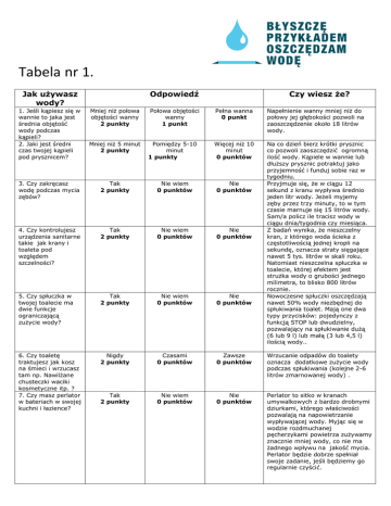 Tabela nr 1. Jak używasz wody? 1. Jeśli kąpiesz się w wannie to jaka jest średnia objętość wody podczas kąpieli? 2. Jaki jest średni czas twojej kąpieli pod prysznicem? Odpowiedź Mniej niż połowa objętości wanny 2 punkty Mniej niż 5 minut 2 punkty Połowa objętości wanny 1 punkt Pomiędzy 5-10 minut 1 punkty Czy wiesz że? Pełna wanna 0 punkt Napełnienie wanny mniej niż do połowy jej głębokości pozwoli na zaoszczędzenie około 18 litrów wody. Więcej niż 10 minut 0 punktów Na co dzień bierz krótki prysznic co pozwoli zaoszczędzić ogromną ilość wody. Kąpiele w wannie lub dłuższy prysznic potraktuj jako przyjemność i funduj sobie raz w tygodniu. Przyjmuje się, że w ciągu 12 sekund z kranu wypływa średnio jeden litr wody. Jeżeli myjemy zęby przez trzy minuty, to w tym czasie marnuje się 15 litrów wody. Sam/a policz ile tracisz wody w ciągu dnia/tygodnia czy miesiąca. Z badań wynika, że nieszczelny kran, z którego woda ścieka z częstotliwością jednej kropli na sekundę, oznacza straty sięgające nawet 5 tys. litrów w skali roku. Natomiast nieszczelna spłuczka w toalecie, której efektem jest strużka wody o grubości jednego milimetra, to blisko 800 litrów rocznie. Nowoczesne spłuczki oszczędzają nawet 50% wody niezbędnej do spłukiwania toalet. Mają one dwa typy przycisków: pojedynczy z funkcją STOP lub dwudzielny, pozwalający na spłukiwanie dużą (6 lub 9 l) lub małą (3 lub 4,5 l) ilością wody.. 3. Czy zakręcasz wodę podczas mycia zębów? Tak 2 punkty Nie wiem 0 punktów Nie 0 punktów 4. Czy kontrolujesz urządzenia sanitarne takie jak krany i toaleta pod względem szczelności? Tak 2 punkty Nie wiem 0 punktów Nie 0 punktów 5. Czy spłuczka w twojej toalecie ma dwie funkcje ograniczającą zużycie wody? Tak 2 punkty Nie wiem 0 punktów Nie 0 punktów 6. Czy toaletę traktujesz jak kosz na śmieci i wrzucasz tam np. Nawilżane chusteczki waciki kosmetyczne itp. ? 7. Czy masz perlator w bateriach w swojej kuchni i łazience? Nigdy 2 punkty Czasami 0 punktów Zawsze 0 punktów Wrzucanie odpadów do toalety oznacza dodatkowe zużycie wody podczas spłukiwania (kolejne 2-6 litrów zmarnowanej wody) . Tak 2 punkty Nie wiem 0 punktów Nie 0 punktów Perlator to sitko w kranach umywalkowych z bardzo drobnymi dziurkami, którego właściwości pozwalają na napowietrzanie wypływającej wody. Myjąc się w wodzie rozdmuchanej pęcherzykami powietrza zużywamy znacznie mniej wody, co nie ma żadnego wpływu na jakość mycia. Perlator będzie dobrze spełniał swoje zadanie, jeśli będziemy go regularnie czyścić. 8. W jaki sposób myjesz naczynia w zlewie? Używam dwóch komór zlewozmywaka w jednym myję w drugim pukam naczynia 2 punkty Umyty naczynia płukań pod wodą bieżącą (woda płynie stałym strumieniem) 1 punkt Myje i płukań naczynia pod bieżącą wodą (woda nieustanie płynie z kranu) 0 punktów 9. Kiedy zmywasz naczynia w zmywarce, urządzenie jest: Zapełnione częściowo 0 punktów Zapełnione do połowy 1 punkt Pełne 2 punkty 10. Jak robisz pranie w pralce automatycznej to: Zdarza mi sie prać pojedyncze ubrania 0 punktów Zawsze piorę pełną pralkę ubrań 2 punkty Poczekaj z praniem aż pralka będzie pełna. Jeśli pralka posiadaużywaj programów oszczędnych dla prania lekko zabrudzonego. 11. Czy trawnik jest podlewany tylko wtedy jeśli tego potrzeba? Tak 2 punkty Staram się załadować minimum połowę pralki 1 punkt Nie wiem 0 punktów Nie 0 punktów Dostosuj harmonogram podlewania trawnika do pory roku. Najlepiej korzystaj z wody deszczowej. O dowolnej porze dnia 1 punkt W południe 0 punktów Podlewanie w chłodniejszych porach dnia (rano lub wieczorem) zmniejsza ilość wody, która jest tracona poprzez odparowanie. Przy użyciu węża ogrodowego z rozpylaczem z funkcją włączenia i wyłączenia wody 0 punktów Odwiedzam myjnię 2 punkty Myjnie samochodowe wyposażone są w zamknięty obieg wody, która jest oczyszczana i wykorzystywana wielokrotnie. Zmniejsza to zużycie bieżącej wody, oraz minimalizuje negatywny wpływ ścieków na środowisko. 12. O jakiej porze dnia podlewasz trawnik/ rośliny? 13. W jaki sposób myjesz samochód? Wczesnym rankiem lub późnym wieczorek 2 punkty Używając wiadra z wodą 0 punków Nie zmywaj pojedynczych naczyń. Poczekaj aż uzbiera się ich więcej następnie napełnij zbiorniki zlewozmywaka wodą. W jednym umyj naczynia wodą z płynem a w drugim opłukuj je czystą wodą. Jeśli planujesz zakup zmywarki – to dobry pomysł tylko pamiętaj aby wybrać taką z dobrą klasą energetyczną. Zaczekaj aż uzbierasz pełną zmywarkę naczyń, następnie dostosuj program do zabrudzenia i rodzaju naczyń. Jaki jest Twój wynik? 20 – 26: Wspaniale! Oszczędzasz codziennie kilkaset litrów wody. Podziel się swoimi nawykami z rodzina przyjaciółmi aby i oni mogli błyszczeć przykładem. 10 - 19: Jest Dobrze! Przeczytaj dobre rady z ankiety i postaraj się zastosować co najmniej dwie w swoim codziennym życiu w tym miesiącu i kolejne dwie w kolejnym a z pewnością zauważysz różnice w zużyciu wody i w swoich rachunkach. 0-9 Wymaga poprawy! Przeczytaj dobre rady z ankiety i zastosuj trzy w tym miesiącu i kolejne trzy w kolejnym. Z pewnością zauważysz różnicę w zużyciu wody i w rachunkach za wodę.
