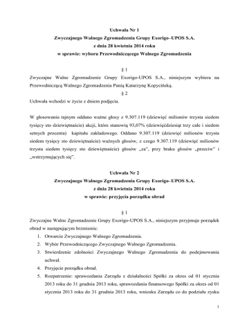 Uchwała Nr 1 Zwyczajnego Walnego Zgromadzenia Grupy Exorigo–UPOS S.A. z dnia 28 kwietnia 2014 roku w sprawie: wyboru Przewodniczącego Walnego Zgromadzenia §1 Zwyczajne Walne Zgromadzenie Grupy Exorigo-UPOS S.A., niniejszym wybiera na Przewodniczącą Walnego Zgromadzenia Panią Katarzynę Kopycińską. §2 Uchwała wchodzi w życie z dniem podjęcia. W głosowaniu tajnym oddano ważne głosy z 9.307.119 (dziewięć milionów trzysta siedem tysięcy sto dziewiętnaście) akcji, które stanowią 93,07% (dziewięćdziesiąt trzy całe i siedem setnych procenta) kapitału zakładowego. Oddano 9.307.119 (dziewięć milionów trzysta siedem tysięcy sto dziewiętnaście) ważnych głosów, z czego 9.307.119 (dziewięć milionów trzysta siedem tysięcy sto dziewiętnaście) głosów „za”, przy braku głosów „przeciw” i „wstrzymujących się”. Uchwała Nr 2 Zwyczajnego Walnego Zgromadzenia Grupy Exorigo–UPOS S.A. z dnia 28 kwietnia 2014 roku w sprawie: przyjęcia porządku obrad §1 Zwyczajne Walne Zgromadzenie Grupy Exorigo-UPOS S.A., niniejszym przyjmuje porządek obrad w następującym brzmieniu: 1. Otwarcie Zwyczajnego Walnego Zgromadzenia. 2. Wybór Przewodniczącego Zwyczajnego Walnego Zgromadzenia. 3. Stwierdzenie zdolności Zwyczajnego Walnego Zgromadzenia do podejmowania uchwał. 4. Przyjęcie porządku obrad. 5. Rozpatrzenie: sprawozdania Zarządu z działalności Spółki za okres od 01 stycznia 2013 roku do 31 grudnia 2013 roku, sprawozdania finansowego Spółki za okres od 01 stycznia 2013 roku do 31 grudnia 2013 roku, wniosku Zarządu co do podziału zysku 1 za okres od 01 stycznia 2013 roku do 31 grudnia 2013 roku oraz sprawozdania Rady Nadzorczej z wyników oceny w/w sprawozdań i wniosku Zarządu. 6. Podjęcie uchwał w sprawie: a) zatwierdzenia sprawozdania Zarządu z działalności Spółki za okres od 01 stycznia 2013 roku do 31 grudnia 2013 roku, b) zatwierdzenia sprawozdania finansowego Spółki za okres od 01 stycznia 2013 roku do 31 grudnia 2013 roku, c) podziału zysku za okres od 01 stycznia 2013 roku do 31 grudnia 2013 roku, d) udzielenia członkom organów Spółki absolutorium z wykonania przez nich obowiązków za okres od 01 stycznia 2013 roku do 31 grudnia 2013 roku. 7. Zamknięcie Zwyczajnego Walnego Zgromadzenia. §2 Uchwała wchodzi w życie z dniem podjęcia. W głosowaniu jawnym oddano ważne głosy z 9.307.119 (dziewięć milionów trzysta siedem tysięcy sto dziewiętnaście) akcji, które stanowią 93,07% (dziewięćdziesiąt trzy całe i siedem setnych procenta) kapitału zakładowego. Oddano 9.307.119 (dziewięć milionów trzysta siedem tysięcy sto dziewiętnaście) ważnych głosów, z czego 9.307.119 (dziewięć milionów trzysta siedem tysięcy sto dziewiętnaście) głosów „za”, przy braku głosów „przeciw” i „wstrzymujących się”. Uchwała Nr 3 Zwyczajnego Walnego Zgromadzenia Grupy Exorigo–UPOS S.A. z dnia 28 kwietnia 2014 roku w sprawie: zatwierdzenia sprawozdania Zarządu z działalności Spółki za okres od dnia 01 stycznia 2013 roku do dnia 31 grudnia 2013 roku Zwyczajne Walne Zgromadzenie Grupy Exorigo–UPOS S.A. działając na podstawie art. 395 § 2 pkt 1 Kodeksu Spółek Handlowych, niniejszym uchwala co następuje: §1 Zwyczajne Walne Zgromadzenie Grupy Exorigo–UPOS S.A. niniejszym zatwierdza sprawozdanie Zarządu z działalności Spółki za okres od dnia 01 stycznia 2013 roku do dnia 31 grudnia 2013 roku. §2 2 Uchwała wchodzi w życie z dniem podjęcia. W głosowaniu jawnym oddano ważne głosy z 9.307.119 (dziewięć milionów trzysta siedem tysięcy sto dziewiętnaście) akcji, które stanowią 93,07% (dziewięćdziesiąt trzy całe i siedem setnych procenta) kapitału zakładowego. Oddano 9.307.119 (dziewięć milionów trzysta siedem tysięcy sto dziewiętnaście) ważnych głosów, z czego 9.307.119 (dziewięć milionów trzysta siedem tysięcy sto dziewiętnaście) głosów „za”, przy braku głosów „przeciw” i „wstrzymujących się”. Uchwała Nr 4 Zwyczajnego Walnego Zgromadzenia Grupy Exorigo–UPOS S.A. z dnia 28 kwietnia 2014 roku w sprawie: zatwierdzenia sprawozdania finansowego Spółki za okres od dnia 01 stycznia 2013 roku do dnia 31 grudnia 2013 roku Zwyczajne Walne Zgromadzenie Grupy Exorigo–UPOS S.A. działając na podstawie art. 395 § 2 pkt 1 Kodeksu Spółek Handlowych, niniejszym uchwala co następuje: §1 Zwyczajne Walne Zgromadzenie Grupy Exorigo–UPOS S.A. niniejszym zatwierdza sprawozdanie finansowe Spółki za okres od dnia 01 stycznia 2013 roku do dnia 31 grudnia 2013 roku obejmujące: - wprowadzenie do sprawozdania finansowego; - bilans sporządzony na dzień 31 grudnia 2013 roku wykazujący po stronie aktywów i pasywów sumę 82.086.513,47 zł (osiemdziesiąt dwa miliony osiemdziesiąt sześć tysięcy pięćset trzynaście złotych czterdzieści siedem groszy); - rachunek zysków i strat za okres od 01 stycznia 2013 roku do 31 grudnia 2013 roku wykazujący zysk netto w kwocie 10.470.065,80 zł (dziesięć milionów czterysta siedemdziesiąt tysięcy sześćdziesiąt pięć złotych osiemdziesiąt groszy); - zestawienie zmian w kapitale własnym za okres od 01 stycznia 2013 roku do 31 grudnia 2013 roku wykazujące zwiększenie stanu kapitału własnego o kwotę 6.270.065,80 zł (sześć milionów dwieście siedemdziesiąt tysięcy sześćdziesiąt pięć złotych osiemdziesiąt groszy); 3 - rachunek przepływów pieniężnych za okres od 01 stycznia 2013 roku do 31 grudnia 2013 roku wykazujący zwiększenie stanu środków pieniężnych netto na sumę 145.207,78 zł (sto czterdzieści pięć tysięcy dwieście siedem złotych siedemdziesiąt osiem groszy); - dodatkowe informacje i objaśnienia. §2 Uchwała wchodzi w życie z dniem podjęcia. W głosowaniu jawnym oddano ważne głosy z 9.307.119 (dziewięć milionów trzysta siedem tysięcy sto dziewiętnaście) akcji, które stanowią 93,07% (dziewięćdziesiąt trzy całe i siedem setnych procent