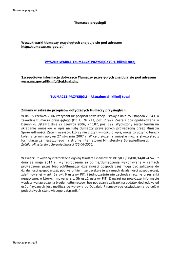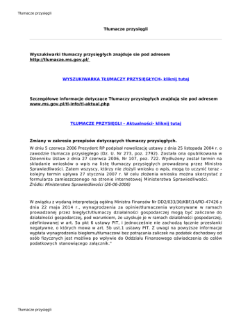 Tłumacze przysięgli Tłumacze przysięgli Wyszukiwarki tłumaczy przysięgłych znajduje sie pod adresem http://tlumacze.ms.gov.pl/ WYSZUKIWARKA TŁUMACZY PRZYSIĘGŁYCH- kliknij tutaj Szczegółowe informacje dotyczące Tłumaczy przysięgłych znajdują sie pod adresem www.ms.gov.pl/tl-info/tl-aktual.php TŁUMACZE PRZYSIĘGLI – Aktualności- kliknij tutaj Zmiany w zakresie przepisów dotyczących tłumaczy przysięgłych. W dniu 5 czerwca 2006 Prezydent RP podpisał nowelizację ustawy z dnia 25 listopada 2004 r. o zawodzie tłumacza przysięgłego (Dz. U. Nr 273, poz. 2792). Została ona opublikowana w Dzienniku Ustaw z dnia 27 czerwca 2006, Nr 107, poz. 722. Wydłużony został termin na składanie wniosków o wpis na listę tłumaczy przysięgłych prowadzoną przez Ministra Sprawiedliwości. Zatem wszyscy, którzy nie złożyli wniosku o wpis, mogą to uczynić teraz kolejny termin upływa 27 stycznia 2007 r. W celu złożenia wniosku można skorzystać z formularza zamieszczonego na stronie internetowej Ministerstwa Sprawiedliwości. Źródło: Ministerstwo Sprawiedliwości (26-06-2006) W związku z wydaną interpretacją ogólną Ministra Finansów Nr DD2/033/30/KBF/14/RD-47426 z dnia 22 maja 2014 r., wynagrodzenia za opinie/tłumaczenia wykonywane w ramach prowadzonej przez biegłych/tłumaczy działalności gospodarczej mogą być zaliczone do działalności gospodarczej, pod warunkiem, że uzyskuje je w ramach działalności gospodarczej, zdefiniowanej w art. 5a pkt 6 ustawy PIT, i jednocześnie nie zachodzą łącznie przesłanki negatywne, o których mowa w art. 5b ust.1 ustawy PIT. Z uwagi na powyższe informacje wypłata wynagrodzenia biegłemu/tłumaczowi bez potrącania zaliczek na podatek dochodowy od osób fizycznych jest możliwa po wpływie do Oddziału Finansowego oświadczenia do celów podatkowych stanowiącego załącznik." Tłumacze przysięgli