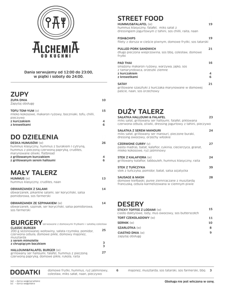 STREET FOOD 0 HUMMUS&FALAFEL (w) hummus klasyczny, falafel, miks sałat z dressingiem jogurtowym z tahini, sos chilli, raita, naan 19 19 FISH&CHIPS lety z dorsza w cieście piwnym, domowe frytki, sos tatarski Dania serwujemy od 12:00 do 23:00, w piątki i soboty do 24:00. ZUPY 0 ZUPA DNIA Zapytaj obsługę 10 TOFU TOM-YUM (v) mleko kokosowe, makaron ryżowy, boczniaki, tofu, chilli, pieczywo z kurczakiem z krewetkami 15 4 6 PULLED PORK SANDWICH długo pieczona wieprzowina, sos bbq, colesław, domowe frytki 21 PAD THAI smażony makaron ryżowy, warzywa, jajko, sos z tamaryndowca, orzeszki ziemne z kurczakiem z krewetkami 16 SATAY grillowane szaszłyki z kurczaka marynowane w domowej paście, naan, sos orzechowy 21 DUŻY TALERZ 0 4 6 SAŁATKA HALLOUMI & FALAFEL 23 miks sałat, grillowany ser halloumi, falafel, piklowana czerwona cebula, oliwki, dressing jogurtowy z tahini, pieczywo SAŁATKA Z SEREM MANOURI miks sałat, grillowany ser manouri, pieczone buraki, dressing owocowy, orzechy włoskie 24 DO DZIELENIA 0 DESKA HUMUSÓW (w) hummus klasyczny, hummus z burakiem I cytryną, hummus z pieczoną czerwoną papryką, crudites, marynowane oliwki, atbread z grillowanym kurczakiem z grillowanym serem halloumi 26 CZERWONE CURRY (v) pasta madras, batat, kala or, cukinia, ciecierzyca, granat, mleko kokosowe, ryż jaśminowy 27 4 6 STEK Z KALAFIORA (w) grillowany kala or, tabbouleh, hummus klasyczny, raita 24 STEK Z TUŃCZYKA stek z tuńczyka, pomidor, batat, salsa azjatycka 39 SAUSAGE & MASH domowe kiełbaski, puree ziemniaczane z musztardą francuską, cebula karmelizowana w ciemnym piwie 28 DESERY 0 STICKY TOFFEE Z LODAMI (w) ciasto daktylowe, lody, mus owocowy, sos butterscotch 15 TORT CZEKOLADOWY (w) 11 SERNIK (w) 10 MAŁY TALERZ 0 HUMMUS (w) hummus klasyczny, crudites, naan 13 OBWARZANEK Z SALAMI obwarzanek, pikantne salami, ser koryciński, salsa pomidorowa, sos farmerski 14 OBWARZANEK ZE SZPINAKIEM (w) obwarzanek, szpinak, ser koryciński, salsa pomidorowa, sos farmerski 14 BURGERY serwowane z domowymi frytkami i sałatką colesław CLASSIC BURGER 200 g sezonowanej wołowiny, sałata rzymska, pomidor, czerwona cebula, domowe pikle, domowy majonez, musztarda z serem mimolette z chrupiącym boczkiem HALLOUMI&FALAFEL BURGER (w) grillowany ser halloumi, falafel, hummus z pieczoną czerwoną papryką, domowe pikle, rukola, raita DODATKI 25 SZARLOTKA (w) 8 CIASTKO DNIA (w) zapytaj obsługę 9 3 3 27 domowe frytki, hummus, ryż jaśminowy, colesław, miks sałat, naan, pieczywo 6 majonez, musztarda, sos tatarski, sos farmerski, bbq 3