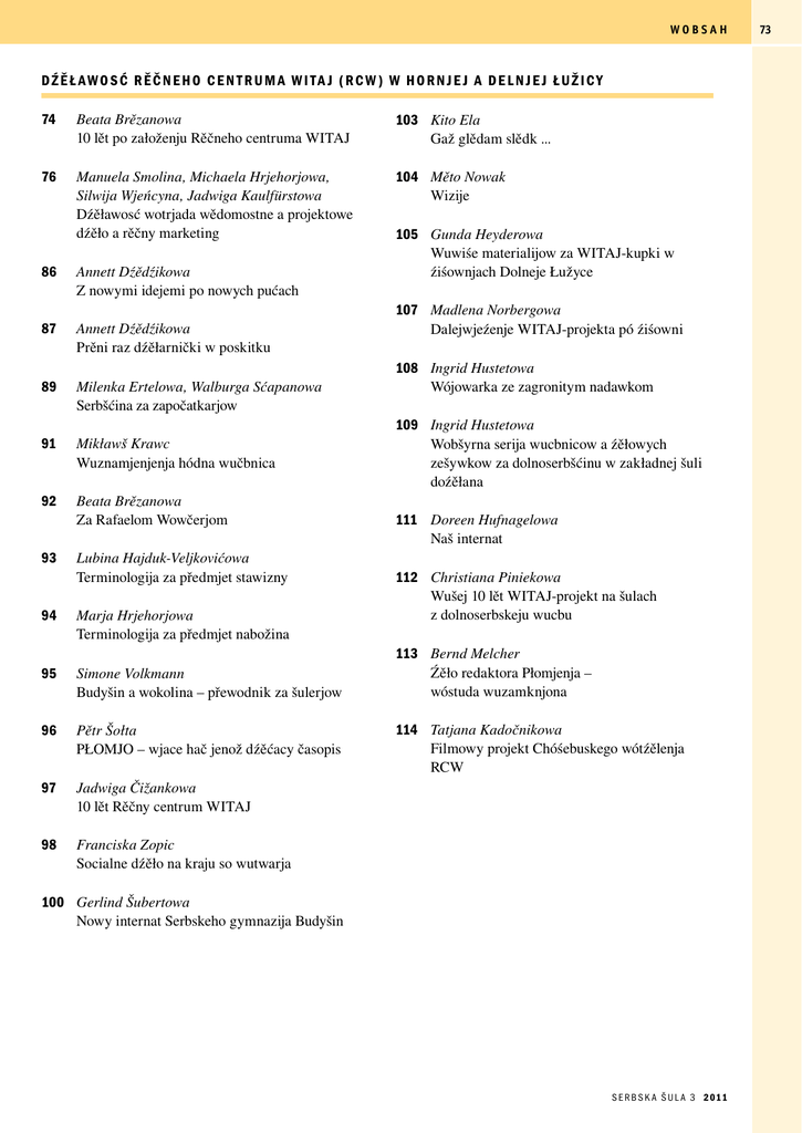 wobsah d ź ě ł a w o s ć r ě č n e h o c e n t r u m a w i t a j ( RCW ) w h o r n j e j a D e l n j e j Ł u ž i c y 74 76 Beata Brězanowa 10 lět po załoženju Rěčneho centruma WITAJ 86 Annett Dźědźikowa Z nowymi idejemi po nowych pućach Manuela Smolina, Michaela Hrjehorjowa, Silwija Wjeńcyna, Jadwiga Kaulfürstowa Dźěławosć wotrjada wědomostne a projektowe dźěło a rěčny marketing 87 Annett Dźědźikowa Prěni raz dźěłarnički w poskitku 89 Milenka Ertelowa, Walburga Sćapanowa Serbšćina za započatkarjow 91 Mikławš Krawc Wuznamjenjenja hódna wučbnica 92 Beata Brězanowa Za Rafaelom Wowčerjom 93 Lubina Hajduk-Veljkovićowa Terminologija za předmjet stawizny 94 Marja Hrjehorjowa Terminologija za předmjet nabožina 95 Simone Volkmann Budyšin a wokolina – přewodnik za šulerjow 96 Pětr Šołta PŁOMJO – wjace hač jenož dźěćacy časopis 97 Jadwiga Čižankowa 10 lět Rěčny centrum WITAJ 98 Franciska Zopic Socialne dźěło na kraju so wutwarja 103 104 Kito Ela Gaž glědam slědk ... 105 107 Gunda Heyderowa Wuwiśe materialijow za WITAJ-kupki w źiśownjach Dolneje Łužyce 108 109 Ingrid Hustetowa Wójowarka ze zagronitym nadawkom 111 112 Doreen Hufnagelowa Naš internat 113 114 Bernd Melcher Źěło redaktora Płomjenja – wóstuda wuzamknjona Měto Nowak Wizije Madlena Norbergowa Dalejwjeźenje WITAJ-projekta pó źiśowni Ingrid Hustetowa Wobšyrna serija wucbnicow a źěłowych zešywkow za dolnoserbšćinu w zakładnej šuli doźěłana Christiana Piniekowa Wušej 10 lět WITAJ-projekt na šulach z dolnoserbskeju wucbu Tatjana Kadočnikowa Filmowy projekt Chóśebuskego wótźělenja RCW 100 Gerlind Šubertowa Nowy internat Serbskeho gymnazija Budyšin s e r b s k a š u l a 3 2 011 73