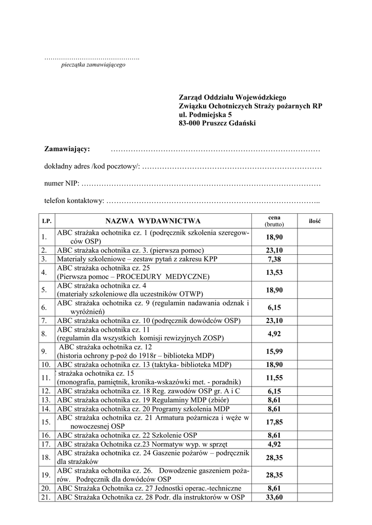 ………………………………………. pieczątka zamawiającego Zarząd Oddziału Wojewódzkiego Związku Ochotniczych Straży pożarnych RP ul. Podmiejska 5 83-000 Pruszcz Gdański Zamawiający: ………………………………………………………………………… dokładny adres /kod pocztowy/: ……………………………………………………………… numer NIP: …………………………………………………………………………………… telefon kontaktowy: ………………………………………………………………………….. LP. NAZWA WYDAWNICTWA ABC strażaka ochotnika cz. 1 (podręcznik szkolenia szeregowców OSP) 2. ABC strażaka ochotnika cz. 3. (pierwsza pomoc) 3. Materiały szkoleniowe – zestaw pytań z zakresu KPP ABC strażaka ochotnika cz. 25 4. (Pierwsza pomoc – PROCEDURY MEDYCZNE) ABC strażaka ochotnika cz. 4 5. (materiały szkoleniowe dla uczestników OTWP) ABC strażaka ochotnika cz. 9 (regulamin nadawania odznak i 6. wyróżnień) 7. ABC strażaka ochotnika cz. 10 (podręcznik dowódców OSP) ABC strażaka ochotnika cz. 11 8. (regulamin dla wszystkich komisji rewizyjnych ZOSP) ABC strażaka ochotnika cz. 12 9. (historia ochrony p-poż do 1918r – biblioteka MDP) 10. ABC strażaka ochotnika cz. 13 (taktyka- biblioteka MDP) ABC strażaka ochotnika cz. 15 11. (monografia, pamiętnik, kronika-wskazówki met. - poradnik) 12. ABC strażaka ochotnika cz. 18 Reg. zawodów OSP gr. A i C 13. ABC strażaka ochotnika cz. 19 Regulaminy MDP (zbiór) 14. ABC strażaka ochotnika cz. 20 Programy szkolenia MDP ABC strażaka ochotnika cz. 21 Armatura pożarnicza i węże w 15. nowoczesnej OSP 16. ABC strażaka ochotnika cz. 22 Szkolenie OSP 17. ABC strażaka Ochotnika cz.23 Normatyw wyp. w sprzęt ABC strażaka ochotnika cz. 24 Gaszenie pożarów – podręcznik 18. dla strażaków ABC strażaka ochotnika cz. 26. Dowodzenie gaszeniem poża19. rów. Podręcznik dla dowódców OSP 20. ABC Strażaka Ochotnika cz. 27 Jednostki operac.-techniczne 21. ABC Strażaka Ochotnika cz. 28 Podr. dla instruktorów w OSP 1. cena (brutto) 18,90 23,10 7,38 13,53 18,90 6,15 23,10 4,92 15,99 18,90 11,55 6,15 8,61 8,61 17,85 8,61 4,92 28,35 28,35 8,61 33,60 ilość 22. 23. 24. 25. 26. 27. 28. 29. 30. 31. 32. 33. 34. 35. 36. 37. 38. 39. 40. 41. 42. 49. 50. 51. 52. 53. Książka raportów podoficera dyżurnego JRG KP PSP (na 1 rok) Książka raportów przebiegu służby oficera operacyjnego KP PSP (na 1 rok) Karta manipulacyjna z przebiegu akcji ratowniczych (370 s.) Dziennik Korespondencyjny (na 1800 poz.) Rejestr przychodzących faxów (na 800 poz.) Książka podziału bojowego (na 6 m-cy) Ewidencja zdarzeń (na ok. 1600 zdarzeń) Książka raportów przebiegu służby dyżurnego operacyjnego PSK (na 6 m-cy) Rozkaz dzienny dowódcy JRG PSP (na 1 rok) Książka skarbnika OSP na rok Książka skarbnika – rejestr składek członkowskich Książka gospodarza OSP Książka pracy OSP Książka naczelnika OSP Książka ewidencji odznaczeń (powiatowe) Książka ewidencji odznaczeń (gminna) Książka działań ratowniczo – gaśniczych dla OSP Książka przychodu i rozchodu paliwa Książka pracy MDP Kategoryzacja jednostek operacyjno- technicznych OSP Wytyczne dot. Komendanta Gminnego Historia OSP woj. pomorskiego na przełomie tysiąclecia ABC Strażaka Ochotnika nr 29 „100 pytań do prawnikaporadnik praktyczny” I cz. ABC Strażaka Ochotnika nr 30 „100 pytań do prawnikaporadnik praktyczny” II cz. Ekwiwalent pieniężny dla członków OSP Koszulki dla dzieci t-shirt (wzrost 122 i 140 cm) zamówienie powyżej 25 sztuk 49,20 49,20 49,20 49,20 22,14 56,58 43,05 56,58 49,20 3,90 2,90 7,38 13,53 13,53 13,53 7,38 7,38 8,61 9,84 1,85 1,23 36,75 42,00 39,90 42,00 15,00 12,00 W cenie wydawnictw uwzględnione koszty wysyłki Wyżej wymienione publikacje można nabyć poprzez Zarządy Oddziałów Wojewódzkich i Biura Terenowe Związku Ochotniczych Straży Pożarnych RP ………………………………………. czytelny podpis zamawiającego