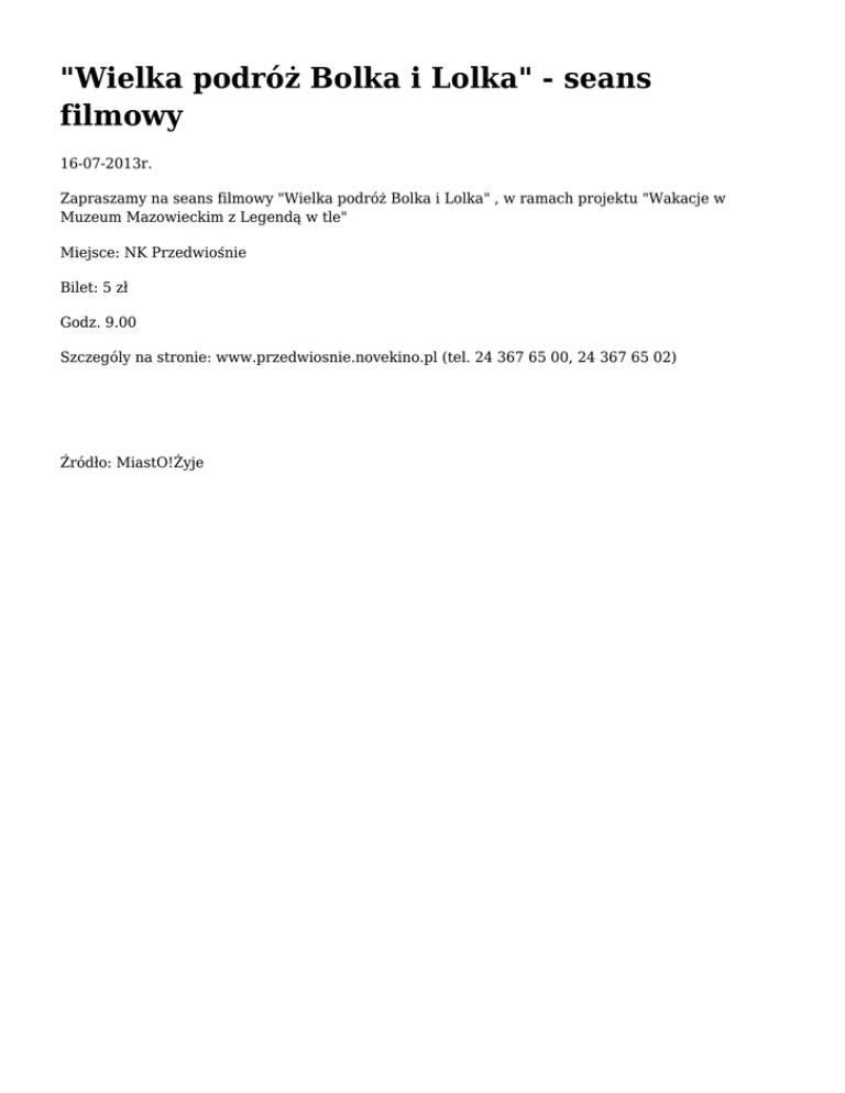 "Wielka podróż Bolka i Lolka" - seans filmowy 16-07-2013r. Zapraszamy na seans filmowy "Wielka podróż Bolka i Lolka" , w ramach projektu "Wakacje w Muzeum Mazowieckim z Legendą w tle" Miejsce: NK Przedwiośnie Bilet: 5 zł Godz. 9.00 Szczególy na stronie: www.przedwiosnie.novekino.pl (tel. 24 367 65 00, 24 367 65 02) Źródło: MiastO!Żyje