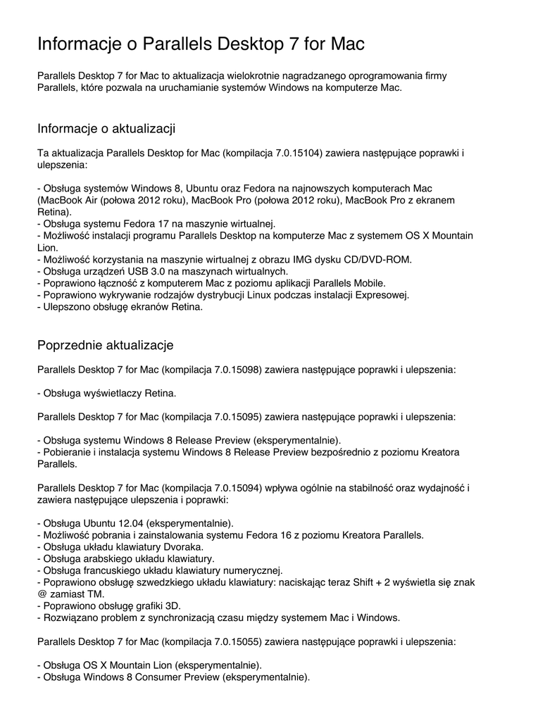 Informacje o Parallels Desktop 7 for Mac Parallels Desktop 7 for Mac to aktualizacja wielokrotnie nagradzanego oprogramowania firmy Parallels, które pozwala na uruchamianie systemów Windows na komputerze Mac. Informacje o aktualizacji Ta aktualizacja Parallels Desktop for Mac (kompilacja 7.0.15104) zawiera następujące poprawki i ulepszenia: - Obsługa systemów Windows 8, Ubuntu oraz Fedora na najnowszych komputerach Mac (MacBook Air (połowa 2012 roku), MacBook Pro (połowa 2012 roku), MacBook Pro z ekranem Retina). - Obsługa systemu Fedora 17 na maszynie wirtualnej. - Możliwość instalacji programu Parallels Desktop na komputerze Mac z systemem OS X Mountain Lion. - Możliwość korzystania na maszynie wirtualnej z obrazu IMG dysku CD/DVD-ROM. - Obsługa urządzeń USB 3.0 na maszynach wirtualnych. - Poprawiono łączność z komputerem Mac z poziomu aplikacji Parallels Mobile. - Poprawiono wykrywanie rodzajów dystrybucji Linux podczas instalacji Expresowej. - Ulepszono obsługę ekranów Retina. Poprzednie aktualizacje Parallels Desktop 7 for Mac (kompilacja 7.0.15098) zawiera następujące poprawki i ulepszenia: - Obsługa wyświetlaczy Retina. Parallels Desktop 7 for Mac (kompilacja 7.0.15095) zawiera następujące poprawki i ulepszenia: - Obsługa systemu Windows 8 Release Preview (eksperymentalnie). - Pobieranie i instalacja systemu Windows 8 Release Preview bezpośrednio z poziomu Kreatora Parallels. Parallels Desktop 7 for Mac (kompilacja 7.0.15094) wpływa ogólnie na stabilność oraz wydajność i zawiera następujące ulepszenia i poprawki: - Obsługa Ubuntu 12.04 (eksperymentalnie). - Możliwość pobrania i zainstalowania systemu Fedora 16 z poziomu Kreatora Parallels. - Obsługa układu klawiatury Dvoraka. - Obsługa arabskiego układu klawiatury. - Obsługa francuskiego układu klawiatury numerycznej. - Poprawiono obsługę szwedzkiego układu klawiatury: naciskając teraz Shift + 2 wyświetla się znak @ zamiast TM. - Poprawiono obsługę grafiki 3D. - Rozwiązano problem z synchronizacją czasu między systemem Mac i Windows. Parallels Desktop 7 for Mac (kompilacja 7.0.15055) zawiera następujące poprawki i ulepszenia: - Obsługa OS X Mountain Lion (eksperymentalnie). - Obsługa Windows 8 Consumer Preview (eksperymentalnie). - Możliwość pobrania i zainstalowania systemu Windows 8 Consumer Preview z poziomu Kreatora Parallels. Parallels Desktop 7 for Mac (kompilacja 7.0.15054) zawiera następujące poprawki i ulepszenia: - Poprawiono obsługę maszyn wirtualnych Fedora 15. - Poprawiono obsługę sieci dla maszyn wirtualnych Ubuntu 12.04 Alpha. Parallels Desktop 7 for Mac (build 7.0.15052) zawiera następujące poprawki i ulepszenia: - Poprawiono zgodność z Launchpad systemu Mac OS X v10.7.2 - Poprawiono stabilność sieci. - Rozwiązano problem wznawiania maszyny wirtualnej Linux w przypadku gdy system Mac powracał ze stanu uśpienia. Parallels Desktop 7 for Mac (kompilacja 7.0.15050) poprawia problemy związane ze stabilnością i wydajnością aplikacji a także zawiera następujące poprawki i ulepszenia: - Możliwość pobrania i zainstalowania systemu Windows 8 Developer Preview z poziomu Kreatora Parallels. - Możliwość zainstalowania systemu Mac OS X Lion za pomocą aplikacji Install Lion. - Obsługa Ubuntu 11.10. - Nowa opcja pozwalająca na skalowanie ekranu maszyny wirtualnej do rozmiaru obszaru widocznego bez zmiany rozdzielczości. - Poprawiono obsługę układów klawiatur innych niż angielskie. - Rozwiązano problem z Apple USB Ethernet Adapter, który zrywał połączenie w Mac OS. - Poprawiono migrację najnowszych dystrybucji systemu Linux z komputera PC do maszyny wirtualnej na komputerze Mac. Parallels Desktop 7 for Mac (kompilacja 7.0.14924) poprawia ogólną wydajność i stabilność aplikacji a także zawiera następujące poprawki i ulepszenia: - Dodano obsługę systemu Windows 8 Beta. - Poprawiono kompatybilność z Quicken 2011. - Poprawiono obsługę Autodesk 3ds Max 2012. - Dodano optymalizację wykorzystania CPU gdy Parallels Desktop jest w stanie bezczynności. Parallels Desktop 7 for Mac (kompilacja 7.0.14922) poprawia ogólną wydajność i stabilność aplikacji a także zawiera następujące poprawki i ulepszenia: - Dodano nowe języki interfejsu, w tym Czeski, Portugalski, Chiński uproszczony i Chiński tradycyjny. - Dodano opcję pozwalającą na wybór trybu pełnoekranowego w stylu Mac OS X Snow Leopard zamiast natywnego trybu pełnoekranowego OS X Lion. - Poprawiono kompatybilność z FileVault. - Poprawiono kompatybilność z urządzeniem FaceTime HD camera i innymi urządzeniami USB dla maszyn wirtualnych z ponad 2GB pamięci RAM. - Rozwiązano problem z powolnym uruchamianiem komputera Mac. Nowości w Parallels Desktop 7 Parallels Desktop 7 for Mac zawiera następujące nowe funkcje i ulepszenia: Kompatybilność z Mac OS X Lion - Obsługa aplikacji pełnoekranowych wprowadzonych w OS X Lion. - Integracja z Launchpad: możliwość dodawania programów Windows do Launchpada i uruchamiania programów z folderów. - Animacje w stylu OS X Lion podczas uruchamiania nowych programów Windows w trybie Koherencji. - Obsługa Wznawiania wprowadzonego w systemie Mac OS X Lion. - Możliwość instalacji systemu Mac OS X Lion na maszynie wirtualnej. - Możliwość tworzenia maszyn wirtualnych Mac OS X Lion za pośrednictwem partycji przywracania na komputerach Mac z systemem Mac OS X Lion. Funkcjonalność - Całkiem nowy Kreator Parallels, który pozwala na tworzenie i importowanie maszyn wirtualnych, migrację danych ze zdalnych komputerów PC, korzystanie z Boot Camp oraz pobieranie bezpłatnych i gotowych do użycia maszyn wirtualnych z systemami Ubuntu, Fedora lub Chrome OS. - System Windows może być teraz zakupiony i pobrany bezpośrednio z poziomu Kreatora Parallels (tylko w Stanach Zjednoczonych i Kanadzie). - Sklep Parallels to najprostszy sposób, aby zakupić przydatne aplikacje zarówno na system Mac i Wind