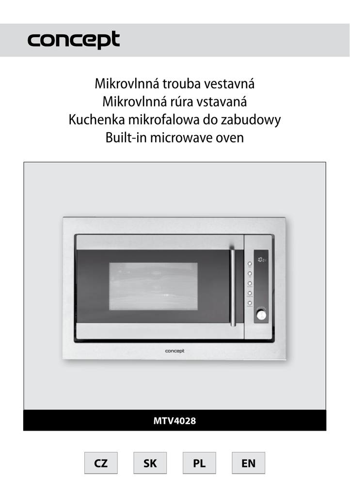 Mikrovlnná trouba vestavná Mikrovlnná rúra vstavaná Kuchenka mikrofalowa do zabudowy Built-in microwave oven MTV4028 CZ SK PL EN CZ PODĚKOVÁNÍ Děkujeme Vám, že jste si zakoupili výrobek značky Concept a přejeme Vám, abyste byli s naším výrobkem spokojeni po celou dobu jeho používání. Před prvním použitím prostudujte pozorně celý návod k obsluze a potom si jej uschovejte. Zajistěte, aby i ostatní osoby, které budou s výrobkem manipulovat, byly seznámeny s tímto návodem. Technické parametry Napětí 230 V ~ 50 Hz Příkon 1450 W Výkon mikrovln Frekvence mikrovln Výkon grilu 900 W 2450 MHz 1200 W Vnější rozměry 520 mm (š) x 430 mm (h) x 300 mm (v) Vnitřní rozměry 350 mm (š) x 372 mm (h) x 232 mm (v) Vnitřní objem trouby 28 l Průměr talíře 315 mm Hmotnost 17,5 kg Hlučnost < 63 dB(A) DŮLEŽITÁ BEZPEČNOSTNÍ UPOZORNĚNÍ: • Nepoužívejte spotřebič jinak, než je popsáno v tomto návodu. • Před prvním použitím odstraňte ze spotřebiče všechny obaly a marketingové materiály. • Ověřte, zda připojované napětí odpovídá hodnotám na typovém štítku spotřebiče. Používejte pouze zásuvky elektrického napětí s uzemněním. • Nenechávejte spotřebič bez dozoru během provozu. • Spotřebič umístěte pouze na stabilní a tepelně odolný povrch stranou od jiných zdrojů tepla. Tento povrch musí mít dostatečnou nosnost, aby unesl spotřebič i s připravovaným obsahem. • Nezakrývejte otvory spotřebiče, hrozí nebezpečí přehřátí. • Neodstraňujte nožičky. • Používejte pouze nádobí určené pro použití v mikrovlnné troubě (nekovové, bez kovového potisku a ozdob). Plastové nádoby nebo papírové obaly se mohou teplem deformovat nebo vznítit, během přípravy je proto sledujte. • Ve vnitřním prostoru spotřebiče nic neskladujte. • Nedotýkejte se horkého povrchu. Používejte držadla a tlačítka. Pokud manipulujete s horkými částmi, používejte kuchyňské rukavice (chňapky). • Dodržujte pokyny pro vestavbu spotřebiče. Zvláštní pozornost věnujte vzdálenosti od hořlavých materiálů, jako jsou záclony, závěsy, přikrývky, papír, oblečení, apod.! • Udržujte spotřebič v čistotě. Nedovolte, aby cizí tělesa pronikla do otvorů mřížek. Mohla by způsobit zkrat, poškodit spotřebič nebo způsobit požár. • Do vnitřního prostoru spotřebiče nevkládejte nadměrně velké potraviny nebo kovové předměty. Mohly by způsobit požár. MTV4028 1 CZ • Při vypojování spotřebiče ze zásuvky elektrického napětí nikdy netahejte za přívodní kabel, ale uchopte zástrčku a tahem ji vypojte. • Nedovolte dětem a nesvéprávným osobám se spotřebičem manipulovat, používejte ho mimo jejich dosahu. • Osoby se sníženou pohybovou schopností, se sníženým smyslovým vnímáním, s nedostatečnou duševní způsobilostí nebo osoby neseznámené s obsluhou musí používat spotřebič jen pod dozorem zodpovědné, s obsluhou seznámené osoby. • Dbejte zvýšené opatrnosti, pokud je spotřebič používán v blízkosti dětí. • Nedovolte, aby byl spotřebič používán jako hračka. • Zabraňte tomu, aby přívodní kabel volně visel přes hranu pracovní desky, kde by na něj mohly dosáhnout děti. • Nepoužívejte spotřebič ve venkovním prostředí nebo na mokrém povrchu, hrozí nebezpečí úrazu elektrickým proudem. • Nepoužívejte jiné příslušenství, než je doporučeno výrobcem. • Nepoužívejte spotřebič s poškozeným přívodním kabelem či zástrčkou, nechte závadu neprodleně odstranit autorizovaným servisním střediskem. • Netahejte a nepřenášejte spotřebič za přívodní kabel. • Držte spotřebič stranou od zdrojů tepla, jako jsou radiátory, trouby a podobně. Chraňte jej před přímým slunečním zářením, vlhkostí. • Nesahejte na spotřebič vlhkýma nebo mokrýma rukama. • V případě poruchy vypněte spotřebič a vytáhněte zástrčku ze zásuvky elektrického napětí. • Nedotýkejte se pohyblivých součástí během provozu spotřebiče. • Spotřebič je vhodný pouze pro použití v domácnosti, není určen pro komerční použití. • Spotřebič je určený pouze k vaření, ohřívání nebo rozmrazování jídla a potravin. • Neponořujte přívodní kabel, zástrčku nebo spotřebič do vody ani do jiné kapaliny. • Pravidelně kontrolujte spotřebič i přívodní kabel z důvodu poškození. Nezapínejte poškozený spotřebič. • Před čištěním a po použití spotřebič vypněte a nechte alespoň 30 minut vychladnout. • POZOR! Při otevírání dvířek se může uvolnit velké množství páry. Dbejte opatrnosti. Nebezpečí opaření! • Pokud zpozorujete kouř, vypněte spotřebič a vypojte přívodní kabel ze zásuvky. Nechte zavřená dvířka, aby se zabránilo případnému šíření ohně. • Nepoužívejte spotřebič bez vložených potravin. Může dojít k jeho poškození. • Při přípravě nebo ohřevu kojenecké stravy jídlo nebo nápoj dobře promíchejte a zkontrolujte teplotu, abyste zabránili popálení. • Mikrovlnný ohřev může způsobit opožděný var, buďte opatrní při manipulaci s ohřátou kapalinou. • Nepoužívejte spotřebič k ohřevu vajec ve skořápce a celých vařených vajec, může dojít k jejich explozi, i po skončení ohřevu. • Potraviny se slupkou (párky, brambory, ovoce apod.) před ohřevem několikrát propíchněte. • Nepoužívejte spotřebič ke smažení jídel. Horký olej může poškodit části spotřebiče nebo způsobit popáleniny kůže. • Nepoužívejte spotřebič, pokud jsou dvířka nebo těsnění dvířek poškozené. Nechte je opravit v autorizovaném servisu. • Z důvodu ochrany před mikrovlnným zářením je nebezpečné pro neoprávněné osoby provádět jakýkoliv servisní zásah nebo opravu, např. sejmutí krytu