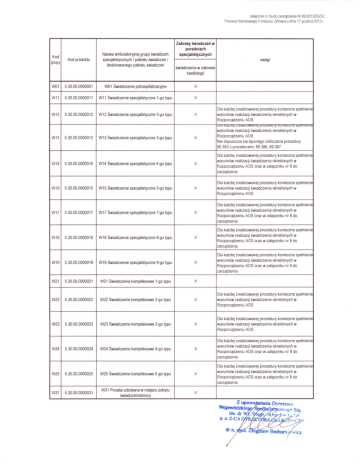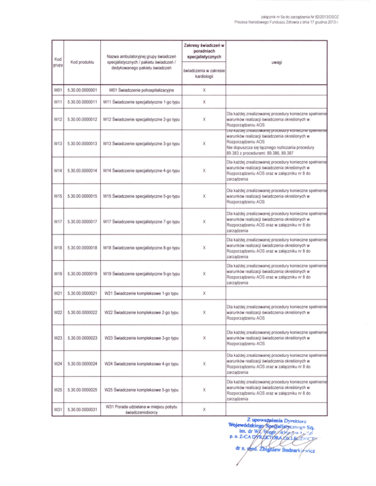 załącznik nr 5a do zarządzenia Nr 8212013/DSOZ Prezesa Narodowego Funduszu Zdrowia z dnia 17 grudnia 2013 r. Kod grupy Kod produktu Nazwa ambulatoryjnej grupy świadczeń specjalistycznych I pakietu świadczeń I dedykowanego pakietu świadczeń Zakresy świadczeń poradniach specjalistycznych w uwagi świadczenia w zakresie kardiologii W01 5,30,00,0000001 W11 5,30,00,0000011 W11 Świadczenie specjalistyczne 1-g0 typu X W12 5,30.00.0000012 W12 Świadczenie specjalistyczne 2-g0 typu X W13 5.30.00,0000013 W13 Świadczenie specjalistyczne 3-g0 typu X W14 5.30.00.0000014 W14 Świadczenie specjalistyczne 4-g0 typu X Dla każdej zrealizowanej procedury konieczne spełnienie warunków realizacji świadczenia określonych w Rozporządzeniu AOS oraz w zalączniku nr 8 do zarządzenia W15 5.30.00.0000015 W15 Świadczenie specjalistyczne 5-g0 typu X Dla każdej zrealizowanej procedury konieczne spełnienie warunków realizacji świadczenia określonych w Rozporządzeniu AOS W17 5.30.00.0000017 W17 Świadczenie specjalistyczne 7-go typu X Dla każdej zrealizowanej procedury konieczne spełnienie warunków realizacji świadczenia określonych w Rozporządzeniu AOS oraz w zalączniku nr 8 do zarządzenia W18 5.30.00.0000018 W18 Świadczenie specjalistyczne 8-g0 typu X Dla każdej zrealizowanej procedury konieczne spełnienie warunków realizacji świadczenia określonych w Rozporządzeniu AOS oraz w zalączniku nr 8 do zarządzenia X Dla każdej zrealizowanej procedury konieczne spełnienie warunków realizacji świadczenia określonych w Rozporządzeniu AOS oraz w zalączniku nr 8 do zarządzenia W01 Świadczenie pohospitalizacyjne W19 Świadczenie specjalistyczne 9-g0 typu X Dla każdej zrealizowanej procedury konieczne spełnienie warunków realizacji świadczenia określonych w Rozporządzeniu AOS t" u~vvu, 1 "U, "v~~"v warunków realizacji świadczenia określonych w Rozporządzeniu AOS Nie dopuszcza się lącznego rozliczania procedury 89.383 z procedurami: 89.386, 89.387 W19 5.30.00.0000019 W21 5,30.00.0000021 W21 Świadczenie kompleksowe 1-g0 typu X W22 5.30.00.0000022 W22 Świadczenie kompleksowe 2-g0 typu X Dla każdej zrealizowanej procedury konieczne spełnienie warunków realizacji świadczenia określonych w Rozporządzeniu AOS W23 5.30.00.0000023 W23 Świadczenie kompleksowe 3-go typu X Dla każdej zrealizowanej procedury konieczne spelnienie warunków realizacji świadczenia określonych w Rozporządzeniu AOS W24 5.30.00.0000024 W24 Świadczenie kompleksowe 4-g0 typu X Dla każdej zrealizowanej procedury konieczne spełnienie warunków realizacji świadczenia określonych w Rozporządzeniu AOS oraz w zalączniku nr 8 do zarządzenia W25 5.30.00.0000025 W25 Świadczenie kompleksowe 5-g0 typu X Dla każdej zrealizowanej procedury konieczne spelnienie warunków realizacji świadczenia określonych w Rozporządzeniu AOS oraz w zalączniku nr 8 do zarządzenia W31 5.30.00.0000031 W31 Porada udzielana w miejscu pobytu świadczeniobiorcy X załącznik nr Sa do zarządzenia Nr 82/2013/DSOZ Prezesa Narodowego Funduszu Zdrowia z dnia 17 grudnia 2013 r. Kod grupy Kod produktu Nazwa ambulatoryjnej grupy świadczeń specjalistycznych I pakietu świadczeń I dedykowanego pakietu świadczeń Zakresy świadczeń w poradniach specjalistycznych uwagi świadczenia w zakresie chorób zakaźnych dla dzieci W01 5.30.00.0000001 W01 Świadczenie pohospitalizacyjne X W11 5.30.00.0000011 W11 Świadczenie specjalistyczne 1"90 typu X W12 5.30.00.0000012 W12 Świadczenie specjalistyczne 2"90 typu X W13 5.30.00.0000013 W13 Świadczenie specjalistyczne 3"90 typu X W14 5.30.00.0000014 W14 Świadczenie specjalistyczne 4"90 typu X Dla każdej zrealizowanej procedury konieczne spełnienie warunków realizacji świadczenia określonych w Rozporządzeniu AOS oraz w załączniku nr 8 do zarządzenia W15 5.30.00.0000015 W15 Świadczenie specjalistyczne 5"90 typu X Dla każdej zrealizowanej procedury konieczne spełnienie warunków realizacji świadczenia określonych w Rozporządzeniu AOS W17 5.30.00.0000017 W17 Świadczenie specjalistyczne 7"90 typu X Dla każdej zrealizowanej procedury konieczne spełnienie warunków realizacji świadczenia określonych w Rozporządzeniu AOS oraz w załączniku nr 8 do zarządzenia W21 5.30.00.0000021 W21 Świadczenie kompleksowe 1"90 typu X W22 5.30.00.0000022 W22 Świadczenie kompleksowe 2"90 typu X Dla każdej zrealizowanej procedury konieczne spełnienie warunków realizacji świadczenia określonych w Rozporządzeniu AOS W23 5.30.00.0000023 W23 Świadczenie kompleksowe 3"90 typu X Dla każdej zrealizowanej procedury konieczne spełnienie warunków realizacji świadczenia określonych w Rozporządzeniu AOS Dla każdej zrealizowanej procedury konieczne spełnienie warunków realizacji świadczenia określonych w Rozporządzeniu AOS Dla każdej zrealizowanej procedury konieczne spełnienie warunków realizacji świadczenia określonych w Rozporządzeniu AOS Nie dopuszcza się łącznego rozliczania procedury 89.383 z procedurami: 89.386, 89.387 W24 5.30.00.0000024 W24 Świadczenie kompleksowe 4"90 typu X Dla każdej zrealizowanej procedury konieczne spełnienie warunków realizacji świadczenia określonych w Rozporządzeniu AOS oraz w załączniku nr 8 do zarządzenia W25 5.30.00.0000025 W25 Świadczenie kompleksowe 5"90 typu X Dla każdej zrealizowanej procedury konieczne spełnienie warunków realizacji świadczenia określonych w Rozporządzeniu AOS oraz w załączniku nr 8 do zarządzenia W31 5.30.00.0000031 W31 Porada udzielana w miejscu pobytu świadczeniobiorcy X Z // . Dyrektora S"' •••• ~"",-'J~"Q no m :12:. '""'3 dr n. med. ZbismCW ~ ewiez nI I załącznik nr 5a do zarządzenia Nr 82/2013/0S0Z Prezesa Narodowego Funduszu Zdrowia z dnia 17 grudnia 2013 r. Kod grupy Kod produktu Nazwa ambulatoryjnej grupy świadczeń specjalistycznych I pakietu świadczeń I dedykowanego pakietu świadczeń Zakresy świadczeń w poradniach specjalistycznych uwagi świadczenia w zakre