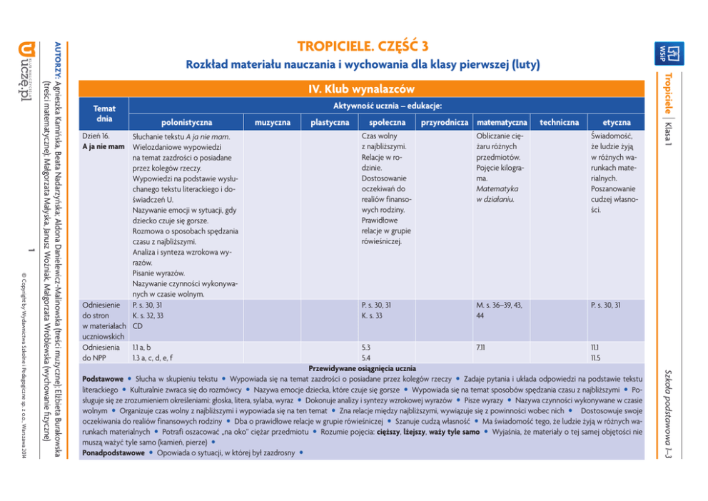 Rozkład materiału nauczania i wychowania dla klasy pierwszej (luty) IV. Klub wynalazców Temat dnia Aktywność ucznia – edukacje: polonistyczna Dzień 16. Słuchanie tekstu A ja nie mam. A ja nie mam Wielozdaniowe wypowiedzi na temat zazdrości o posiadane przez kolegów rzeczy. Wypowiedzi na podstawie wysłuchanego tekstu literackiego i doświadczeń U. Nazywanie emocji w sytuacji, gdy dziecko czuje się gorsze. Rozmowa o sposobach spędzania czasu z najbliższymi. Analiza i synteza wzrokowa wyrazów. Pisanie wyrazów. Nazywanie czynności wykonywanych w czasie wolnym. Odniesienie P. s. 30, 31 do stron K. s. 32, 33 w materiałach CD uczniowskich Odniesienia 1.1 a, b do NPP 1.3 a, c, d, e, f muzyczna plastyczna społeczna przyrodnicza matematyczna techniczna etyczna Czas wolny z najbliższymi. Relacje w rodzinie. Dostosowanie oczekiwań do realiów finansowych rodziny. Prawidłowe relacje w grupie rówieśniczej. Obliczanie ciężaru różnych przedmiotów. Pojęcie kilograma. Matematyka w działaniu. Świadomość, że ludzie żyją w różnych warunkach materialnych. Poszanowanie cudzej własności. P. s. 30, 31 K. s. 33 M. s. 36–39, 43, 44 P. s. 30, 31 Szkoła podstawowa 1–3 5.3 7.11 11.1 5.4 11.5 Przewidywane osiągnięcia ucznia Podstawowe Słucha w skupieniu tekstu Wypowiada się na temat zazdrości o posiadane przez kolegów rzeczy Zadaje pytania i układa odpowiedzi na podstawie tekstu literackiego Kulturalnie zwraca się do rozmówcy Nazywa emocje dziecka, które czuje się gorsze Wypowiada się na temat sposobów spędzania czasu z najbliższymi Posługuje się ze zrozumieniem określeniami: głoska, litera, sylaba, wyraz Dokonuje analizy i syntezy wzrokowej wyrazów Pisze wyrazy Nazywa czynności wykonywane w czasie wolnym Organizuje czas wolny z najbliższymi i wypowiada się na ten temat Zna relacje między najbliższymi, wywiązuje się z powinności wobec nich Dostosowuje swoje oczekiwania do realiów finansowych rodziny Dba o prawidłowe relacje w grupie rówieśniczej Szanuje cudzą własność Ma świadomość tego, że ludzie żyją w różnych warunkach materialnych Potrafi oszacować „na oko” ciężar przedmiotu Rozumie pojęcia: cięższy, lżejszy, waży tyle samo Wyjaśnia, że materiały o tej samej objętości nie muszą ważyć tyle samo (kamień, pierze) Ponadpodstawowe Opowiada o sytuacji, w której był zazdrosny Tropiciele | Klasa 1 © Copyright by Wydawnictwa Szkolne i Pedagogiczne sp. z o.o., Warszawa 2014 (treści matematyczne); Małgorzata Małyska, Janusz Woźniak, Małgorzata Wróblewska (wychowanie fizyczne) 1 Autorzy: A gnieszka Kamińska, Beata Nadarzyńska; Aldona Danielewicz-Malinowska (treści muzyczne); Elżbieta Burakowska TROPICIELE. CZĘŚĆ 3 Dzień 17. Ważne wynalazki Aktywność ucznia – edukacje: polonistyczna Wielozdaniowe wypowiedzi na temat wynalazków ułatwiających ludziom pranie, przemieszczanie się, oświetlanie mieszkań na podstawie ilustracji i własnych doświadczeń. Opowiadanie o sytuacjach przedstawionych na ilustracji. Rozmowa na temat wynalazków i ich roli w życiu człowieka. Czytanie i pisanie wyrazów. Analiza i synteza wzrokowo-słuchowa wyrazów. Poczytanka Smokowkręt. Odniesienie P. s. 32, 33, 66 do stron K. s. 34, 35 w materiałach uczniowskich Odniesienia do NPP 1.1 b 1.2 a 1.3 a, c, d, e, f muzyczna Poznanie budowy taktu na dwa. plastyczna społeczna przyrodnicza matematyczna Zagrożenia dla środowiska przyrodniczego ze strony człowieka. P. s. 61 – Abecadło muzyczne – takt na dwa. K. s. 63 3.1 a, b 6.6 techniczna Dokonywanie prostych obliczeń dotyczących ciężaru – wyrażenie mianowane – kilogram. Matematyka w działaniu. Zagrożenia wynikające z niewłaściwego używania narzędzi i urządzeń technicznych, ogólne zasady działania urządzeń domowych – posługiwanie się nimi. M. s. 36–39, 45, 46 K. u. P. s. 32, 33 7.11 9.1 a, b 9.3 b etyczna Szkoła podstawowa 1–3 Przewidywane osiągnięcia ucznia Podstawowe Obdarza uwagą kolegów podczas wypowiedzi na temat wynalazków Uczestniczy w rozmowie na temat wynalazków i ich roli w życiu człowieka Czyta i pisze wyrazy z poznanymi literami Dokonuje analizy i syntezy wzrokowo-słuchowej wyrazów Zna zagrożenia ze strony człowieka dla środowiska przyrodniczego Zna zasady działania urządzeń domowych Posługuje się nimi w sposób bezpieczny Zna zagrożenia wynikające z niewłaściwego używania urządzeń technicznych Zna budowę taktu na dwa Potrafi określić wartości rytmiczne umieszczone w takcie na dwa Poprawnie określa liczbę wartości rytmicznych w takcie oraz ich czas trwania Poprawnie i samodzielnie realizuje ćwiczenia w kartach pracy Waży przedmiot Porównuje ciężar przedmiotów Wykonuje proste obliczenia dotyczące ciężaru Zna zagrożenia wynikające z niewłaściwego używania urządzeń technicznych (pralka, lodówka, suszarka, odkurzacz, ekspres do kawy, mikrofalówka) Posługuje się nimi, nie psując ich Ponadpodstawowe Opowiada o zdarzeniach przedstawionych na ilustracjach Tropiciele | Klasa 1 © Copyright by Wydawnictwa Szkolne i Pedagogiczne sp. z o.o., Warszawa 2014 (treści matematyczne); Małgorzata Małyska, Janusz Woźniak, Małgorzata Wróblewska (wychowanie fizyczne) 2 Autorzy: A gnieszka Kamińska, Beata Nadarzyńska; Aldona Danielewicz-Malinowska (treści muzyczne); Elżbieta Burakowska Temat dnia Aktywność ucznia – edukacje: plastyczna społeczna Rysowanie portretów babci i dziadka. Wykonanie medalu dla babci i dziadka. Wykonywanie prostych rekwizytów i wykorzystanie ich w zabawie teatralnej. Relacje rodzinne. Pomoc dziadkom, osobom starszym w rodzinie. Wartość czasu wolnego spędzanego z dziadkami. Rozwiązywanie zadań tekstowych, porównywanie liczb w zakresie 10. Matematyka w działaniu. Odniesienie P. s. 34, 35 do stron K. s. 36, 37 w materiałach uczniowskich K. s. 37 W. 2 P. s. 34, 35 M. s. 36–39, 47, 48 K. u. Odniesienia do NPP 4.2 a, b, c 5.3 5.4 7.3 7.5 7.8 Dzie