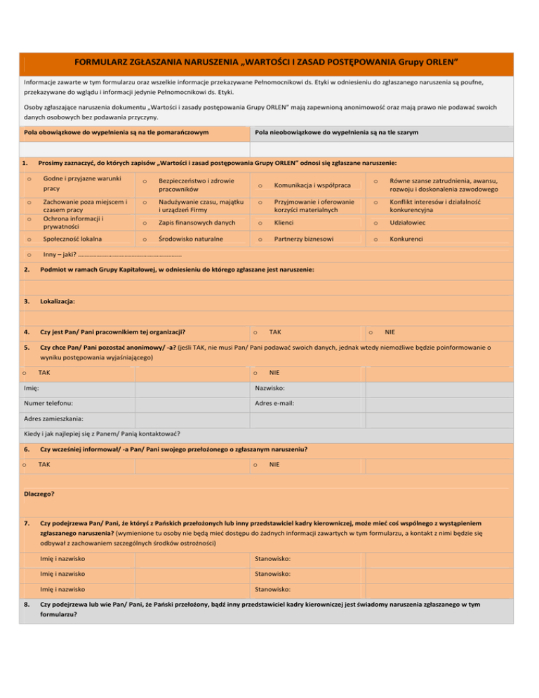 FORMULARZ ZGŁASZANIA NARUSZENIA „WARTOŚCI I ZASAD POSTĘPOWANIA Grupy ORLEN” Informacje zawarte w tym formularzu oraz wszelkie informacje przekazywane Pełnomocnikowi ds. Etyki w odniesieniu do zgłaszanego naruszenia są poufne, przekazywane do wglądu i informacji jedynie Pełnomocnikowi ds. Etyki. Osoby zgłaszające naruszenia dokumentu „Wartości i zasady postępowania Grupy ORLEN” mają zapewnioną anonimowość oraz mają prawo nie podawać swoich danych osobowych bez podawania przyczyny. Pola obowiązkowe do wypełnienia są na tle pomarańczowym 1. Pola nieobowiązkowe do wypełnienia są na tle szarym Prosimy zaznaczyć, do których zapisów „Wartości i zasad postępowania Grupy ORLEN” odnosi się zgłaszane naruszenie: Godne i przyjazne warunki pracy o Bezpieczeństwo i zdrowie pracowników Zachowanie poza miejscem i czasem pracy Ochrona informacji i prywatności o o Społeczność lokalna o Inny – jaki? …………………………………………………….. o o o o Równe szanse zatrudnienia, awansu, rozwoju i doskonalenia zawodowego Przyjmowanie i oferowanie korzyści materialnych o Konflikt interesów i działalność konkurencyjna o Klienci o Udziałowiec o Partnerzy biznesowi o Konkurenci o Komunikacja i współpraca Nadużywanie czasu, majątku i urządzeń Firmy o o Zapis finansowych danych o Środowisko naturalne 2. Podmiot w ramach Grupy Kapitałowej, w odniesieniu do którego zgłaszane jest naruszenie: 3. Lokalizacja: 4. Czy jest Pan/ Pani pracownikiem tej organizacji? 5. Czy chce Pan/ Pani pozostać anonimowy/ -a? (jeśli TAK, nie musi Pan/ Pani podawać swoich danych, jednak wtedy niemożliwe będzie poinformowanie o wyniku postępowania wyjaśniającego) o TAK o o TAK o NIE NIE Imię: Nazwisko: Numer telefonu: Adres e-mail: Adres zamieszkania: Kiedy i jak najlepiej się z Panem/ Panią kontaktować? 6. Czy wcześniej informował/ -a Pan/ Pani swojego przełożonego o zgłaszanym naruszeniu? o TAK o NIE Dlaczego? 7. 8. Czy podejrzewa Pan/ Pani, że któryś z Pańskich przełożonych lub inny przedstawiciel kadry kierowniczej, może mieć coś wspólnego z wystąpieniem zgłaszanego naruszenia? (wymienione tu osoby nie będą mieć dostępu do żadnych informacji zawartych w tym formularzu, a kontakt z nimi będzie się odbywał z zachowaniem szczególnych środków ostrożności) Imię i nazwisko Stanowisko: Imię i nazwisko Stanowisko: Imię i nazwisko Stanowisko: Czy podejrzewa lub wie Pan/ Pani, że Pański przełożony, bądź inny przedstawiciel kadry kierowniczej jest świadomy naruszenia zgłaszanego w tym formularzu? o TAK NIE 9. Jeśli tak, prosimy podać imię, nazwisko oraz stanowisko takiego kierownika: o NIE WIEM o NIE CHCĘ PODAĆ o 10. W jakich okolicznościach/ w jaki sposób dowiedział/-a się Pan/ Pani o sytuacji, której dotyczy zgłaszane naruszenie? o doświadczyłem/ -am go bezpośrednio o byłem/ -am świadkiem zdarzenia o powiedziała mi o nim osoba spoza Grupy ORLEN. o usłyszałem/ -am o nim przypadkowo o przeczytałem/ -am o tym o przypadkowo znalazłem/ -am dokument opisujący zdarzenie o powiedział mi o nim współpracownik 11. Na czym polega zgłaszane naruszenie? Na przykład: nieprzestrzeganie zasad BHP, itd. 12. Prosimy o podanie danych osób będących świadkami zgłaszanego naruszenia: 1. Imię i nazwisko Stanowisko: 2. Imię i nazwisko Stanowisko: 3. Imię i nazwisko Stanowisko: nie znam świadków z imienia i nazwiska o jestem jedynym świadkiem zdarzenia/ jedyną osobą świadomą zdarzenia o 13. Czy któraś z wyżej wymienionych osób próbowała zatrzeć ślady zdarzenia? TAK o NIE o NIE WIEM o 14. Jeśli tak, to która i w jaki sposób? Na przykład: Jan Kowalski, zignorował zdarzenie/ zamienił dokumenty 15. Gdzie miała miejsce sytuacja, której dotyczy zgłaszane naruszenie? Na przykład: na platformie x, w miejscu załadunku w xyz 16. Kiedy zgłaszane naruszenie miało/ ma miejsce? Na przykład: 3 maja 2010, tydzień temu, w czwartki, przy dostawach xyz, itp. 17. Jak długo trwała/ od jak dawna trwa ta sytuacja? o to było jednorazowe zdarzenie o 1-2 tygodnie o 2-4 tygodnie o 1-3 miesiące o 3-6 miesięcy o 6-12 miesięcy o ponad rok o nie wiem 18. Czy istnieją dokumenty potwierdzające zaistnienie sytuacji, której dotyczy zgłaszane naruszenie? o TAK o NIE o 19. Jeśli tak, prosimy o informację, gdzie się znajdują, gdzie można je znaleźć: NIE WIEM Na przykład: W archiwum działu xyz, itd. 20. Prosimy o opisanie zaistniałej sytuacji/ zdarzenia wraz ze wszystkimi znanymi Panu/ Pani szczegółami dotyczącymi miejsca, czasu, okoliczności, świadków, czy wszelkimi innymi informacjami, które mogą być pomocne w wyjaśnianiu i ocenie zgłaszanego naruszenia: Prosimy o podanie tak wielu szczegółów, jak to tylko możliwe. Jeśli zaznaczył/-a Pan/ Pani pole z zastrzeżeniem anonimowości porosimy o podawanie informacji w taki sposób, aby nie było możliwe stwierdzenie Pana/ Pani tożsamości. KONIEC FORMULARZA