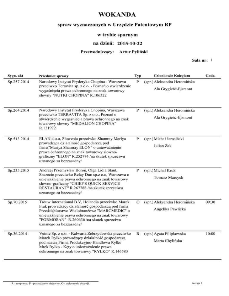 WOKANDA spraw wyznaczonych w Urzędzie Patentowym RP w trybie spornym na dzień: 2015-10-22 Przewodniczący: Artur Pyliński Sala nr: 1 Sygn. akt Przedmiot sprawy Sp.257.2014 Narodowy Instytut Fryderyka Chopina - Warszawa przeciwko Terravita sp. z o.o. - Poznań o stwierdzenie wygaśnięcia prawa ochronnego na znak towarowy słowny "NUTKI CHOPINA" R.106322 P Narodowy Instytut Fryderyka Chopina, Warszawa przeciwko TERRAVITA Sp. z o.o., Poznań o stwierdzenie wygaśnięcia prawa ochronnego na znak towarowy słowny "MEDALION CHOPINA" R.131972 P ELAN d.o.o, Słowenia przeciwko Shamray Mariya prowadząca działalność gospodarczą pod firmą"Mariya Shamray ELON" o unieważnienie prawa ochronnego na znak towarowy słownograficzny "ELON" R.252774 /na skutek sprzeciwu uznanego za bezzasadny/ P Andrzej Przemysław Boroń, Olga Lidia Staut, Szczecin przeciwko Relay Duo sp.z o.o, Warszawa o unieważnienie prawa ochronnego na znak towarowy słowno-graficzny "CHIEF'S QUICK SERVICE RESTAURANT" R.267788 /na skutek sprzeciwu uznanego za bezzasadny/ P Trouw International B.V, Holandia przeciwko Marek Fiuk prowadzący działalność gospodarczą pod firmą Przedsiębiorstwo Wielobranżowe "MARCMEDIC" o unieważnienie prawa ochronnego na znak towarowy "FORMOSAN" R.260636 /na skutek sprzeciwu uznanego za bezzasadny/ O Veinte Sp. z o.o. - Kalwaria Zebrzydowska przeciwko Marek Ryłko prowadzący działalność gospodarczą pod nazwą Firma Produkcyjno-Handlowa Ryłko Mrek Ryłko - Kęty o unieważnienie prawa ochronnego na znak towarowy "RYŁKO" R.146583 R Sp.264.2014 Sp.513.2014 Sp.235.2015 Sp.70.2015 Sp.36.2014 R - rozprawa, P - posiedzenie niejawne, O - ogłoszenie decyzji. Typ Członkowie Kolegium Godz. (spr.) Aleksandra Heromińska Ala Grygieńć-Ejsmont (spr.) Aleksandra Heromińska Ala Grygieńć-Ejsmont (spr.) Michał Jarosiński Julian Żak (spr.) Michał Kruk Tomasz Marcych (spr.) Aleksandra Heromińska 09:30 Angelika Pawlicka (spr.) Agata Filipkowska 10:00 Marta Chylińska wersja 1 Sala nr: 1 Sygn. akt Przedmiot sprawy Sp.319.2013 Veinte Sp. z o.o. - Brody przeciwko Marek Ryłko prowadzący działalność gospodarczą pod nazwą F. P.H. Ryłko - Kęty, Paweł Ryłko prowadzący działalność gospodarczą pod nazwą Ryłko Art - Kęty o unieważnienie prawa ochronnego na znak towarowy słowno-graficzny "RYŁKO" R.251123 /na skutek sprzeciwu uznanego za bezzasadny/ R Marek Ryłko prowadzący działalność gospodarczą pod nazwą F.P.H. Ryłko Marek Ryłko - Kęty przeciwko Veinte Sp. z o.o. - Brody o stwierdzenie wygaśnięcia prawa ochronnego na znak towarowy słowno-graficzny "RYŁKO RELAX" R.200495 R Webnode CZ s.r.o., Republika Czeska przeciwko Marcin Ciskowski prowadzący działalność gospodarczą pod firmą "Webnode" Marcin Ciskowski, Warszawa o stwierdzenie wygaśnięcia prawa ochronnego na znak towarowy "WEBNODE" R.225989 R Sp.413.2013 Sp.166.2015 R - rozprawa, P - posiedzenie niejawne, O - ogłoszenie decyzji. Typ Członkowie Kolegium Godz. (spr.) Agata Filipkowska 11:00 Marta Chylińska (spr.) Agata Filipkowska 12:00 Marta Chylińska (spr.) Michał Kruk 13:00 Jacek Lewicki wersja 1