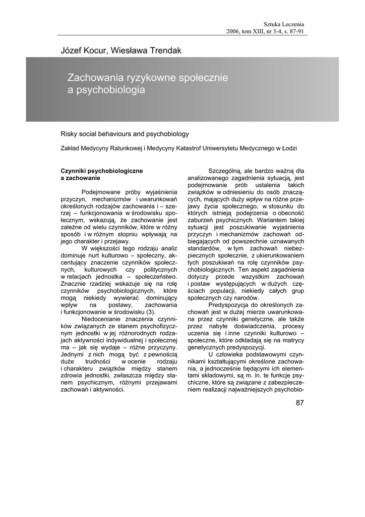 Sztuka Leczenia 2006, tom XIII, nr 3-4, s. 87-91 Józef Kocur, Wiesława Trendak Zachowania ryzykowne społecznie a psychobiologia Risky social behaviours and psychobiology Zakład Medycyny Ratunkowej i Medycyny Katastrof Uniwersytetu Medycznego w Łodzi Czynniki psychobiologiczne a zachowanie Podejmowane próby wyjaśnienia przyczyn, mechanizmów i uwarunkowań określonych rodzajów zachowania i – szerzej – funkcjonowania w środowisku społecznym, wskazują, że zachowanie jest zależne od wielu czynników, które w różny sposób i w różnym stopniu wpływają na jego charakter i przejawy. W większości tego rodzaju analiz dominuje nurt kulturowo – społeczny, akcentujący znaczenie czynników społecznych, kulturowych czy politycznych w relacjach jednostka – społeczeństwo. Znacznie rzadziej wskazuje się na rolę czynników psychobiologicznych, które mogą niekiedy wywierać dominujący wpływ na postawy, zachowania i funkcjonowanie w środowisku (3). Niedocenianie znaczenia czynników związanych ze stanem psychofizycznym jednostki w jej różnorodnych rodzajach aktywności indywidualnej i społecznej ma – jak się wydaje – różne przyczyny. Jednymi z nich mogą być z pewnością duże trudności w ocenie rodzaju i charakteru związków między stanem zdrowia jednostki, zwłaszcza między stanem psychicznym, różnymi przejawami zachowań i aktywności. Szczególną, ale bardzo ważną dla analizowanego zagadnienia sytuacją, jest podejmowanie prób ustalenia takich związków w odniesieniu do osób znaczących, mających duży wpływ na różne przejawy życia społecznego, w stosunku do których istnieją podejrzenia o obecność zaburzeń psychicznych. Wariantem takiej sytuacji jest poszukiwanie wyjaśnienia przyczyn i mechanizmów zachowań odbiegających od powszechnie uznawanych standardów, w tym zachowań niebezpiecznych społecznie, z ukierunkowaniem tych poszukiwań na rolę czynników psychobiologicznych. Ten aspekt zagadnienia dotyczy przede wszystkim zachowań i postaw występujących w dużych częściach populacji, niekiedy całych grup społecznych czy narodów. Predyspozycja do określonych zachowań jest w dużej mierze uwarunkowana przez czynniki genetyczne, ale także przez nabyte doświadczenia, procesy uczenia się i inne czynniki kulturowo – społeczne, które odkładają się na matrycy genetycznych predyspozycji. U człowieka podstawowymi czynnikami kształtującymi określone zachowania, a jednocześnie będącymi ich elementami składowymi, są m. in. te funkcje psychiczne, które są związane z zabezpieczeniem realizacji najważniejszych psychobio- 87 Zachowania ryzykowne społecznie a psychobiologia logicznych i społecznych celów jednostki. Funkcjonowanie tych systemów wspomaga przetwarzanie informacji przez mózg i generuje odpowiednie zachowania (17). Według teorii behawioralnych zachowanie człowieka jest regulowane przez wpływy środowiska i stanowi efekt procesu uczenia się opartego o warunkowanie klasyczne lub instrumentalne (sprawcze). Teorie te nie uwzględniają jednak zjawisk wewnątrzpsychicznych przy wyjaśnianiu mechanizmów zachowania; lukę tę starają się wypełnić teorie poznawcze, które również twierdzą, że zachowanie człowieka jest wynikiem procesów uczenia się, ale wskazują przy tym na fakt, że uczenie się prowadzi do powstania określonych struktur psychicznych wpływających na zachowanie. Najważniejsze z nich to struktury poznawcze, przekonania i postawy, które odgrywają decydującą rolę w kształtowaniu rodzaju reakcji i zachowań w relacjach jednostki z otoczeniem (7). Według tych koncepcji człowiek może sterować swoim zachowaniem poprzez świadome formułowanie celów i przewidywanie sposobów ich osiągnięcia. Zdobyte doświadczenia życiowe, ich ocena i znaczenie mają istotny wpływ na tworzenie się obrazu własnej osoby, czyli zbioru wiedzy o sobie i samooceny. Samoocena z kolei wyraża określony stosunek emocjonalny wobec siebie i wobec określonych cech własnej osobowości. Doświadczenie osobiste decyduje także o rodzaju i poziomie samoakceptacji, o satysfakcji (lub jej braku) z zaspokojenia własnych potrzeb i ambicji (15). Wszelkie zaburzenia procesów zaspokajania potrzeb czy poczucie braku akceptacji ze strony osób znaczących mogą prowadzić do zakłóceń w funkcjonowaniu społecznym, przejawiających się także zaburzeniami zachowania. Obawy, że rozwój nauk humanistycznych i społecznych sprawi, że znaczenie biologii jako istotnego czynnika wpływającego na ludzkie zachowania, zostanie pomniejszone, nie sprawdziły się. Biologia nadal odgrywa ważną rolę w wyjaśnianiu różnic między jednostkami 88 w obrębie danej populacji, a prognozowany postęp wiedzy o ludzkich genach z pewnością pozwoli lepiej określić rolę i znaczenie genetycznego podłoża wielu nie do końca poznanych chorób i zaburzeń. Wiedza o genetycznych, a więc biologicznych uwarunkowaniach pewnych cech osobowości i zachowań, stanie się zapewne impulsem do poszukiwania nowych technik, pozwalających manipulować tymi cechami. Ten obszar działalności naukowo – badawczej znajdzie się z całą pewnością w obszarze zainteresowań nie tylko uczonych, ale i polityków, a prezentowane przez nich opcje i światopogląd mogą w znaczący sposób ukierunkowywać same badania jak i sposoby ich praktycznego wykorzystania. Chodzi tu nie tylko o inżynierię genetyczną, a zwłaszcza eugenikę, ale także sterowanie i manipulowanie zachowaniem (8). Zachowania ryzykowne społecznie Niektóre zachowania niebezpieczne społecznie dotyczą współczesnej nauki i trwającej już drugiej rewolucji technicznej i biotechnologii. Niektóre już uzyskane produkty biotechnologii stwarzają zagrożenie dla ludzkości, jak choroby hodowlane bakterii odpornych na działanie antybiotyków, nowe typy wirusów, genetycznie zmodyfikowana żywność. Postępy biotechnologii łączące wielkie pote