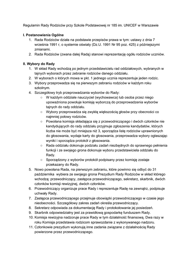 Regulamin Rady Rodziców przy Szkole Podstawowej nr 185 im. UNICEF w Warszawie I. Postanowienia Ogólne 1. Rada Rodziców działa na podstawie przepisów prawa w tym: ustawy z dnia 7 września 1991 r, o systemie oświaty (Dz.U. 1991 Nr 95 poz. 425) z późniejszymi zmianami. 2. Rada Rodziców (zwana dalej Radą) stanowi reprezentację ogółu rodziców uczniów. II. Wybory do Rady 1. W skład Rady wchodzą po jednym przedstawicielu rad oddziałowych, wybranych w tajnych wyborach przez zebranie rodziców danego oddziału. 2. W wyborach o których mowa w pkt. 1 jednego ucznia reprezentuje jeden rodzic. 3. Wybory przeprowadza się na pierwszym zebraniu rodziców w każdym roku szkolnym. 4. Szczegółowy tryb przeprowadzania wyborów do Rady: ○ W każdym oddziale nauczyciel (wychowawca) lub osoba przez niego upoważniona powołuje komisję wyborczą do przeprowadzenia wyborów tajnych do rady oddziału. ○ Wybory przeprowadza się zwykłą większością głosów przy obecności co najmniej połowy rodziców. ○ Powołana komisja składająca się z przewodniczącego i dwóch członków nie kandydujących do rady oddziału przyjmuje zgłoszenia kandydatów, których liczba nie może być mniejsza niż 3, sporządza listę rodziców uprawnionych do głosowania, wydaje karty do głosowania, przeprowadza wybory ogłaszając wyniki i sporządza protokół z głosowania. ○ Rada oddziału dokonuje podziału zadań niezbędnych do sprawnego pełnienia funkcji i ze swojego grona dokonuje wyboru przedstawiciela oddziału do Rady. ○ Sporządzony z wyborów protokół podpisany przez komisję zostaje przekazany do Rady. 5. Nowo powołana Rada, na pierwszym zebraniu, które powinno się odbyć do 31 października wybiera ze swojego grona Prezydium Rady Rodziców w skład którego wchodzą: przewodniczący, zastępca przewodniczącego, sekretarz, skarbnik, dwóch członków komisji rewizyjnej, dwóch członków. 6. Przewodniczący organizuje prace Rady i reprezentuje Radę na zewnątrz, podpisuje uchwały Rady. 7. Zastępca przewodniczącego przejmuje obowiązki przewodniczącego w czasie jego nieobecności. Szczegółowy zakres zadań określa przewodniczący. 8. Sekretarz odpowiada za dokumentację Rady i protokołowanie jej posiedzeń. 9. Skarbnik odpowiedzialny jest za prawidłową gospodarkę funduszem Rady. 10. Komisja rewizyjna nadzoruje prace Rady w tym działalność finansową. Dwa razy w roku Komisja przedstawia rodzicom sprawozdanie z wykonywanego nadzoru. 11. Członkowie prezydium wykonują inne zadania związane z działalnością Rady powierzone przez przewodniczącego. III. Posiedzenia Rady Posiedzenia zwoływane są przez przewodniczącego w miarę potrzeb, nie rzadziej niż raz na trzy miesiące. 1. Przewodniczący powiadamia Radę o posiedzeniu nie później niż 7 dni przed wyznaczona datą. 2. W nadzwyczajnych sytuacjach posiedzenie Rady może być zwołane bez zachowania 7 dniowego terminu, z inicjatywy dyrektora szkoły, rady pedagogicznej lub 1/3 składu Rady. 3. Przygotowanie posiedzenia Rady jest obowiązkiem przewodniczącego. 4. Posiedzenia rady prowadzone są przez przewodniczącego lub innego upoważnionego członka prezydium. 5. Każdy członek Rady ma prawo na posiedzeniu zgłaszać zmiany do projektu obrad. W przypadku zgłoszenia sprzeciwu do projektu zmiany osoba prowadząca posiedzenie ma obowiązek przeprowadzenia głosowania jawnego. 6. Wszystkie głosowania przeprowadzane są w trybie jawnym a uchwały podejmowane zwykłą większością głosów. W szczególnych przypadkach członka rady może zastępować inna osoba wybrana do Rady tego samego Oddziału, a gdy to jest niemożliwe inny rodzic lub opiekun dziecka tegoż Oddziału. 7. W sprawach szczególnie pilnych w przypadku braku możliwości zwołania posiedzenia Rady uchwała może być podjęta w trybie obiegowym, poprzez złożenie podpisu lub poprzez wyrażenie głosu za pomocą środków komunikacji elektronicznej. W przypadku gdy przeprowadzenie głosowania w trybie obiegowym nie jest możliwe uchwałę może podjąć przewodniczący lub zastępca przewodniczącego samodzielnie. W przypadku podjęcia samodzielnej decyzji przez przewodniczącego lub zastępcę przewodniczącego mają oni obowiązek poinformować o podjętej decyzji na następnym posiedzeniu rady. 8. Rada podejmuje uchwały w ramach swoich kompetencji określonych w ustawie. 9. Formę uchwały przyjmuje się do występowania z wnioskami i opiniami we wszystkich sprawach szkoły. 10. W posiedzeniach Rady za jej zgodą może brać udział z głosem doradczym dyrektor szkoły lub inne zaproszone przez przewodniczącego osoby. 11. Posiedzenia są protokołowane a protokoły podpisywane przez sekretarza i przewodniczącego. IV. Kompetencje Rady Rada może występować do dyrektora i innych organów szkoły, organu prowadzącego szkołę oraz organu sprawującego nadzór pedagogiczny z wnioskami i opiniami we wszystkich sprawach szkoły lub placówki. 1. Rada uchwala w porozumieniu z radą pedagogiczną program wychowawczy szkoły obejmujący wszystkie treści i działania o charakterze wychowawczym skierowane do uczniów, realizowany przez nauczycieli. 2. Rada uchwala w porozumieniu z radą pedagogiczną program profilaktyki dostosowany do potrzeb rozwojowych uczniów oraz potrzeb danego środowiska, obejmujący wszystkie treści i działania o charakterze profilaktycznym skierowane do uczniów, nauczycieli i rodziców. 3. Rada opiniuje program i harmonogram poprawy efektywności kształcenia lub wychowania szkoły w przypadku stwierdzenia konieczności jego wprowadzenia na podstawie przepisów ustawy. 4. Rada opiniuje projekt planu finansowego szkoły składanego przez dyrektora szkoły. 5. Rada może wnioskować o powołanie rady szkoły. V. Prawa i obowiązki członków Rady Członkowie Rady mają prawo do dostępu do wszystkich informacji i dokumentów związanych z realizacją zadań ustawowych z wyjątkiem spraw zastrzeżonych na po