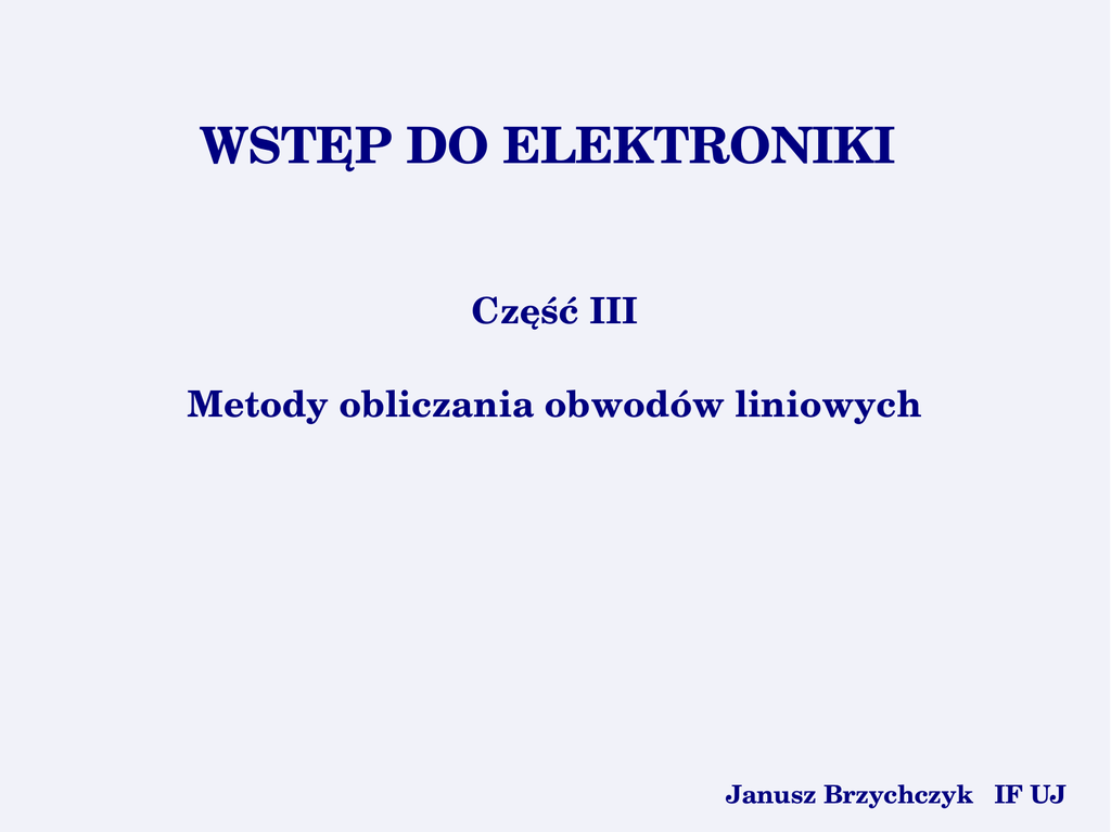 WSTĘP DO ELEKTRONIKI Część III Metody obliczania obwodów liniowych Janusz Brzychczyk IF UJ Metody obliczania obwodów liniowych Cel Wyznaczenie prądów lub napięć na wszystkich elementach obwodu Stosowane prawa i metody: Prawa Kirchhoffa: I prawo Kirchhoffa (dla prądów) II prawo Kirchhoffa (dla napięć) Metoda superpozycji Metoda źródła zastępczego: twierdzenie Thèvenina twierdzenie Nortona Metody przekształcania sieci Pierwsze prawo Kirchhoffa Suma algebraiczna natężeń prądów dopływających (+) i odpływających () z danego punktu rozgałęzienia przewodników (węzła) jest równa 0. Przyjmuje się konwencję, że prądy zwrócone do węzła mają znak (+), a prądy ze zwrotem od węzła mają znak (). Inne sformułowanie: Suma natężeń prądów dopływających do węzła jest równa sumie natężeń prądów wypływających z tego węzła. Prawo to wynika z zasady zachowania ładunku oraz z faktu, że w węźle nie może gromadzić się ładunek. Przykład: I1 I5 I4 I2 I3 I 1−I 2I 3−I 4I 5 = 0 I 1I 3I 5 = I 2I 4 Drugie prawo Kirchhoffa Suma napięć źródłowych (sił elektromotorycznych) i napięć odbiornikowych na wszystkich elementach obwodu zamkniętego jest równa zeru. Inne sformułowanie: Suma wartości chwilowych sił elektromotorycznych występujacych w obwodzie zamkniętym równa jest sumie wartości chwilowych napięć elektrycznych na elementach pasywnych tego obwodu. E2 Przykład: + _ C D R1 R2 I1 I2 + _ B A E1 U AB U BC U CD U DA = 0 E 1 − I 1 R1− E 2 I 2 R2 = 0 Metoda superpozycji Metodę suporpozycji możemy stosować dla układu liniowego zawierającego co najmniej dwa źródła. Odpowiedź układu liniowego na kilka wymuszeń jest równa sumie odpowiedzi na każde wymuszenie oddzielnie. Przykład: R1 + E1 _ A A R2 U0 E2 Układ z dwoma źródłami (wymuszeniami) E1 , E2 I1 U1 U0 = R 2 E 1−R1 E2 R1R2 I2 R1 I2 B Układ ze źródłem E1 I1 = E1 R2 R1R2 E1 U2 B Układ ze źródłem E2 I2 = R1R2 R2 E2 _ U 1 = R2 I 1 = U0 = U1 U 2 R2 + E1 B R1 I1 A E2 R1R 2 U 2 =−R1 I 2 =− R1 R1R2 E2 Twierdzenie Thèvenina Każdy liniowy dwójnik aktywny można zastąpić równoważnym układem, składającym się ze źródła napięcia połączonego szeregowo z oporem (impedancją). A A RW R B Liniowa sieć z dwoma zaciskami A, B, zawierająca dowolną liczbę źródeł energii. R U0 B Równoważny elektrycznie obwód z jednym źródłem napięcia, którego wartość U0 jest równa napięciu na zaciskach otwartej gałęzi AB (przy braku obciążenia R). Rezystancja wewnętrzna RW tego źródła jest równa rezystancji sieci pasywnej (po usunięciu wszystkich źródeł energii) widzianej od strony zacisków otwartej gałęzi AB. Twierdzenie Nortona Każdy liniowy dwójnik aktywny można zastąpić równoważnym układem, składającym się ze źródła prądu połączonego równolegle z oporem (impedancją). A A R B Liniowa sieć z dwoma zaciskami A, B, zawierająca dowolną liczbę źródeł energii. I0 RW R B Równoważny elektrycznie obwód z jednym źródłem prądu, którego wartość I0 jest równa prądowi, który popłynie przy zwarciu zacisków AB. Rezystancja wewnętrzna RW jest określona tak jak w twierdzeniu Thèvenina. Przykład zastosowania twierdzeń Thèvenina i Nortona R1 I D RW U0 C I0 U0 E2 _ A A R2 I + E1 A F E B B B Równoważne źródło napięcia Dana liniowa sieć aktywna Równoważne źródło prądu Stosując II prawo Kirchhoffa dla obwodów CDEFC oraz AFCBA otrzymujemy: E1E2 = I R1I R2 U 0E 2 = I R2 Stąd, szukane napięcie: U0 = R2 E1− R1 E2 R1R2 Rezystancja wewnętrzna widziana od strony zacisków AB: Prąd zwarciowy jest równy: I0 = U0 RW = R2 E 1 − R 1 E 2 R1 R2 RW RW = R1 R 2 R1R2 Metody przekształcania sieci Umiejętność przekształcenia trójkąta impedancji w gwiazdę może nieraz znacznie uprościć obliczenia. 1 1 Z1 Z13 Z12 Z3 Z23 3 Z2 3 2 2 Gwiazda impedancji Trójkąt impedancji Trójniki te są równoważne, jeżeli spełnione są zależności: Z1 = gdzie: Z 13 Z 12 Z , Z2 = Z 12 Z 23 Z = Z 12Z 13Z 23 Z , Z3 = Z 13 Z 23 Z ,