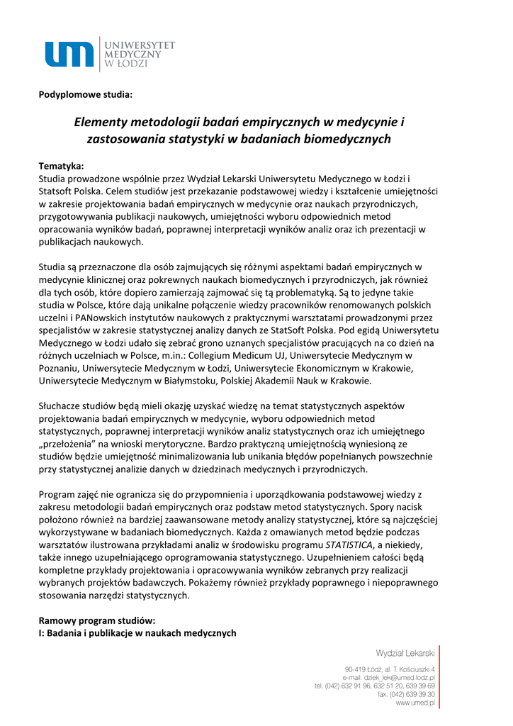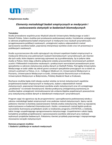 Podyplomowe studia: Elementy metodologii badań empirycznych w medycynie i zastosowania statystyki w badaniach biomedycznych Tematyka: Studia prowadzone wspólnie przez Wydział Lekarski Uniwersytetu Medycznego w Łodzi i Statsoft Polska. Celem studiów jest przekazanie podstawowej wiedzy i kształcenie umiejętności w zakresie projektowania badań empirycznych w medycynie oraz naukach przyrodniczych, przygotowywania publikacji naukowych, umiejętności wyboru odpowiednich metod opracowania wyników badań, poprawnej interpretacji wyników analiz oraz ich prezentacji w publikacjach naukowych. Studia są przeznaczone dla osób zajmujących się różnymi aspektami badań empirycznych w medycynie klinicznej oraz pokrewnych naukach biomedycznych i przyrodniczych, jak również dla tych osób, które dopiero zamierzają zajmować się tą problematyką. Są to jedyne takie studia w Polsce, które dają unikalne połączenie wiedzy pracowników renomowanych polskich uczelni i PANowskich instytutów naukowych z praktycznymi warsztatami prowadzonymi przez specjalistów w zakresie statystycznej analizy danych ze StatSoft Polska. Pod egidą Uniwersytetu Medycznego w Łodzi udało się zebrać grono uznanych specjalistów pracujących na co dzień na różnych uczelniach w Polsce, m.in.: Collegium Medicum UJ, Uniwersytecie Medycznym w Poznaniu, Uniwersytecie Medycznym w Łodzi, Uniwersytecie Ekonomicznym w Krakowie, Uniwersytecie Medycznym w Białymstoku, Polskiej Akademii Nauk w Krakowie. Słuchacze studiów będą mieli okazję uzyskać wiedzę na temat statystycznych aspektów projektowania badań empirycznych w medycynie, wyboru odpowiednich metod statystycznych, poprawnej interpretacji wyników analiz statystycznych oraz ich umiejętnego „przełożenia” na wnioski merytoryczne. Bardzo praktyczną umiejętnością wyniesioną ze studiów będzie umiejętność minimalizowania lub unikania błędów popełnianych powszechnie przy statystycznej analizie danych w dziedzinach medycznych i przyrodniczych. Program zajęć nie ogranicza się do przypomnienia i uporządkowania podstawowej wiedzy z zakresu metodologii badań empirycznych oraz podstaw metod statystycznych. Spory nacisk położono również na bardziej zaawansowane metody analizy statystycznej, które są najczęściej wykorzystywane w badaniach biomedycznych. Każda z omawianych metod będzie podczas warsztatów ilustrowana przykładami analiz w środowisku programu STATISTICA, a niekiedy, także innego uzupełniającego oprogramowania statystycznego. Uzupełnieniem całości będą kompletne przykłady projektowania i opracowywania wyników zebranych przy realizacji wybranych projektów badawczych. Pokażemy również przykłady poprawnego i niepoprawnego stosowania narzędzi statystycznych. Ramowy program studiów: I: Badania i publikacje w naukach medycznych Planowanie i prowadzenie badań empirycznych w medycynie Badania niekliniczne – przygotowywanie i prowadzenie Przygotowywanie publikacji naukowych z badań medycznych II: Przygotowanie danych i zastosowania biostatystyki w opracowywaniu wyników badań medycznych Przygotowanie danych na potrzeby analiz Wybrane elementy rachunku prawdopodobieństwa i metody statystyki opisowej Wprowadzenie do wnioskowania statystycznego Zagadnienie mocy testu i wielkość próby Wybrane metody analizy danych jakościowych oraz wyników badań populacyjnych i diagnostycznych Wybrane metody analizy danych jakościowych oraz wyników badań populacyjnych i diagnostycznych Bardziej zaawansowane techniki wielowymiarowe: Przygotowanie narzędzia badawczego i analiza rzetelności Bardziej zaawansowane techniki wielowymiarowe: Zaawansowane metody statystyczne w skalowaniu i analizie danych - modelowanie równań strukturalnych Wybrane zagadnienia statystycznego planowania eksperymentów i techniki opracowywania ich wyników Wprowadzenie do metod analizy współzależności zjawisk Wybrane zaawansowane metody analizy współzależności zjawisk Wybrane zagadnienia metaanalizy i metaregresji – jak czytać wyniki metaanalizy Metody analizy przeżycia Metody Data Mining Zastosowanie metody automatyczne sieci neuronowe do analizy wyników badań medycznych III: Omówienie wybranych Case studies (jako przykłady „dobrej” i „złej” statystyki) Pięć projektów omówionych analitycznie „krok po kroku” z wyegzekwowaniem procedur i obliczeń wiodących do wyników końcowych IV. Zaliczenie końcowe Kandydaci: Osoby zainteresowane odbyciem studiów powinny posiadać co najmniej podstawową wiedzę z dziedziny statystyki. Czas trwania: 2 semestry, 225-240 godzin dydaktycznych, zajęcia odbywają się w systemie zjazdów w weekendy (soboty i niedziele); przewiduje się 17-18 spotkań. Ilość miejsc: 24 Koszty uczestnictwa: około 6200 zł za rok lub 3100 zł w każdym z semstrów Kierownik studiów: prof. dr hab. Cezary Watała Osoba/y kontaktowa: Cezary Watała (Uniwersytet Medyczny w Łodzi, tel. 602456470, [email protected]) Dane teleadresowe: Adres: Al. Kościuszki 4, 90-419 Łódź; 51°46'11.8"N 19°27'13.7"E Telefon: (48 42) 639 34 71, 272 57 20 Fax: (48 42) 272 57 30 Email: [email protected] WWW: http://www.umed.pl/pl/index1.php?dir=akt&mn=tresc-komunikat&txt=4178 Inne informacje: Rekrutacja prowadzona będzie dwuetapowo: W pierwszym etapie osoby zainteresowane projektem proszone są o złożenie wymaganych dokumentów w biurze projektu do dnia 30 września b.r.: - podanie o przyjęcie na studia podyplomowe, - kwestionariusz osobowy, - odpis dyplomu ukończenia studiów wyższych, - 1 fotografia legitymacyjna. Wymagane dokumenty należy składać osobiście: Dziekanat Wydziału Lekarskiego Uniwersytet Medyczny w Łodzi al. Kościuszki 4 90-419 Łódź I piętro od poniedziałku do piątku w godz. 9.00 - 15.00 tel. (42) 272 59 30 (42) 272 59 32 (42) 272 59 24 Dokumenty można przesłać pocztą na powyższy adres listem poleconym z dopiskiem na kopercie: „Studia podyplomowe - Statystyka