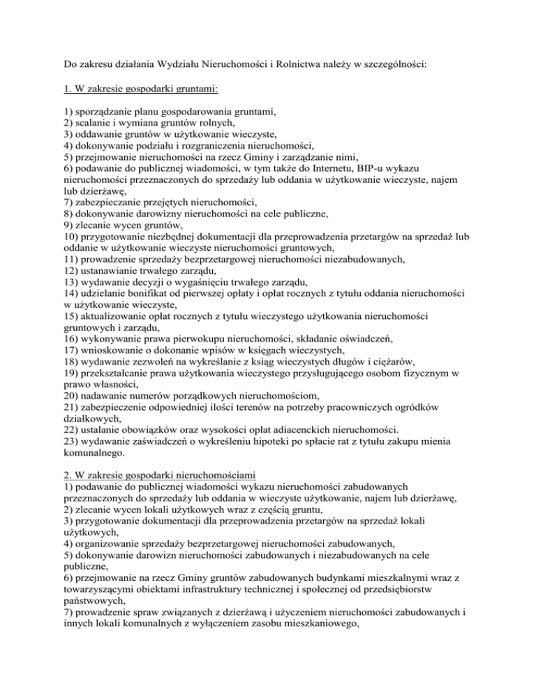 Do zakresu działania Wydziału Nieruchomości i Rolnictwa należy w szczególności: 1. W zakresie gospodarki gruntami: 1) sporządzanie planu gospodarowania gruntami, 2) scalanie i wymiana gruntów rolnych, 3) oddawanie gruntów w użytkowanie wieczyste, 4) dokonywanie podziału i rozgraniczenia nieruchomości, 5) przejmowanie nieruchomości na rzecz Gminy i zarządzanie nimi, 6) podawanie do publicznej wiadomości, w tym także do Internetu, BIP-u wykazu nieruchomości przeznaczonych do sprzedaży lub oddania w użytkowanie wieczyste, najem lub dzierżawę, 7) zabezpieczanie przejętych nieruchomości, 8) dokonywanie darowizny nieruchomości na cele publiczne, 9) zlecanie wycen gruntów, 10) przygotowanie niezbędnej dokumentacji dla przeprowadzenia przetargów na sprzedaż lub oddanie w użytkowanie wieczyste nieruchomości gruntowych, 11) prowadzenie sprzedaży bezprzetargowej nieruchomości niezabudowanych, 12) ustanawianie trwałego zarządu, 13) wydawanie decyzji o wygaśnięciu trwałego zarządu, 14) udzielanie bonifikat od pierwszej opłaty i opłat rocznych z tytułu oddania nieruchomości w użytkowanie wieczyste, 15) aktualizowanie opłat rocznych z tytułu wieczystego użytkowania nieruchomości gruntowych i zarządu, 16) wykonywanie prawa pierwokupu nieruchomości, składanie oświadczeń, 17) wnioskowanie o dokonanie wpisów w księgach wieczystych, 18) wydawanie zezwoleń na wykreślanie z ksiąg wieczystych długów i ciężarów, 19) przekształcanie prawa użytkowania wieczystego przysługującego osobom fizycznym w prawo własności, 20) nadawanie numerów porządkowych nieruchomościom, 21) zabezpieczenie odpowiedniej ilości terenów na potrzeby pracowniczych ogródków działkowych, 22) ustalanie obowiązków oraz wysokości opłat adiacenckich nieruchomości. 23) wydawanie zaświadczeń o wykreśleniu hipoteki po spłacie rat z tytułu zakupu mienia komunalnego. 2. W zakresie gospodarki nieruchomościami 1) podawanie do publicznej wiadomości wykazu nieruchomości zabudowanych przeznaczonych do sprzedaży lub oddania w wieczyste użytkowanie, najem lub dzierżawę, 2) zlecanie wycen lokali użytkowych wraz z częścią gruntu, 3) przygotowanie dokumentacji dla przeprowadzenia przetargów na sprzedaż lokali użytkowych, 4) organizowanie sprzedaży bezprzetargowej nieruchomości zabudowanych, 5) dokonywanie darowizn nieruchomości zabudowanych i niezabudowanych na cele publiczne, 6) przejmowanie na rzecz Gminy gruntów zabudowanych budynkami mieszkalnymi wraz z towarzyszącymi obiektami infrastruktury technicznej i społecznej od przedsiębiorstw państwowych, 7) prowadzenie spraw związanych z dzierżawą i użyczeniem nieruchomości zabudowanych i innych lokali komunalnych z wyłączeniem zasobu mieszkaniowego, 8) ustalanie wysokości stawek czynszu z tytułu najmu i dzierżawy oraz ich waloryzacja, 9) prowadzenie ewidencji mienia komunalnego z wyłączeniem zasobu mieszkaniowego, 10) planowanie remontów, bieżących napraw i konserwacji lokali użytkowych i nieruchomości zabudowanych pozostających w gminnym zasobie (nieprzekazanych w dzierżawę lub użyczenie), przekazywanie tych planów i współdziałanie w ich realizacji z Wydziałem IZP. 3. W zakresie mienia komunalnego: 1) współdziałanie z zarządcą lokali komunalnych (mieszkalnych) oraz z zarządem nieruchomości wspólnej w sprawach dotyczących działań Gminy, a wynikających z przepisu ustawy o własności lokali i przepisów szczególnych, 2) ewidencjonowanie Wspólnot Mieszkaniowych, 3) prowadzenie kontroli wyników sprawowania zarządu lokalami mieszkalnymi i prowadzenie sprawozdawczości na potrzeby Burmistrza, Rady Miejskiej i innych organów zajmujących się statystyką, 4) przygotowywanie projektów uchwał Rady Miejskiej w sprawach: a) zasad wynajmowania lokali mieszkalnych, b) wieloletnich programów gospodarowania mieszkaniowym zasobem Gminy, uwzględniających między innymi podział na lokale socjalne i pozostałe lokale mieszkalne, 5) przygotowywanie projektów zarządzeń Burmistrza w sprawie określania wysokości stawek czynszu regulowanego (mieszkaniowego), 6) prowadzenie innych zadań wynikających z przepisów wykonawczych do ustawy o ochronie praw lokatorów, mieszkaniowym zasobie Gminy i o zmianie kodeksu cywilnego, w tym: a) prowadzenie ewidencji gminnego zasobu mieszkań komunalnych, b) prowadzenie ewidencji osób ubiegających się o mieszkanie komunalne, c) udział w pracach Społecznej Komisji Mieszkaniowej i Komisji Odwoławczej, d) prowadzenie współpracy z zarządcą komunalnego zasobu mieszkaniowego, e) zamiany mieszkań komunalnych pomiędzy osobami fizycznymi, f) przyznawanie mieszkań i lokali socjalnych, 7) gromadzenie informacji o gminnych zasobach mieszkaniowych, a także sektora spółdzielczego, indywidualnego, zakładowego i prywatnego, 8) współdziałanie w rozwiązywaniu problemów mieszkaniowych poprzez: a) określanie potrzeb budowania mieszkań komunalnych i socjalnych, b) uczestniczenie w przeglądach stanu technicznego budynków komunalnych dla ustalenia potrzeb przeprowadzania remontów kapitalnych, modernizacji, nadbudowy oraz rozbiórki, c) reprezentowanie Gminy we wspólnotach mieszkaniowych, 9) opracowywanie planów gospodarowania lokalami komunalnymi oraz planów eksploatacji lokali, 10) na podstawie stosownych upoważnień, nadzorowanie i kontrola realizacji umów z zakresu gospodarki komunalnej, 11) opracowywanie projektów planów budownictwa komunalnego i socjalnego, 4. W zakresie zabytków: 1) opracowywanie i przedkładanie zarządzeń w celu zabezpieczenia zabytku w nagłych przypadkach i niezwłoczne zawiadamianie o tym właściwego Wojewódzkiego Konserwatora Zabytków, 2) wnioskowanie o zgłaszanie WKZ przedmiotów zasługujących na wciągnięcie do rejestru zabytków, 3) opracowywanie wniosków o wpisanie do rejestru zabytków dóbr kultury nieruchomych oraz kolekcji, 4) przyjmowanie zawiadomień o znalezieniu przedmiotu archeo