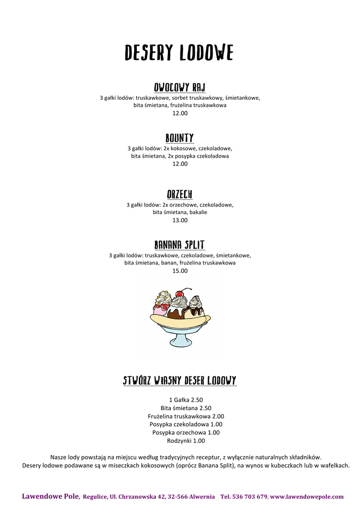 DESERY LODOWE Owocowy Raj 3 gałki lodów: truskawkowe, sorbet truskawkowy, śmietankowe, bita śmietana, frużelina truskawkowa 12.00 Bounty 3 gałki lodów: 2x kokosowe, czekoladowe, bita śmietana, 2x posypka czekoladowa 12.00 Orzech 3 gałki lodów: 2x orzechowe, czekoladowe, bita śmietana, bakalie 13.00 Banana Split 3 gałki lodów: truskawkowe, czekoladowe, śmietankowe, bita śmietana, banan, frużelina truskawkowa 15.00 Stwórz własny deser lodowy 1 Gałka 2.50 Bita śmietana 2.50 Frużelina truskawkowa 2.00 Posypka czekoladowa 1.00 Posypka orzechowa 1.00 Rodzynki 1.00 Nasze lody powstają na miejscu według tradycyjnych receptur, z wyłącznie naturalnych składników. Desery lodowe podawane są w miseczkach kokosowych (oprócz Banana Split), na wynos w kubeczkach lub w wafelkach. Lawendowe Pole, Regulice, Ul. Chrzanowska 42, 32-‐566 Alwernia Tel. 536 703 679, www.lawendowepole.com Lawendowe Pole, Regulice, Ul. Chrzanowska 42, 32-‐566 Alwernia Tel. 536 703 679, www.lawendowepole.com