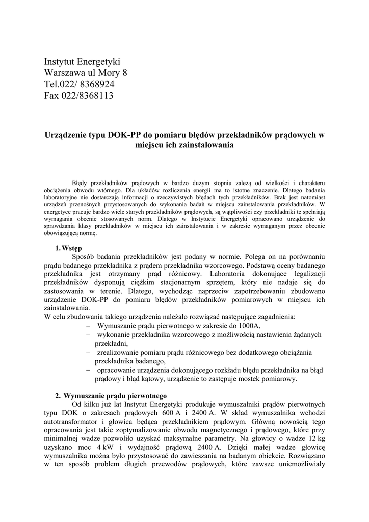 Instytut Energetyki Warszawa ul Mory 8 Tel.022/ 8368924 Fax 022/8368113 Urządzenie typu DOK-PP do pomiaru błędów przekładników prądowych w miejscu ich zainstalowania Błędy przekładników prądowych w bardzo dużym stopniu zależą od wielkości i charakteru obciążenia obwodu wtórnego. Dla układów rozliczenia energii ma to istotne znaczenie. Dlatego badania laboratoryjne nie dostarczają informacji o rzeczywistych błędach tych przekładników. Brak jest natomiast urządzeń przenośnych przystosowanych do wykonania badań w miejscu zainstalowania przekładników. W energetyce pracuje bardzo wiele starych przekładników prądowych, są wątpliwości czy przekładniki te spełniają wymagania obecnie stosowanych norm. Dlatego w Instytucie Energetyki opracowano urządzenie do sprawdzania klasy przekładników w miejscu ich zainstalowania i w zakresie wymaganym przez obecnie obowiązującą normę. 1. Wstęp Sposób badania przekładników jest podany w normie. Polega on na porównaniu prądu badanego przekładnika z prądem przekładnika wzorcowego. Podstawą oceny badanego przekładnika jest otrzymany prąd różnicowy. Laboratoria dokonujące legalizacji przekładników dysponują ciężkim stacjonarnym sprzętem, który nie nadaje się do zastosowania w terenie. Dlatego, wychodząc naprzeciw zapotrzebowaniu zbudowano urządzenie DOK-PP do pomiaru błędów przekładników pomiarowych w miejscu ich zainstalowania. W celu zbudowania takiego urządzenia należało rozwiązać następujące zagadnienia: − Wymuszanie prądu pierwotnego w zakresie do 1000A, − wykonanie przekładnika wzorcowego z możliwością nastawienia żądanych przekładni, − zrealizowanie pomiaru prądu różnicowego bez dodatkowego obciążania przekładnika badanego, − opracowanie urządzenia dokonującego rozkładu błędu przekładnika na błąd prądowy i błąd kątowy, urządzenie to zastępuje mostek pomiarowy. 2. Wymuszanie prądu pierwotnego Od kilku już lat Instytut Energetyki produkuje wymuszalniki prądów pierwotnych typu DOK o zakresach prądowych 600 A i 2400 A. W skład wymuszalnika wchodzi autotransformator i głowica będąca przekładnikiem prądowym. Główną nowością tego opracowania jest takie zoptymalizowanie obwodu magnetycznego i prądowego, które przy minimalnej wadze pozwoliło uzyskać maksymalne parametry. Na głowicy o wadze 12 kg uzyskano moc 4 kW i wydajność prądową 2400 A. Dzięki małej wadze głowicę wymuszalnika można było przystosować do zawieszania na badanym obiekcie. Rozwiązano w ten sposób problem długich przewodów prądowych, które zawsze uniemożliwiały uzyskanie dużych prądów. Do badania przekładników pomiarowych nie ma potrzeby wymuszania tak dużych prądów. Urządzenie jest dostosowane do badania przekładników o prądzie wtórnym 5 A i pierwotnym o wartościach: 5; 10; 15; 20; 30; 50; 75; 100; 150; 200; 300; 500; 600 A W związku z tym wybrano głowicę wumuszalnika o zakresie do 600 A z przewodami o długości po 3 m. Maksymalny dozwolony prąd wynosi 1000A W celu stworzenia urządzenia w postaci walizki pomiarowej zrezygnowano z wykonania głowicy w formie przystosowanej do zawieszania. Ze względu na dużą rozpiętość prądów pierwotnych badanych przekładników zastosowano w głowicy wymuszalnika dwa uzwojenia wtórne, pierwsze do 50 A i drugie do 600 A. Rys. 1. W każdym badaniu wykorzystuje się tylko jedno wybrane uzwojenie. Pomiar wymuszanego prądu pierwotnego w obwodzie badanego przekładnika wykonano z wykorzystaniem dodatkowego przekładnika pomiarowego, rys. 1. W układzie pomiarowym zastosowano prostownik w celu dostosowania się do stałoprądowych wejść mierników, które są dokładniejsze od wejść zmiennoprądowych. Zastosowano przelicznik pomiarowy o wartośći 1 A/1 mV DC. Pomiar jest dokonywany niezależnie czy korzystamy z uzwojenia 50 A, czy 500 A. Prąd mniejszy od 20A należy mierzyć bezpośrednio. W tym celu wykorzystuje się miernik nastawiony na odpowiedni zakres. 3. Przekładnik wzorcowy Przekładnik wzorcowy wykonano z wysokiej klasy blachy permalojowej (stop żelaza z niklem). Niewielkie niezmienne obciążenie obwodu wtórnego powoduje, że całkowity błąd przekładnika wzorcowego nie przekracza 0,1 %. Pomimo to w układzie korekcji błędów wykonano kompensację tego błędu. Przekładnik wzorcowy ma również dwa uzwojenia pierwotne, jedno o zakresie do500 A drugie do 50 A. Uzwojenie 50A ma odczepy dostosowane do prądu: 5; 10; 15; 20; 30 i 50 A. Uzwojenia wtórne odpowiadające tym zakresom ma sześćdziesiąt zwojów. Uzwojenie wysoko prądowe ma odczepy 75; 100; 150 i 300A, korzysta się wtedy również z uzwojenia wtórnego, które ma 60 zwojów. Przekładnik 200/5A odwzorowany zostaje poprzez wykorzystanie dwóch zwojów uzwojenia pierwotnego (to samo uzwojenie co do przekładnika 150A) i osiemdziesięciu zwojów uzwojenia wtórnego. Przekładnik 500/5 odwzorowany zostaje poprzez wykorzystanie jednego zwoju z uzwojenia pierwotnego (to samo uzwojenie co dla prądu 300A) i stu zwojów uzwojenia wtórnego. Możliwe jest również odwzorowanie przekładnika 800/5A. Włącznie mierników lub innych obciążeń w obwód wtórny przekładnika wzorcowego zmienia jego klasę. Nie należy tego robić w trakcie prowadzonych badań. 4. Układ pomiaru różnicy prądów Właściwości układu: − reaktancja układu wynosi ok. 0,01Ω, dzięki temu układ w minimalnym stopniu obciąża badany przekładnik, − rozdzielczość układu pomiarowego wynosi 0,1A, prąd różnicowy o wartości 0,5 mA jest wyraźnie widziany przez układ pomiarowy na tle szumów. Stosowanie boczników prądowych nie dawało oczekiwanych wyników. Dlatego do pomiaru różnicy prądów zastosowano przekładnik pomiarowy z materiałów nanokrystalicznych. Materiały tego typu swoimi własnościami prawie dziesięciokrotnie przewyższają permaloj. Dzięki temu uzyskano układ pomiarowy o rezystancji około 0,01Ω