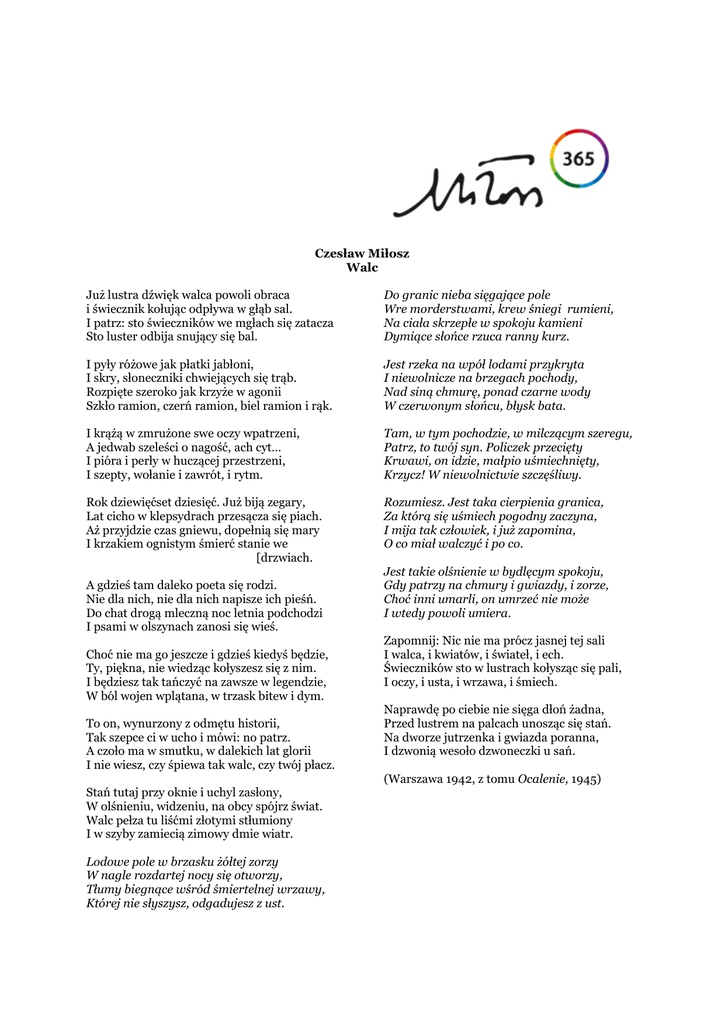 Czesław Miłosz Walc Już lustra dźwięk walca powoli obraca i świecznik kołując odpływa w głąb sal. I patrz: sto świeczników we mgłach się zatacza Sto luster odbija snujący się bal. Do granic nieba sięgające pole Wre morderstwami, krew śniegi rumieni, Na ciała skrzepłe w spokoju kamieni Dymiące słońce rzuca ranny kurz. I pyły różowe jak płatki jabłoni, I skry, słoneczniki chwiejących się trąb. Rozpięte szeroko jak krzyże w agonii Szkło ramion, czerń ramion, biel ramion i rąk. Jest rzeka na wpół lodami przykryta I niewolnicze na brzegach pochody, Nad siną chmurę, ponad czarne wody W czerwonym słońcu, błysk bata. I krążą w zmrużone swe oczy wpatrzeni, A jedwab szeleści o nagość, ach cyt… I pióra i perły w huczącej przestrzeni, I szepty, wołanie i zawrót, i rytm. Tam, w tym pochodzie, w milczącym szeregu, Patrz, to twój syn. Policzek przecięty Krwawi, on idzie, małpio uśmiechnięty, Krzycz! W niewolnictwie szczęśliwy. Rok dziewięćset dziesięć. Już biją zegary, Lat cicho w klepsydrach przesącza się piach. Aż przyjdzie czas gniewu, dopełnią się mary I krzakiem ognistym śmierć stanie we [drzwiach. Rozumiesz. Jest taka cierpienia granica, Za którą się uśmiech pogodny zaczyna, I mija tak człowiek, i już zapomina, O co miał walczyć i po co. A gdzieś tam daleko poeta się rodzi. Nie dla nich, nie dla nich napisze ich pieśń. Do chat drogą mleczną noc letnia podchodzi I psami w olszynach zanosi się wieś. Choć nie ma go jeszcze i gdzieś kiedyś będzie, Ty, piękna, nie wiedząc kołyszesz się z nim. I będziesz tak tańczyć na zawsze w legendzie, W ból wojen wplątana, w trzask bitew i dym. To on, wynurzony z odmętu historii, Tak szepce ci w ucho i mówi: no patrz. A czoło ma w smutku, w dalekich lat glorii I nie wiesz, czy śpiewa tak walc, czy twój płacz. Stań tutaj przy oknie i uchyl zasłony, W olśnieniu, widzeniu, na obcy spójrz świat. Walc pełza tu liśćmi złotymi stłumiony I w szyby zamiecią zimowy dmie wiatr. Lodowe pole w brzasku żółtej zorzy W nagle rozdartej nocy się otworzy, Tłumy biegnące wśród śmiertelnej wrzawy, Której nie słyszysz, odgadujesz z ust. Jest takie olśnienie w bydlęcym spokoju, Gdy patrzy na chmury i gwiazdy, i zorze, Choć inni umarli, on umrzeć nie może I wtedy powoli umiera. Zapomnij: Nic nie ma prócz jasnej tej sali I walca, i kwiatów, i świateł, i ech. Świeczników sto w lustrach kołysząc się pali, I oczy, i usta, i wrzawa, i śmiech. Naprawdę po ciebie nie sięga dłoń żadna, Przed lustrem na palcach unosząc się stań. Na dworze jutrzenka i gwiazda poranna, I dzwonią wesoło dzwoneczki u sań. (Warszawa 1942, z tomu Ocalenie, 1945)