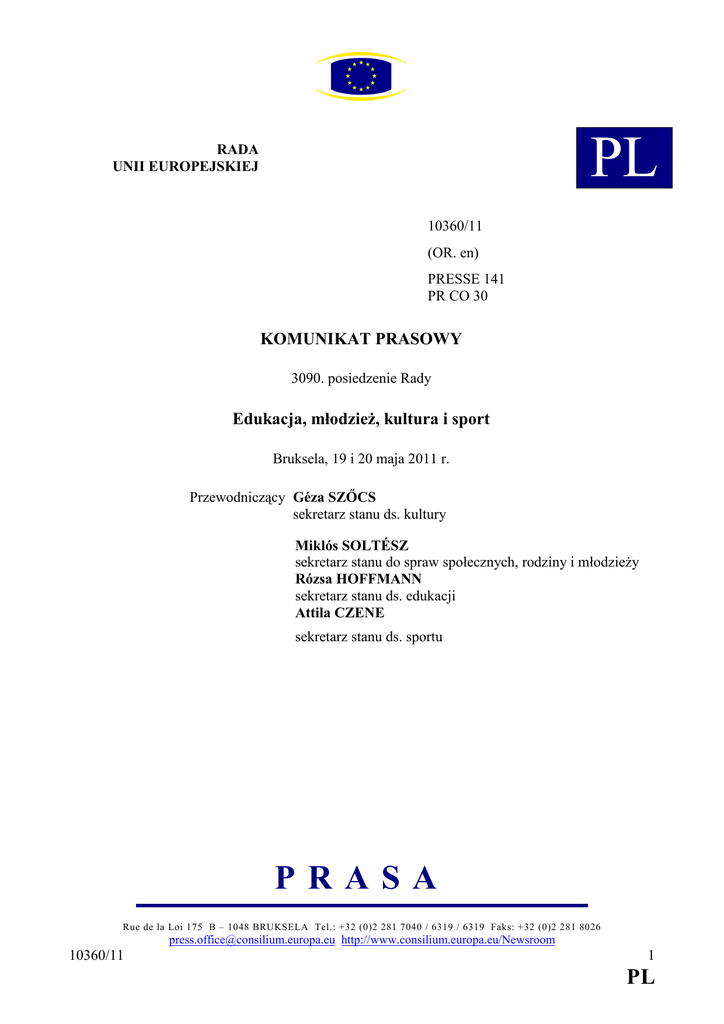 PL RADA UNII EUROPEJSKIEJ 10360/11 (OR. en) PRESSE 141 PR CO 30 KOMUNIKAT PRASOWY 3090. posiedzenie Rady Edukacja, młodzieŜ, kultura i sport Bruksela, 19 i 20 maja 2011 r. Przewodniczący Géza SZİCS sekretarz stanu ds. kultury Miklós SOLTÉSZ sekretarz stanu do spraw społecznych, rodziny i młodzieŜy Rózsa HOFFMANN sekretarz stanu ds. edukacji Attila CZENE sekretarz stanu ds. sportu PRASA Rue de la Loi 175 B – 1048 BRUKSELA Tel.: +32 (0)2 281 7040 / 6319 / 6319 Faks: +32 (0)2 281 8026 [email protected] http://www.consilium.europa.eu/Newsroom 10360/11 1 PL 6.VII.2011 Główne wyniki posiedzenia Rady Kultura Rada osiągnęła porozumienie polityczne w sprawie decyzji ustanawiającej działanie Unii Europejskiej na rzecz znaku dziedzictwa europejskiego. Rada wyznaczyła Pilzno (Republika Czeska) na Europejską Stolicę Kultury na 2015 rok. Rada przyjęła konkluzje w sprawie: – – udziału kultury w realizacji strategii „Europa 2020”; – – słuŜb informacyjnych ds. mobilności dla artystów i osób zawodowo zajmujących się kulturą. Podczas obiadu ministrowie odpowiedzialni za politykę audiowizualną i za kulturę omówili przyszłość programów „Kultura” i „Media” po roku 2013. MłodzieŜ Rada przyjęła dwie rezolucje w sprawie: – promowania nowych, skutecznych form uczestnictwa wszystkich młodych ludzi w Ŝyciu demokratycznym Europy; – usystematyzowanego dialogu z młodzieŜą poświęconego jej zatrudnieniu. Ministrowie omówili wolontariat młodzieŜy i jego udział w rozwoju społeczności lokalnych w kontekście Europejskiego Roku Wolontariatu (2011). Edukacja Rada osiągnęła porozumienie polityczne w sprawie dwóch zaleceń: – jedno dotyczyło promowania mobilności edukacyjnej młodych ludzi; – a drugie – polityki na rzecz ograniczania zjawiska przedwczesnego kończenia nauki. W tym kontekście ministrowie omówili równieŜ – podczas debaty jawnej – polityki prewencyjne w celu zwalczania zjawiska przedwczesnego kończenia nauki ukierunkowane na dzieci ze środowisk defaworyzowanych pod względem społeczno-ekonomicznym, w tym Romów. Ponadto Rada przyjęła konkluzje w sprawie wczesnej edukacji i opieki nad dzieckiem. Sport Rada przyjęła rezolucję w sprawie planu prac Unii Europejskiej w dziedzinie sportu (2011–2014). Ministrowie przeprowadzili debatę jawną na temat sportowych aspektów zakładów bukmacherskich oferowanych w internecie. W porze obiadu odbył się zorganizowany dialog prowadzony na wysokim szczeblu przez ministrów państw członkowskich naleŜących do trojki w rozszerzonym składzie oraz przez przedstawicieli świata sportu. 10360/11 2 PL 6.VII.2011 SPIS TREŚCI1 UCZESTNICY....................................................................................................................................5 OMAWIANE PUNKTY KULTURA...........................................................................................................................................8 Znak dziedzictwa europejskiego ..........................................................................................................8 Europejska Stolica Kultury w 2015 roku .............................................................................................8 Udział kultury w realizacji strategii „Europa 2020” ............................................................................9 SłuŜby informacyjne ds. mobilności ....................................................................................................9 SPRAWY RÓśNE .............................................................................................................................11 MŁODZIEś........................................................................................................................................13 Uczestnictwo młodych ludzi w Ŝyciu demokratycznym Europy .......................................................13 Usystematyzowany dialog z młodzieŜą na temat zatrudnienia ..........................................................13 Wolontariat młodzieŜy .......................................................................................................................14 SPRAWY RÓśNE .............................................................................................................................15 EDUKACJA.......................................................................................................................................16 Przedwczesne kończenie nauki ..........................................................................................................16 Polityki słuŜące zapobieganiu zjawisku przedwczesnego kończenia nauki ......................................16 Mobilność edukacyjna młodych ludzi................................................................................................17 Wczesna edukacja i opieka nad dzieckiem ........................................................................................18 SPRAWY RÓśNE .............................................................................................................................19 1 JeŜeli deklaracje, konkluzje lub rezolucje zostały przez Radę formalnie przyjęte, jest to zaznaczone w tytule danego punktu, a tekst jest umieszczony w cudzysłowie. Dokumenty, do których odesłano w tekście, są dostępne na internetowej stronie Rady (http://www.consilium.europa.eu). Gwiazdką oznaczono akty przyjęte wraz z oświadczeniami do protokołu Rady przeznaczonymi do wiadomości publicznej; oświadczenia te moŜna znaleźć na wyŜej wspomnianej internetowej stronie Rady lub uzyskać z biura prasowego. 10360/11 3 PL 6.VII.2011 SPORT................................................................................................................................................20 Plan prac w dziedzinie sportu.......................................................................................