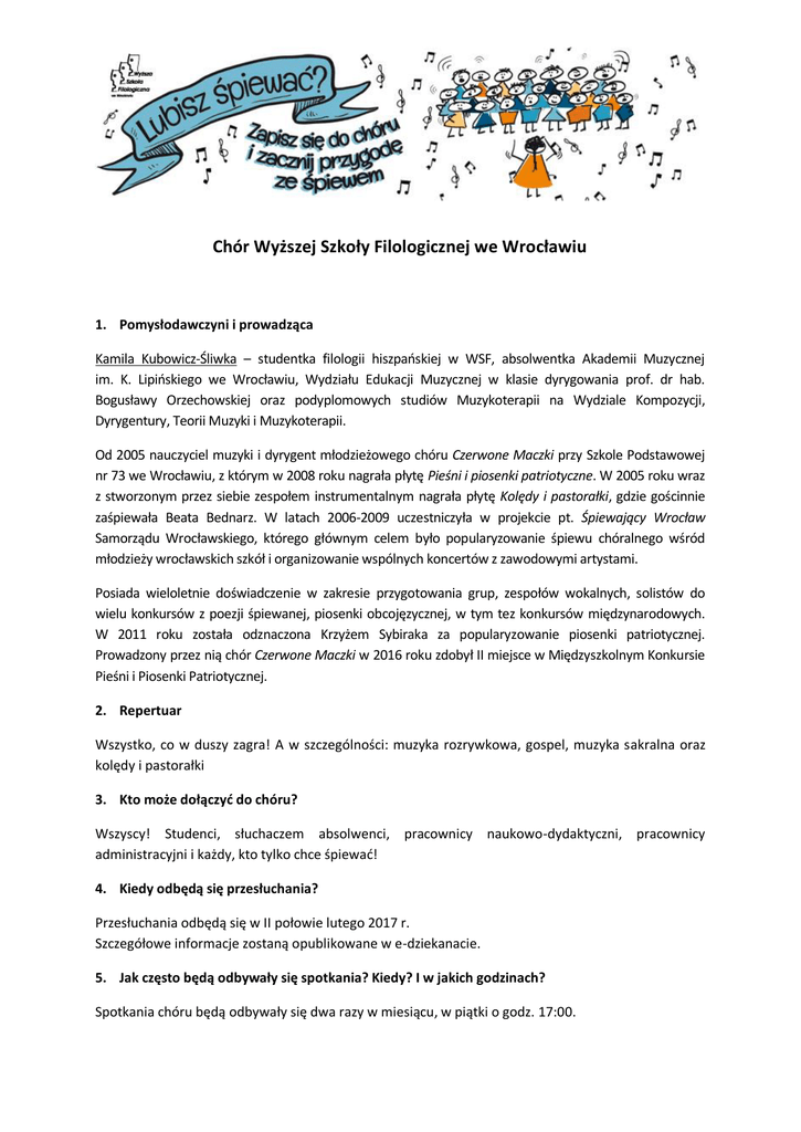 Chór Wyższej Szkoły Filologicznej we Wrocławiu 1. Pomysłodawczyni i prowadząca Kamila Kubowicz-Śliwka – studentka filologii hiszpańskiej w WSF, absolwentka Akademii Muzycznej im. K. Lipińskiego we Wrocławiu, Wydziału Edukacji Muzycznej w klasie dyrygowania prof. dr hab. Bogusławy Orzechowskiej oraz podyplomowych studiów Muzykoterapii na Wydziale Kompozycji, Dyrygentury, Teorii Muzyki i Muzykoterapii. Od 2005 nauczyciel muzyki i dyrygent młodzieżowego chóru Czerwone Maczki przy Szkole Podstawowej nr 73 we Wrocławiu, z którym w 2008 roku nagrała płytę Pieśni i piosenki patriotyczne. W 2005 roku wraz z stworzonym przez siebie zespołem instrumentalnym nagrała płytę Kolędy i pastorałki, gdzie gościnnie zaśpiewała Beata Bednarz. W latach 2006-2009 uczestniczyła w projekcie pt. Śpiewający Wrocław Samorządu Wrocławskiego, którego głównym celem było popularyzowanie śpiewu chóralnego wśród młodzieży wrocławskich szkół i organizowanie wspólnych koncertów z zawodowymi artystami. Posiada wieloletnie doświadczenie w zakresie przygotowania grup, zespołów wokalnych, solistów do wielu konkursów z poezji śpiewanej, piosenki obcojęzycznej, w tym tez konkursów międzynarodowych. W 2011 roku została odznaczona Krzyżem Sybiraka za popularyzowanie piosenki patriotycznej. Prowadzony przez nią chór Czerwone Maczki w 2016 roku zdobył II miejsce w Międzyszkolnym Konkursie Pieśni i Piosenki Patriotycznej. 2. Repertuar Wszystko, co w duszy zagra! A w szczególności: muzyka rozrywkowa, gospel, muzyka sakralna oraz kolędy i pastorałki 3. Kto może dołączyć do chóru? Wszyscy! Studenci, słuchaczem absolwenci, pracownicy naukowo-dydaktyczni, pracownicy administracyjni i każdy, kto tylko chce śpiewać! 4. Kiedy odbędą się przesłuchania? Przesłuchania odbędą się w II połowie lutego 2017 r. Szczegółowe informacje zostaną opublikowane w e-dziekanacie. 5. Jak często będą odbywały się spotkania? Kiedy? I w jakich godzinach? Spotkania chóru będą odbywały się dwa razy w miesiącu, w piątki o godz. 17:00.