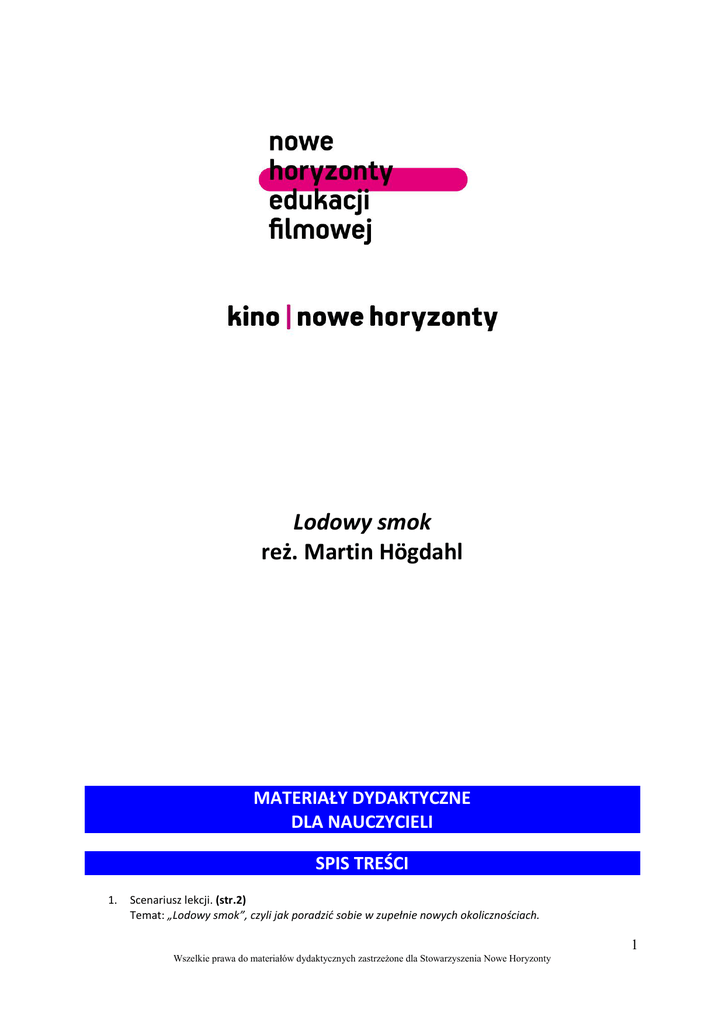 Lodowy smok reż. Martin Högdahl MATERIAŁY DYDAKTYCZNE DLA NAUCZYCIELI SPIS TREŚCI 1. Scenariusz lekcji. (str.2) Temat: „Lodowy smok”, czyli jak poradzid sobie w zupełnie nowych okolicznościach. 1 Wszelkie prawa do materiałów dydaktycznych zastrzeżone dla Stowarzyszenia Nowe Horyzonty SCENARIUSZ LEKCJI Opracowała: Iwona Złotnicka-Brzózka Temat: „Lodowy smok”, czyli jak poradzid sobie w zupełnie nowych okolicznościach. CELE LEKCJI Po lekcji uczeo powinien: • dostrzegad problemy poruszone w filmie – trudności rodzinne, adopcja, nowa sytuacja życiowa; • prezentowad swoje poglądy; • prowadzid dyskusję: argumentowad, wnioskowad, formułowad sądy. METODY I FORMY PRACY • praca w grupach, • praca indywidualna, • dyskusja. ŚRODKI DYDAKTYCZNE film: Lodowy smok, reż. M. Högdahl, Szwecja 2012. CZAS 1 godzina lekcyjna (np. godzina wychowawcza) 2 Wszelkie prawa do materiałów dydaktycznych zastrzeżone dla Stowarzyszenia Nowe Horyzonty PRZEBIEG LEKCJI 1. Wprowadzenie. Nauczyciel przypomina tytuł filmu, który uczniowie obejrzeli w kinie. Zapowiada, że głównym tematem lekcji będzie trudna sytuacja głównego bohatera filmu – Mika, z czego wynikała, jak chłopiec radził sobie z problemami. Nauczyciel zadaje uczniom pytanie: jakie trudności przeżywał Mike? Możliwe odpowiedzi: ojciec, który nie jest w stanie zająd się chłopcem, koledzy ze szkoły wyśmiewają się z niego, musi sobie sam radzid w życiu, zmiana miejsca zamieszkania i nowi koledzy, adopcja – Mike trafia do rodziny, w której źle się czuje, brak zrozumienia ze strony dorosłych, inne… 2. Dyskusja. Każdy z nas, podobnie jak Mike, przeżywa w swoim życiu trudniejsze momenty. Co można zrobid w takich sytuacjach? Co robicie, żeby pokonad kłopoty i nie poddad się im? Rozważania uczniów można ukierunkowad na sferę rodzinną i szkolną. Na przykład: Często uskarżamy się na swoją sytuację życiową – na siostrę, brata, którzy przeszkadzają nam w odrabianiu lekcji, z którymi musimy dzielid pokój, zdarza nam się pokłócid z rodzicami, w szkole dochodzi do nieporozumieo z kolegami, koleżankami z klasy... Co robid w takich sytuacjach, jak się zachowad? Wypowiedzi uczniów można zapisywad na tablicy. Nauczyciel podsumowuje dyskusję. Może również poprosid któregoś z uczniów, aby spróbował sformowad wniosek/wnioski. Przykładowe wnioski: Nawet w najtrudniejszych chwilach warto szukad pozytywnych stron. Kłopoty zdarzają się każdemu. Wszędzie dobrze, gdzie nas nie ma. Zawsze znajdzie się wyjście, nawet z najtrudniejszej sytuacji. 3. Dwiczenie w grupach (w parach lub trójkach). Mike, zmieniając miejsce zamieszkania, musiał zmienid również szkołę. Taka sytuacja zawsze wiąże się z dużym stresem. W nowej szkole czekają nowi koledzy, nowi nauczyciele, nowe zwyczaje. Zadaniem uczniów będzie napisanie zbioru 3 Wszelkie prawa do materiałów dydaktycznych zastrzeżone dla Stowarzyszenia Nowe Horyzonty dobrych rad (5-8 punktów), propozycji, co można zrobid i jak się zachowad, gdy trafia się do nowej grupy. Ważne! Nauczyciel powinien podkreślid, że nie chodzi o to, aby za wszelką cenę dopasowad się do nowego środowiska. 4. Podsumowanie dwiczenia. Podczas gdy uczniowie będą odczytywali swoje prace, należy na bieżąco odwoływad się do opinii reszty klasy; czy dzieci uważają, że odczytywana rada jest słuszna i pomocna. Jest to doskonała okazja, aby uczniowie pomyśleli o tym, gdzie są granice dopasowywania się do nowej sytuacji, do nowych znajomych. 5. Podsumowanie lekcji. Nauczyciel dziękuje uczniom za aktywność podczas lekcji. Zadaje pracę domową. PRACA DOMOWA Praca indywidualna: plakat. Często nie doceniamy tego, co mamy. Skupiamy się na minusach zamiast na pozytywnych stronach. Zadaniem uczniów będzie wykonanie plakatu na temat: Jest mi dobrze tu, gdzie jestem. 4 Wszelkie prawa do materiałów dydaktycznych zastrzeżone dla Stowarzyszenia Nowe Horyzonty