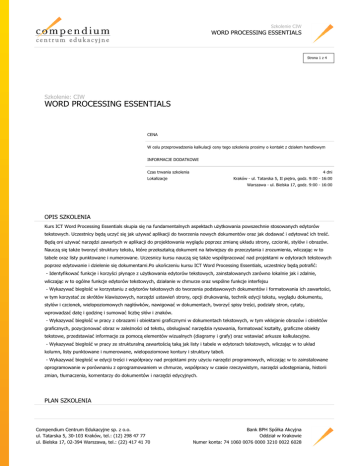 Szkolenie CIW WORD PROCESSING ESSENTIALS Strona 1 z 4 Szkolenie: CIW WORD PROCESSING ESSENTIALS CENA W celu przeprowadzenia kalkulacji ceny tego szkolenia prosimy o kontakt z działem handlowym INFORMACJE DODATKOWE Czas trwania szkolenia 4 dni Lokalizacje Kraków - ul. Tatarska 5, II piętro, godz. 9:00 - 16:00 Warszawa - ul. Bielska 17, godz. 9:00 - 16:00 OPIS SZKOLENIA Kurs ICT Word Processing Essentials skupia się na fundamentalnych aspektach użytkowania powszechnie stosowanych edytorów tekstowych. Uczestnicy będą uczyć się jak używać aplikacji do tworzenia nowych dokumentów oraz jak dodawać i edytować ich treść. Będą oni używać narzędzi zawartych w aplikacji do projektowania wyglądu poprzez zmianę układu strony, czcionki, stylów i obrazów. Nauczą się także tworzyć struktury tekstu, które przekształcą dokument na łatwiejszy do przeczytania i zrozumienia, wliczając w to tabele oraz listy punktowane i numerowane. Uczesnicy kursu nauczą się także współpracować nad projektami w edytorach tekstowych poprzez edytowanie i dzielenie się dokumentami.Po ukończeniu kursu ICT Word Processing Essentials, uczestnicy będą potrafić: - Identyfikować funkcje i korzyści płynące z użytkowania edytorów tekstowych, zainstalowanych zarówno lokalnie jak i zdalnie, wliczając w to ogólne funkcje edytorów tekstowych, działanie w chmurze oraz wspólne funkcje interfejsu - Wykazywać biegłość w korzystaniu z edytorów tekstowych do tworzenia podstawowych dokumentów i formatowania ich zawartości, w tym korzystać ze skrótów klawiszowych, narzędzi ustawień strony, opcji drukowania, technik edycji tekstu, wyglądu dokumentu, stylów i czcionek, wielopoziomowych nagłówków, nawigować w dokumentach, tworzyć spisy treści, podziały stron, cytaty, wprowadzać datę i godzinę i sumować liczbę słów i znaków. - Wykazywać biegłość w pracy z obrazami i obiektami graficznymi w dokumentach tekstowych, w tym wklejanie obrazów i obiektów graficznych, pozycjonować obraz w zależności od tekstu, obsługiwać narzędzia rysowania, formatować kształty, graficzne obiekty tekstowe, przedstawiać informacje za pomocą elementów wizualnych (diagramy i grafy) oraz wstawiać arkusze kalkulacyjne. - Wykazywać biegłość w pracy ze strukturalną zawartością taką jak listy i tabele w edytorach tekstowych, wliczając w to układ kolumn, listy punktowane i numerowane, wielopoziomowe kontury i struktury tabeli. - Wykazywać biegłość w edycji treści i współpracy nad projektami przy użyciu narzędzi programowych, wliczając w to zainstalowane oprogramowanie w porównaniu z oprogramowaniem w chmurze, współpracy w czasie rzeczywistym, narzędzi udostępniania, historii zmian, tłumaczenia, komentarzy do dokumentów i narzędzi edycyjnych. PLAN SZKOLENIA Compendium Centrum Edukacyjne sp. z o.o. ul. Tatarska 5, 30-103 Kraków, tel.: (12) 298 47 77 ul. Bielska 17, 02-394 Warszawa, tel.: (22) 417 41 70 Bank BPH Spółka Akcyjna Oddział w Krakowie Numer konta: 74 1060 0076 0000 3210 0022 6028 Szkolenie CIW WORD PROCESSING ESSENTIALS Strona 2 z 4 - Wprowadzenie do przetwarzania tekstu - Czym jest edytor tekstu? - Google Drive, czyli dane w chmurze - Pierwsze kroki z Google Docs - Powszechne skróty klawiaturowe - Wyszukiwanie Warunków Google Docs - Przegląd opcji menu Google Docs - Przegląd paska narzędzi Google Docs - Quiz - Tworzenie i edycja dokumentów - Tworzenie i edycja dokumentów w edytorze tekstu - Formatowanie tekstu - Wyszukiwanie i sprawdzanie zawartości - Powoływanie się na źródła - Opcje ustawień strony - Opcje drukowania - Inne narzędzia do pracy z dokumentami - Instalacja dodatków w Google Docs - Opcje paska narzędzi - Quiz Compendium Centrum Edukacyjne sp. z o.o. ul. Tatarska 5, 30-103 Kraków, tel.: (12) 298 47 77 ul. Bielska 17, 02-394 Warszawa, tel.: (22) 417 41 70 Bank BPH Spółka Akcyjna Oddział w Krakowie Numer konta: 74 1060 0076 0000 3210 0022 6028 Szkolenie CIW WORD PROCESSING ESSENTIALS Strona 3 z 4 - Praca z obrazami i kształtami w dokumentach - Obrazy i kształty w dokumentach - Praca z obrazami - Pozycjonowanie obrazów w dokumentach - Praca z narzędziami rysowania w edytorze tekstu - Quiz - Kształtowanie zawartości tekstowej w dokumentach - Zawartość tekstowa w dokumentach - Kolumny - Listy - Tabele - Quiz - Przegląd i współpraca nad dokumentami - Przegląd i współpraca nad dokumentem - Współpraca online - Współpraca w czasie rzeczywistym i automatyczny zapis Compendium Centrum Edukacyjne sp. z o.o. ul. Tatarska 5, 30-103 Kraków, tel.: (12) 298 47 77 ul. Bielska 17, 02-394 Warszawa, tel.: (22) 417 41 70 Bank BPH Spółka Akcyjna Oddział w Krakowie Numer konta: 74 1060 0076 0000 3210 0022 6028 Szkolenie CIW WORD PROCESSING ESSENTIALS Strona 4 z 4 - Przegląd historii i udostępnianie - Publikowanie dokumentów w sieci WWW - Tłumaczenie języków - Sugestie i przegląd edycji - Udostępnianie dokumentu - Edycja i komentowanie dokumentu - Translacja dokumentu - Quiz - Case Study: Tworzenie gazety - Case Study: Tworzenie osobistego logo i akronimu CERTYFIKATY Każde ze szkoleń z programu ICT kończy się egzaminem certyfikacyjnym, który stanowi końcową ocenę zdobytej wiedzy i umiejętności przez uczestnika danego szkolenia. Pozytywny wynik egzaminu potwierdzany jest poprzez uzyskanie imiennego certyfikatu w formie cyfrowej, który można dodatkowo samodzielnie wydrukować. Każdy egzamin certyfikacyjny zawiera 30 pytań wielokrotnego wyboru, które są losowane z większej puli i generowane przez system testowy w losowej kolejności. Maksymalny czas trwania egzaminu to 45 min. Kandydaci, aby pozytywnie zakończyć egzamin i uzyskać certyfikat muszą zdobyć minimum 73% poprawnych odpowiedzi. Jeśli kandydat nie zda egzaminu certyfikującego za pierwszym razem ma maksymalnie dwa dodatkowe podejścia. Po uzyskaniu pozytywnego wyniku egzaminu nie ma możliwości jego powtórzenia np. w celu