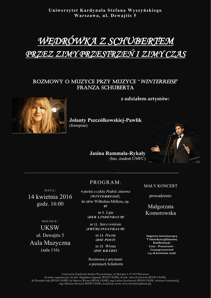Uniwersytet Kardynała Stefana Wyszyńskiego Warszawa, ul. Dewajtis 5 WĘDRÓWKA Z SCHUBERTEM PRZEZ ZIMY PRZESTRZEŃ I ZIMY CZAS Rozmowy o muzyce pRzy muzyce “Winterreise” Franza Schuberta z udziałem artystów: Jolanty Pszczółkowskiej-Pawlik (fortepian) Jasina Rammala-Rykały (bas, student UMFC) P ROG RA M : DATA: 14 kwietnia 2016 godz. 16:00 4 pieśni z cyklu Podróż zimowa (W IN TER RE IS E ), do słów Wilhelma Müllera, op. 89 nr 5. Lipa (DER LI ND EN BA UM ) MIEJSCE: UKSW nr 11. Sen o wiośnie (F RÜ HL IN GS T RA UM ) ul. Dewajtis 5 nr 13. Poczta (DIE P OS T ) Aula Muzyczna (sala 116) nr 15. Wrona (DIE KR ÄH E ) MAŁY KONCERT prowadzenie: Małgorzata Komorowska Impreza towarzysząca V Interdyscyplinarnej Konferencji: Czas - Przestrzeń – Czasoprzestrzeń (14-16 kwietnia 2016) Rozmowa z artystami o pieśniach Schuberta Uniwersytet Kardynała Stefana Wyszyńskiego, ul. Dewajtis 5, 01-815 Warszawa. Komitet organizacyjny: dr hab. Magdalena Saganiak [WNH UKSW], dr hab. Anna Kozłowska [WNH UKSW], dr Dominik Sulej [WNH UKSW], dr Mateusz Werner [WNH UKSW], mgr Łukasz Kucharczyk [WNH UKSW, sekretarz konferencji], mgr Marzena Mroczek [WNH UKSW, moderacja strony www.interdyscyplinaria.pl].