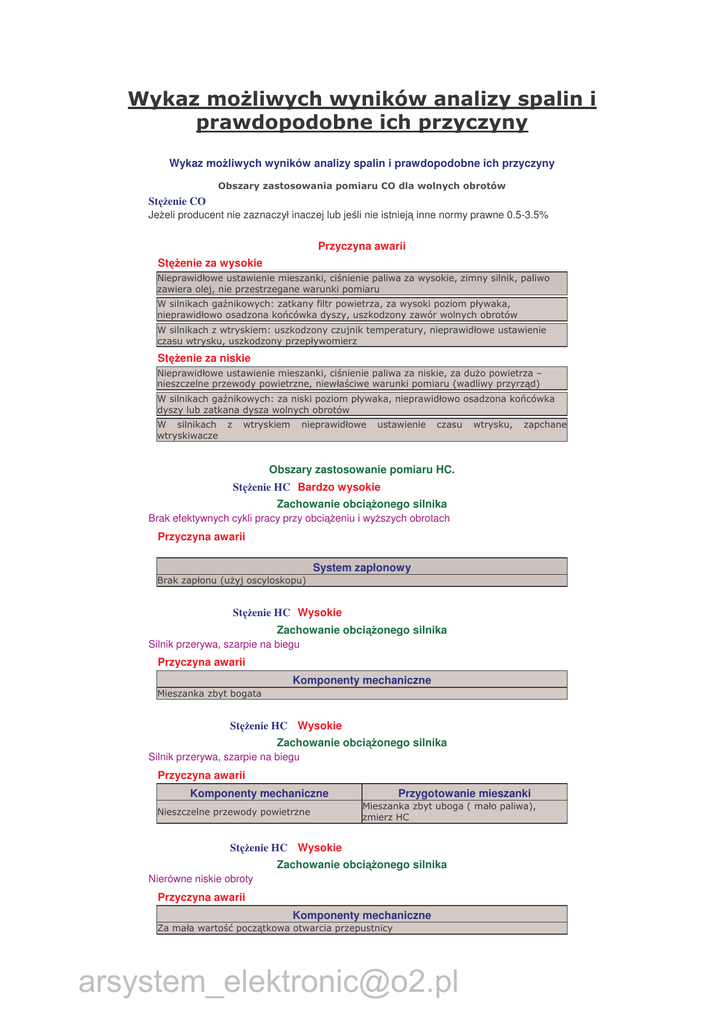 Wykaz mo liwych wyników analizy spalin i prawdopodobne ich przyczyny St enie CO Je eli producent nie zaznaczył inaczej lub je li nie istniej inne normy prawne 0.5-3.5% Przyczyna awarii St enie za wysokie ! St enie za niskie " $ ! # %& ! Obszary zastosowanie pomiaru HC. St enie HC Bardzo wysokie Zachowanie obci Brak efektywnych cykli pracy przy obci onego silnika eniu i wy szych obrotach Przyczyna awarii System zapłonowy ' $" & St enie HC Wysokie Zachowanie obci onego silnika Silnik przerywa, szarpie na biegu Przyczyna awarii Komponenty mechaniczne ( ! ! St enie HC Wysokie Zachowanie obci onego silnika Silnik przerywa, szarpie na biegu Przyczyna awarii Komponenty mechaniczne Przygotowanie mieszanki ( ! ! )* St enie HC Wysokie Zachowanie obci onego silnika Nierówne niskie obroty Przyczyna awarii Komponenty mechaniczne + , % [email protected] $ & St enie HC Wysokie Zachowanie obci onego silnika Nierówne niskie obroty Przyczyna awarii Przygotowanie mieszanki ( ! ! !! St enie HC Wysokie Zachowanie obci onego silnika Silnik przy piesza Przyczyna awarii Komponenty mechaniczne -! $ & St enie HC Zawarto HC w płynie chłodniczym Przyczyna awarii Komponenty mechaniczne . % St enie HC Nieszczelno ci w przewodach paliwowych Przyczyna awarii Przygotowanie mieszanki / ! St enie HC Katalizator test, je eli CO<0.1, HC>20 ppm, CO>14% Przyczyna awarii Komponenty mechaniczne 0" Przygotowanie mieszanki % + Obszary zastosowania pomiaru CO2. CO2 CO HC ' ' ! ! ' ! ! Katalizator ' + ! - " ! 1 " Powy ej limitu " " [email protected]