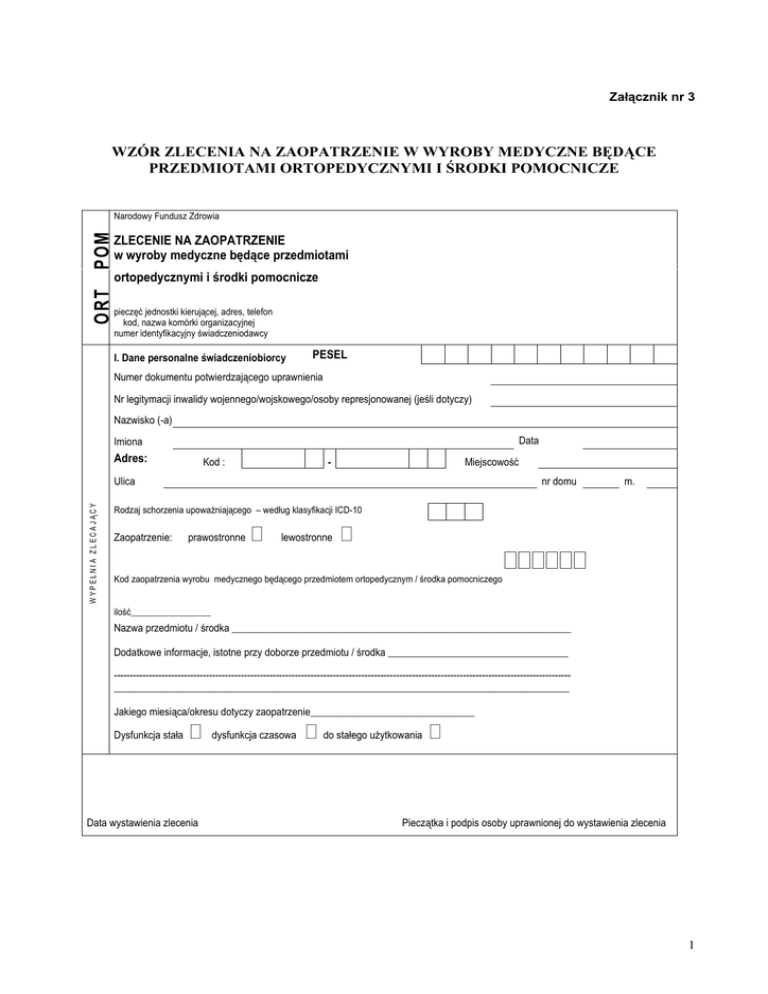 Załącznik nr 3 WZÓR ZLECENIA NA ZAOPATRZENIE W WYROBY MEDYCZNE BĘDĄCE PRZEDMIOTAMI ORTOPEDYCZNYMI I ŚRODKI POMOCNICZE ORT POM Narodowy Fundusz Zdrowia ZLECENIE NA ZAOPATRZENIE w wyroby medyczne będące przedmiotami ortopedycznymi i środki pomocnicze pieczęć jednostki kierującej, adres, telefon kod, nazwa komórki organizacyjnej numer identyfikacyjny świadczeniodawcy I. Dane personalne świadczeniobiorcy PESEL Numer dokumentu potwierdzającego uprawnienia Nr legitymacji inwalidy wojennego/wojskowego/osoby represjonowanej (jeśli dotyczy) Nazwisko (-a) Data Imiona Adres: Kod : - Miejscowość WYPEŁNIA ZLECAJĄCY Ulica nr domu m. Rodzaj schorzenia upoważniającego – według klasyfikacji ICD-10 Zaopatrzenie: prawostronne lewostronne Kod zaopatrzenia wyrobu medycznego będącego przedmiotem ortopedycznym / środka pomocniczego ilość_________________ Nazwa przedmiotu / środka ________________________________________________________________ Dodatkowe informacje, istotne przy doborze przedmiotu / środka __________________________________ -----------------------------------------------------------------------------------------------------------------------------------------------______________________________________________________________________________________ Jakiego miesiąca/okresu dotyczy zaopatrzenie_______________________________ Dysfunkcja stała Data wystawienia zlecenia dysfunkcja czasowa do stałego użytkowania Pieczątka i podpis osoby uprawnionej do wystawienia zlecenia 1 WYPEŁNIA PRACOWNIK NFZ LUB REALIZATOR ZAOPATRZENIA II. Potwierdzenie prawa do uzyskania wyrobu medycznego będącego przedmiotem ortopedycznym lub środka pomocniczego bezpłatnie lub za częściową odpłatnością: Nr Oddziału NFZ : ............... Kod przedmiotu / środka: ________________________ Zlecenie ważne do _____________________ Limit cenowy ____________________ Refundacja NFZ w % ______________________ Ostatnio otrzymane przedmioty/ środki tego rodzaju (data): _____________________________ ____________________________________________ Podpis i pieczątka pracownika NFZ lub Realizatora zlecenia (zaopatrzenie comiesięczne) III. Potwierdzenie odbioru wyrobu medycznego będącego przedmiotem ortopedycznym / środka pomocniczego: WYPEŁNIA REALIZATOR I OSOBA ODBIERAJĄCA __________________________________ Pieczęć zakładu __________________________ data przyjęcia do realizacji Ilość przedmiotów / środków____________________Rodzaj (typ, nr fabryczny, itp.) _________________________ Kwota refundacji _____________________kwota zapłacona przez ubezpieczonego __________________________ Potwierdzam odbiór prawidłowo wykonanego przedmiotu/środka ___________________________ Podpis Realizatora ________________________________________ Nazwisko, imię i podpis odbierającego ___________________________ Data odbioru ________________________________________ PESEL osoby odbierającej Uwaga: • Jeżeli cena wydanego wyrobu medycznego będącego przedmiotem ortopedycznym/środka pomocniczego jest niższa lub równa określonemu limitowi ceny – NFZ należy obciążyć ceną wyrobu medycznego będącego przedmiotem ortopedycznym/środka pomocniczego w przypadku refundacji pełnej lub na kwotę stanowiącą 50, 70% ceny wyrobu medycznego będącego przedmiotem ortopedycznym/środka pomocniczego w przypadku refundacji częściowej. W podanym przypadku oraz w sytuacji, gdy cena wyrobu medycznego będącego przedmiotem ortopedycznym/środka pomocniczego jest wyższa niż określa limit – różnicę oraz kwotę ponad limit pokrywa świadczeniobiorcy. 2