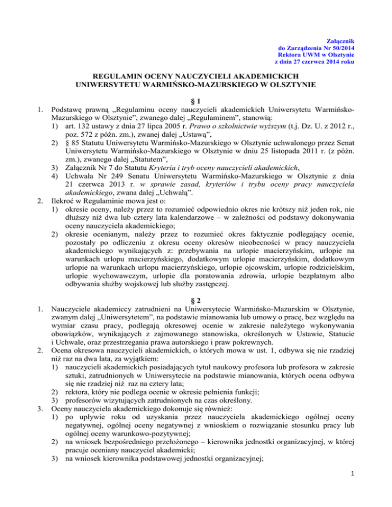 Załącznik do Zarządzenia Nr 50/2014 Rektora UWM w Olsztynie z dnia 27 czerwca 2014 roku REGULAMIN OCENY NAUCZYCIELI AKADEMICKICH UNIWERSYTETU WARMIŃSKO-MAZURSKIEGO W OLSZTYNIE 1. 2. 1. 2. 3. §1 Podstawę prawną „Regulaminu oceny nauczycieli akademickich Uniwersytetu WarmińskoMazurskiego w Olsztynie”, zwanego dalej „Regulaminem”, stanowią: 1) art. 132 ustawy z dnia 27 lipca 2005 r. Prawo o szkolnictwie wyższym (t.j. Dz. U. z 2012 r., poz. 572 z późn. zm.), zwanej dalej „Ustawą”, 2) § 85 Statutu Uniwersytetu Warmińsko-Mazurskiego w Olsztynie uchwalonego przez Senat Uniwersytetu Warmińsko-Mazurskiego w Olsztynie w dniu 25 listopada 2011 r. (z późn. zm.), zwanego dalej „Statutem”, 3) Załącznik Nr 7 do Statutu Kryteria i tryb oceny nauczycieli akademickich, 4) Uchwała Nr 249 Senatu Uniwersytetu Warmińsko-Mazurskiego w Olsztynie z dnia 21 czerwca 2013 r. w sprawie zasad, kryteriów i trybu oceny pracy nauczyciela akademickiego, zwana dalej „Uchwałą”. Ilekroć w Regulaminie mowa jest o: 1) okresie oceny, należy przez to rozumieć odpowiednio okres nie krótszy niż jeden rok, nie dłuższy niż dwa lub cztery lata kalendarzowe – w zależności od podstawy dokonywania oceny nauczyciela akademickiego; 2) okresie ocenianym, należy przez to rozumieć okres faktycznie podlegający ocenie, pozostały po odliczeniu z okresu oceny okresów nieobecności w pracy nauczyciela akademickiego wynikających z: przebywania na urlopie macierzyńskim, urlopie na warunkach urlopu macierzyńskiego, dodatkowym urlopie macierzyńskim, dodatkowym urlopie na warunkach urlopu macierzyńskiego, urlopie ojcowskim, urlopie rodzicielskim, urlopie wychowawczym, urlopie dla poratowania zdrowia, urlopie bezpłatnym albo odbywania służby wojskowej lub służby zastępczej. §2 Nauczyciele akademiccy zatrudnieni na Uniwersytecie Warmińsko-Mazurskim w Olsztynie, zwanym dalej „Uniwersytetem”, na podstawie mianowania lub umowy o pracę, bez względu na wymiar czasu pracy, podlegają okresowej ocenie w zakresie należytego wykonywania obowiązków, wynikających z zajmowanego stanowiska, określonych w Ustawie, Statucie i Uchwale, oraz przestrzegania prawa autorskiego i praw pokrewnych. Ocena okresowa nauczycieli akademickich, o których mowa w ust. 1, odbywa się nie rzadziej niż raz na dwa lata, za wyjątkiem: 1) nauczycieli akademickich posiadających tytuł naukowy profesora lub profesora w zakresie sztuki, zatrudnionych w Uniwersytecie na podstawie mianowania, których ocena odbywa się nie rzadziej niż raz na cztery lata; 2) rektora, który nie podlega ocenie w okresie pełnienia funkcji; 3) profesorów wizytujących zatrudnionych na czas określony. Oceny nauczyciela akademickiego dokonuje się również: 1) po upływie roku od uzyskania przez nauczyciela akademickiego ogólnej oceny negatywnej, ogólnej oceny negatywnej z wnioskiem o rozwiązanie stosunku pracy lub ogólnej oceny warunkowo-pozytywnej; 2) na wniosek bezpośredniego przełożonego – kierownika jednostki organizacyjnej, w której pracuje oceniany nauczyciel akademicki; 3) na wniosek kierownika podstawowej jednostki organizacyjnej; 1 4. 1. 2. 3. 4. 5. 1. 2. 3. 4) na wniosek nauczyciela akademickiego, który ma podlegać ocenie; 5) przed upływem okresu, na który nauczyciel akademicki został zatrudniony; 6) przed upływem okresów, o których mowa w art. 120 Ustawy i § 98a Statutu. Warunkiem przeprowadzenia oceny jest co najmniej roczne nieprzerwane zatrudnienie nauczyciela akademickiego w Uniwersytecie, zaś oceniany okres nie może być krótszy niż rok. §3 Przedmiotem okresowej oceny są wyniki pracy nauczyciela akademickiego uzyskane od ostatniej oceny. W ocenie nauczyciela akademickiego uwzględnia się osiągnięcia naukowe lub artystyczne z uwzględnieniem kształcenia kadr, osiągnięcia dydaktyczne oraz osiągnięcia organizacyjne z uwzględnieniem działalności popularyzatorskiej, w których występuje on jako pracownik Uniwersytetu. Oceny nauczyciela akademickiego dokonuje się na podstawie „Arkusza Oceny Okresowej Nauczyciela Akademickiego Uniwersytetu Warmińsko-Mazurskiego w Olsztynie”, zwanego dalej „Arkuszem Oceny” stanowiącego Załącznik do Uchwały, zawierającego ocenę punktową zgodnie z kryteriami zawartymi w: 1) Tabeli Nr 1 „Ocena punktowa działalności naukowej i kształcenia kadr” – § 6 Uchwały; 2) Tabeli Nr 2 „Ocena punktowa działalności dydaktycznej” – § 7 Uchwały; 3) Tabeli Nr 3 „Ocena punktowa działalności organizacyjnej i popularyzatorskiej” – § 8 Uchwały. Skala ocen każdego obszaru działalności jest czterostopniowa i obejmuje następujące oceny: 1) bardzo dobra, 2) dobra, 3) dostateczna, 4) negatywna. Skala ostatecznej oceny końcowej jest trzystopniowa i obejmuje następujące oceny: 1) pozytywna, 2) warunkowo-pozytywna, 3) negatywna z wnioskiem o rozwiązanie stosunku pracy. §4 Jednostka właściwa ds. kadr przekazuje drogą elektroniczną do 1 marca oraz 1 października każdego roku informację o konieczności wypełnienia Arkusza Oceny ocenianemu i bezpośredniemu przełożonemu - kierownikowi jednostki ocenianego nauczyciela akademickiego, którzy niezwłocznie nadają bieg ocenie. W pozostałych przypadkach przekazanie Arkusza Oceny następuje niezwłocznie po wpłynięciu stosownego wniosku. Arkusz Oceny wypełnia oceniany nauczyciel akademicki z wyjątkiem pól przeznaczonych do wypełnienia przez jednostkę właściwą ds. kadr, bezpośredniego przełożonego, prodziekana ds. studiów lub właściwego prorektora, właściwą komisję oceniającą i rektora. Nauczyciel akademicki zobowiązany jest do zachowania należytej staranności i rzetelności podczas wypełniania Arkusza Oceny. Nauczyciel akademicki może dodatkowo dołączyć do Arkusza Oceny informacje zawierające istotne fakty dotyczące swoich pozostałych osiągnięć: naukowych, uwzględniających kształcenie kadr naukowych, dydaktycznych, organizacyjn