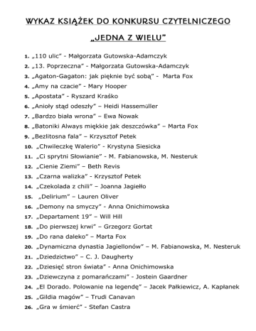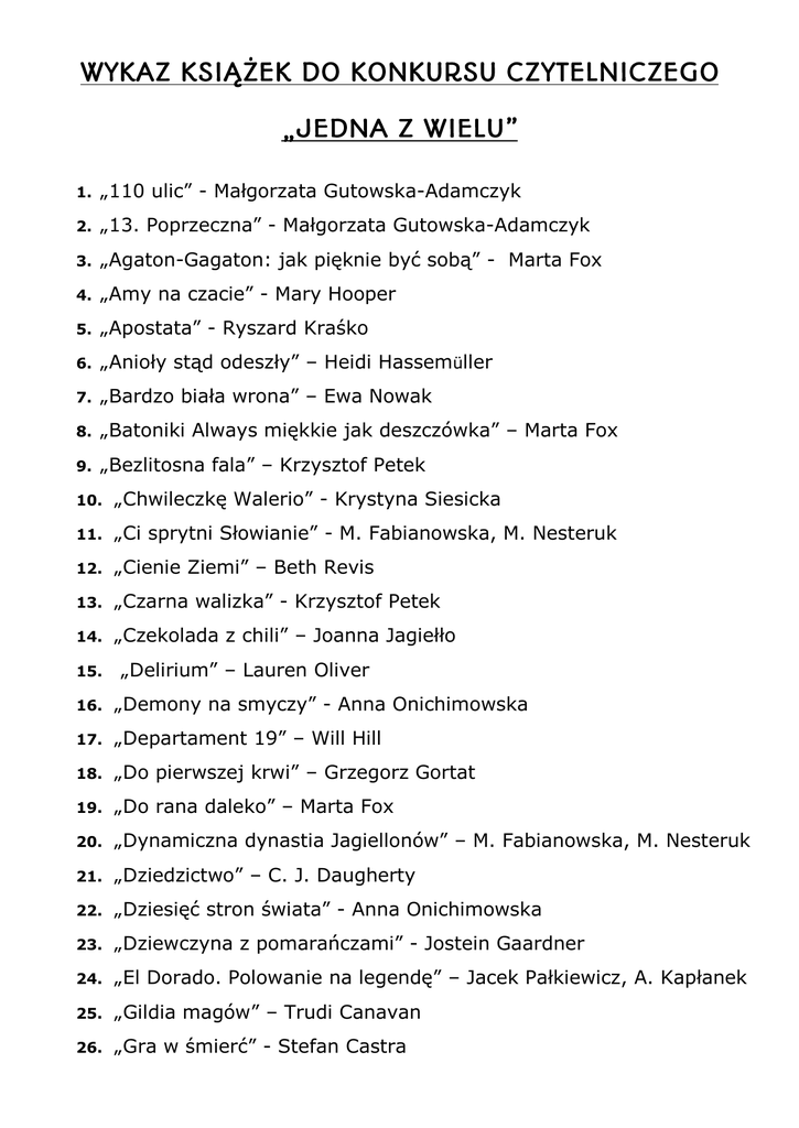 1. „110 ulic” - Małgorzata Gutowska-Adamczyk 2. „13. Poprzeczna” - Małgorzata Gutowska-Adamczyk 3. „Agaton-Gagaton: jak pięknie być sobą” - Marta Fox 4. „Amy na czacie” - Mary Hooper 5. „Apostata” - Ryszard Kraśko 6. „Anioły stąd odeszły” – Heidi Hassemüller 7. „Bardzo biała wrona” – Ewa Nowak 8. „Batoniki Always miękkie jak deszczówka” – Marta Fox 9. „Bezlitosna fala” – Krzysztof Petek 10. „Chwileczkę Walerio” - Krystyna Siesicka 11. „Ci sprytni Słowianie” - M. Fabianowska, M. Nesteruk 12. „Cienie Ziemi” – Beth Revis 13. „Czarna walizka” - Krzysztof Petek 14. „Czekolada z chili” – Joanna Jagiełło 15. „Delirium” – Lauren Oliver 16. „Demony na smyczy” - Anna Onichimowska 17. „Departament 19” – Will Hill 18. „Do pierwszej krwi” – Grzegorz Gortat 19. „Do rana daleko” – Marta Fox 20. „Dynamiczna dynastia Jagiellonów” – M. Fabianowska, M. Nesteruk 21. „Dziedzictwo” – C. J. Daugherty 22. „Dziesięć stron świata” - Anna Onichimowska 23. „Dziewczyna z pomarańczami” - Jostein Gaardner 24. „El Dorado. Polowanie na legendę” – Jacek Pałkiewicz, A. Kapłanek 25. „Gildia magów” – Trudi Canavan 26. „Gra w śmierć” - Stefan Castra 27. „Gra w trzy karty” - Krzysztof Petek 28. „Kamienna pułapka” – Krzysztof Petek 29. „Kamila” - Ewa Barańska 30. „Karolina XL. Zakochana” – Marta Fox 31. „Karolina XL” – Marta Fox 32. „Kaśka Podrywaczka” - Marta Fox 33. „Kawa z kardamonem” – Joanna Jagiełło 34. „Koty” - Juliet Clutton-Brock 35. „Kowboje” – David H. Murdoch 36. „Królowa Tearlingu” – Erika Johansen 37. „Kurier” - Robert Muchamore 38. „Liczenie słoni” - Elżbieta Isakiewicz 39. „Magda.doc” - Marta Fox 40. „Magia iluzji”- I. Baddiel, J. Zuber 41. „Maszyny latające” – Andrew Nahum 42. „Malowany człowiek”. Cz. 1 – Peter Brett 43. „Malowany człowiek”. Cz. 2 – Peter Brett 44. „Milion słońc” – Beth Revis 45. „Mów!” - Laurie Halse Anderson 46. „Musisz to komuś powiedzieć” – Barbara Ciwoniuk 47. „Niechciana” – Barbara Kosmowska 48. „Nikomu ani słowa” – Jana Frey 49. „Nowa Ziemia” – Julianna Bagggot 50. „Nowicjuszka” – Trudi Canavan 51. „Ostatnia zagadka” - Krzysztof Petek 52. „Password” – Mirjam Mous 53. „Paulina.doc” - Marta Fox 54. „Paulina w orbicie kotów” - Marta Fox 55. 56. „Piraci” – Richard Platt „Po nitkach babiego lata” - Marta Fox 57. „Pokopany Mundial 2006” - Michael Coleman 58. „Pokrętni Piastowie” - M. Fabianowska, M. Nesteruk 59. „Powrót z piekła” - Alfred Hitchcock 60. „Próba ognia” - Jack Higgins, Justin Richards 61. “Próby ognia” – James Dashner 62. „Przygodą jest każdy dzień” - Ewa Przybylska 63. „Psy” – Juliet Clutton-Brock 64. „Romeo zjawi się potem” - Marta Fox 65. „Rupieciarnia na końcu świata” – Agata Młyńczyk 66. „Rycerze” – Christopher Gravett 67. „Samochody” – Richard Sutton 68. „Samotne wyspy i storczyk” – Anna Onichimowska 69. „Sekundnik” – Barbara Stenka 70. „Sfaulowany futbol” - Michael Coleman 71. „Spadaj, mięczaku!” - Ann Ladiges 72. „Sport” – Tim Hammond 73. „Stan podgorączkowy” – Grażyna Bąkiewicz 74. „Statki, które mijają się nocą” - Zofia Chądzyńska 75. „Stroje” – L. Rowland-Warne 76. „Szalone życie Rudolfa” - Joanna Fabicka 77. „Szare śniegi Syberii” – Ruta Seperys 78. „Szczury i wilki” – Grzegorz Gortat 79. „Świat do góry nogami” - Beata Ostrowicka 80. „Tajemnica deszczowej nocy” - Krzysztof Petek 81. „Tajemnicza wyprawa Tomka” - Alfred Szklarski 82. „Tam, gdzie spadają anioły” – Dorota Tyrakowska 83. „Tomek na Czarnym Lądzie” - Alfred Szklarski 84. „Tomek na wojennej ścieżce” - Alfred Szklarski 85. „Trudne powroty” - Anna Onichimowska 86. „Trzeci świat Mateusza” - Ewa Przybylska 87. „Uczeń skrytobójcy” – Robin Hoob 88. „W otchłani” – Beth Revis 89. „Westchnienia jak morskie huragany” - Marta Fox 90. „Wielki mistrz” – Trudi Canavan 91. „Więc nie wiń mnie za to” - Marta Fox 92. „Więzień labiryntu” – James Dashner 93. „Więzy krwi” –Sophie McKenzie 94. „Własny pokój” – Barbara Ciwoniuk 95. „Wybrani” – C. J. Daugherty 96. „Wystarczy, że jesteś” - Małgorzata Gutowska-Adamczyk 97. „Wywrotka” – Kazimierz Szymeczko 98. „Za wszelką cenę” – Marcus Schowe 99. „Zagrożeni” – C. J. Daugherty 100. „Zamiana” 101. „Zanim – R. L. Stine nadejdzie rozstanie” - Marta Fox 102. „Zwiadowcy”. Cz. 2 „Płonący most” – John Flanagan 103. „Zwiadowcy”. Cz. 3 „Ziemia skuta lodem” – John Flanagan 104. „Zwiadowcy”. Cz. 4 „Bitwa o Skandię” – John Flanagan 105. „Żegnaj na zawsze” - Anna Onichimowska