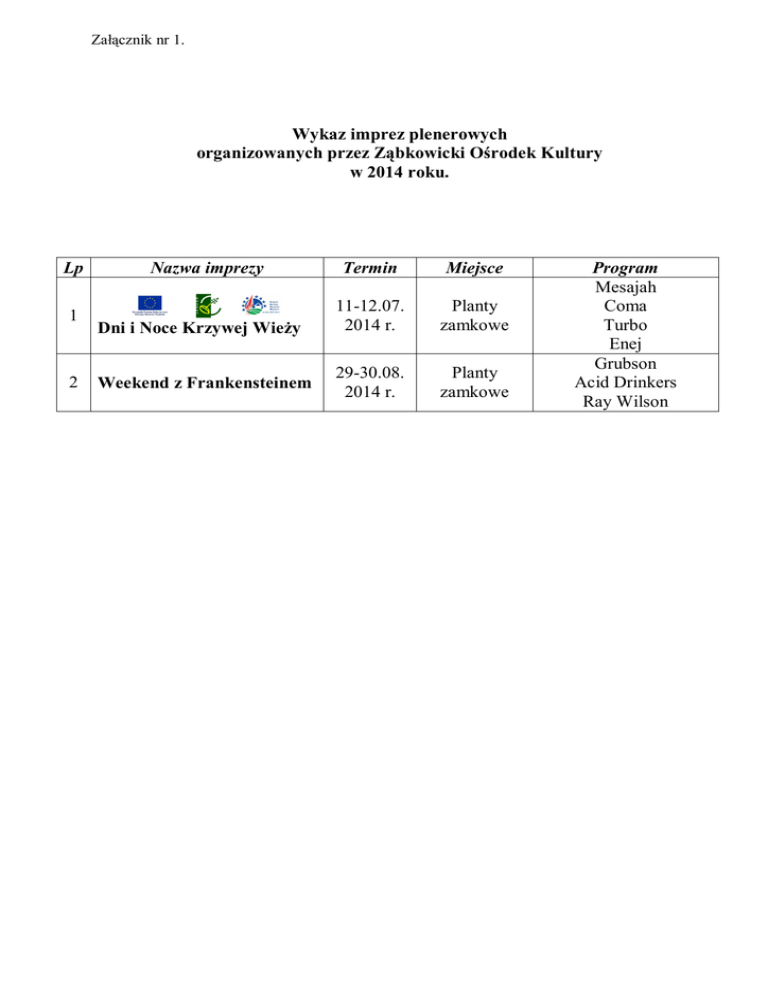 Załącznik nr 1. Wykaz imprez plenerowych organizowanych przez Ząbkowicki Ośrodek Kultury w 2014 roku. Lp 1 2 Nazwa imprezy Dni i Noce Krzywej Wieży Weekend z Frankensteinem Termin Miejsce 11-12.07. 2014 r. Planty zamkowe 29-30.08. 2014 r. Planty zamkowe Program Mesajah Coma Turbo Enej Grubson Acid Drinkers Ray Wilson