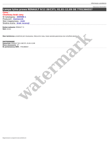 Informacje o produkcie Utworzono 04-03-2017 Lampa tylna prawa RENAULT 9/11 (B/C37), 01.81-12.89 OE 7701366557 Cena : Chwilowy brak ceny Nr katalogowy : 600988-1 Producent : Zamiennik Stan magazynowy : niski Średnia ocena : brak recenzji Rodzaj nadwozia: RENAULT 11 Opis: prawa er m ar k Stan techniczny: przedmiot jest nieużywany, fabrycznie nowy, towar posiada gwarancję oraz certyfikat jakości. w at ZASTOSOWANIE Samochód: RENAULT 9/11 (B/C37), 01.81-12.89 Okres stosowania: .87Nr porównawczy OEM: 7701366557 Wygenerowano w programie www.oscGold.com