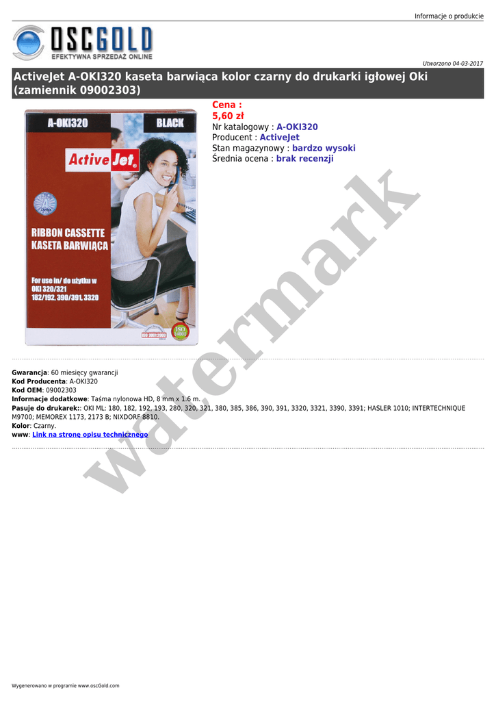 Informacje o produkcie Utworzono 04-03-2017 ActiveJet A-OKI320 kaseta barwiąca kolor czarny do drukarki igłowej Oki (zamiennik 09002303) Cena : 5,60 zł er m ar k Nr katalogowy : A-OKI320 Producent : ActiveJet Stan magazynowy : bardzo wysoki Średnia ocena : brak recenzji w at Gwarancja: 60 miesięcy gwarancji Kod Producenta: A-OKI320 Kod OEM: 09002303 Informacje dodatkowe: Taśma nylonowa HD, 8 mm x 1.6 m. Pasuje do drukarek:: OKI ML: 180, 182, 192, 193, 280, 320, 321, 380, 385, 386, 390, 391, 3320, 3321, 3390, 3391; HASLER 1010; INTERTECHNIQUE M9700; MEMOREX 1173, 2173 B; NIXDORF 8810. Kolor: Czarny. www: Link na stronę opisu technicznego Wygenerowano w programie www.oscGold.com